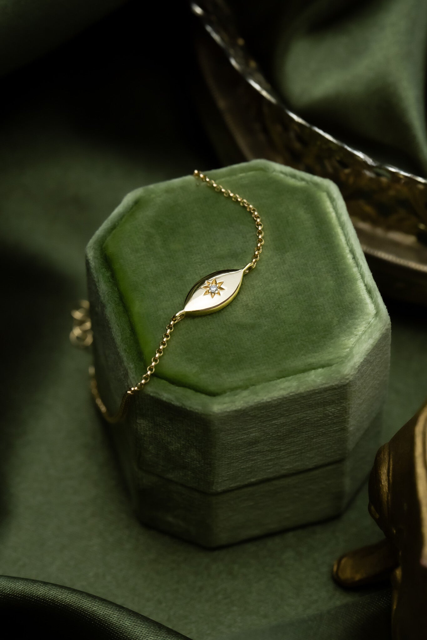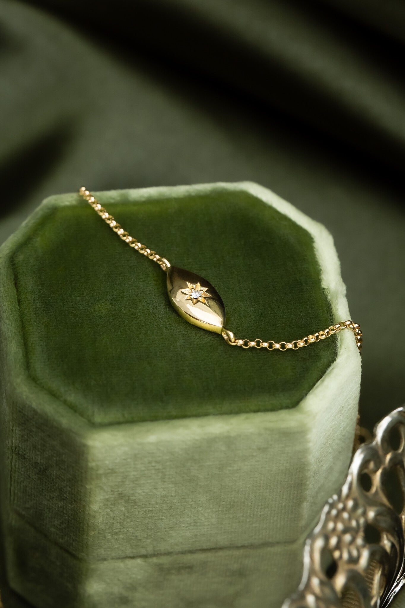 This 14k gold bracelet features a marquise pendant with a .01 ct round diamond set in the center with a star etching around the stone. Available in yellow and white gold.