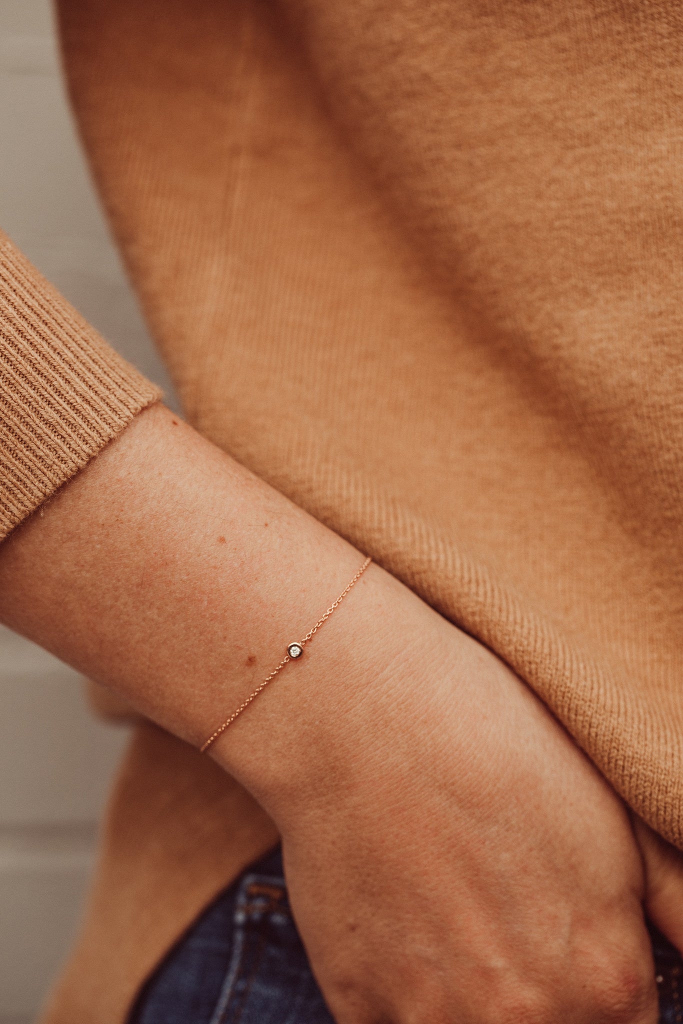 This 14k gold bracelet has a .03 ct round diamond set in a bezel on chain with an adjustable bolo closure.