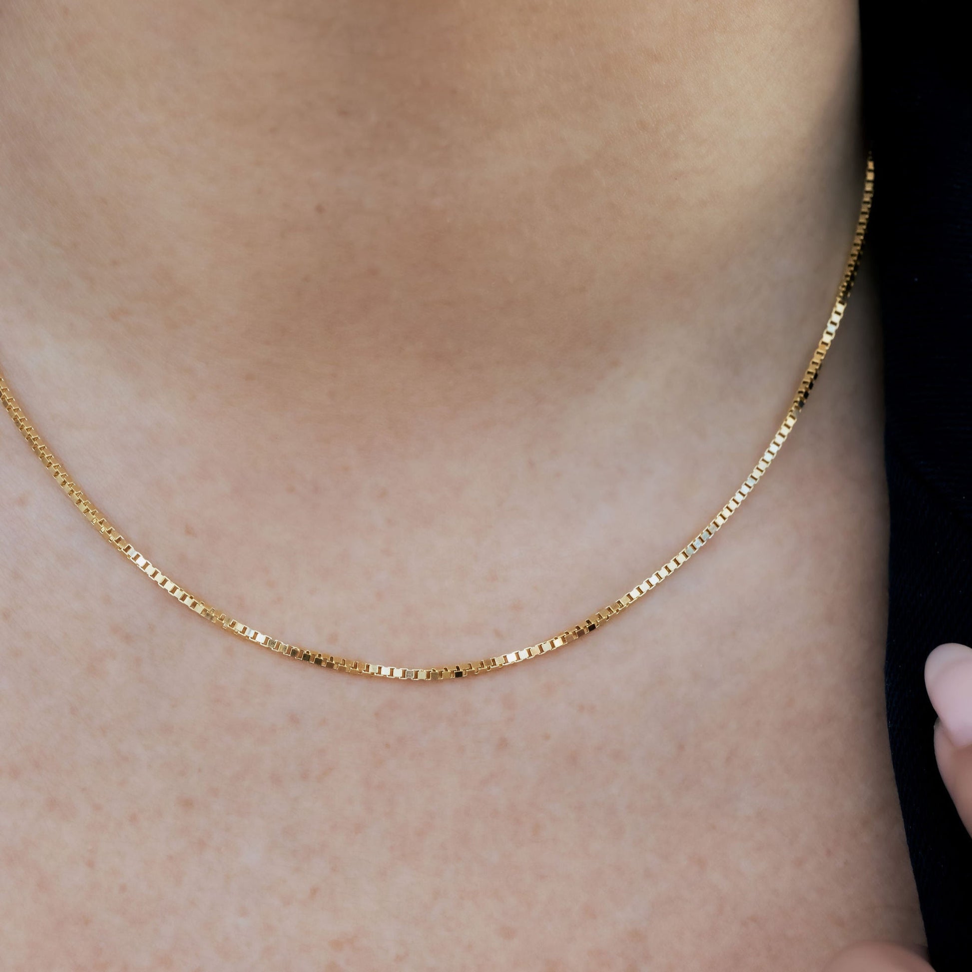 This 14k gold necklace features a box chain design in a 1.2 mm width.