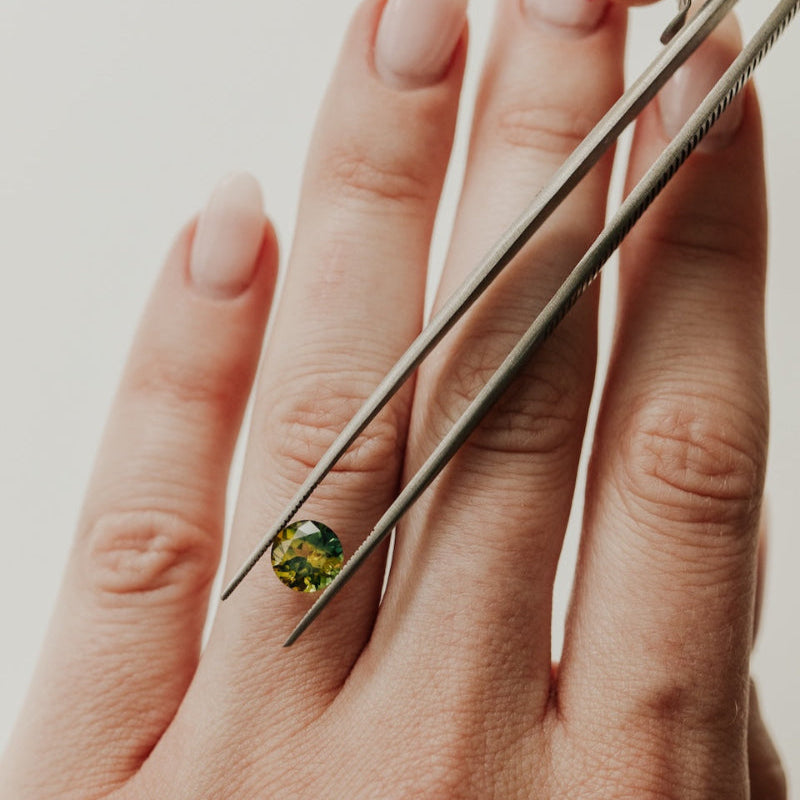Select your favorite design style and metal color to create a unique ring featuring this one-of-a-kind 1.71 ct round parti gold blue Australian sapphire.