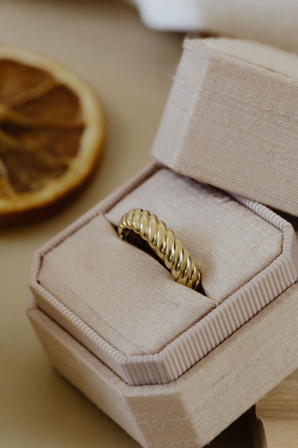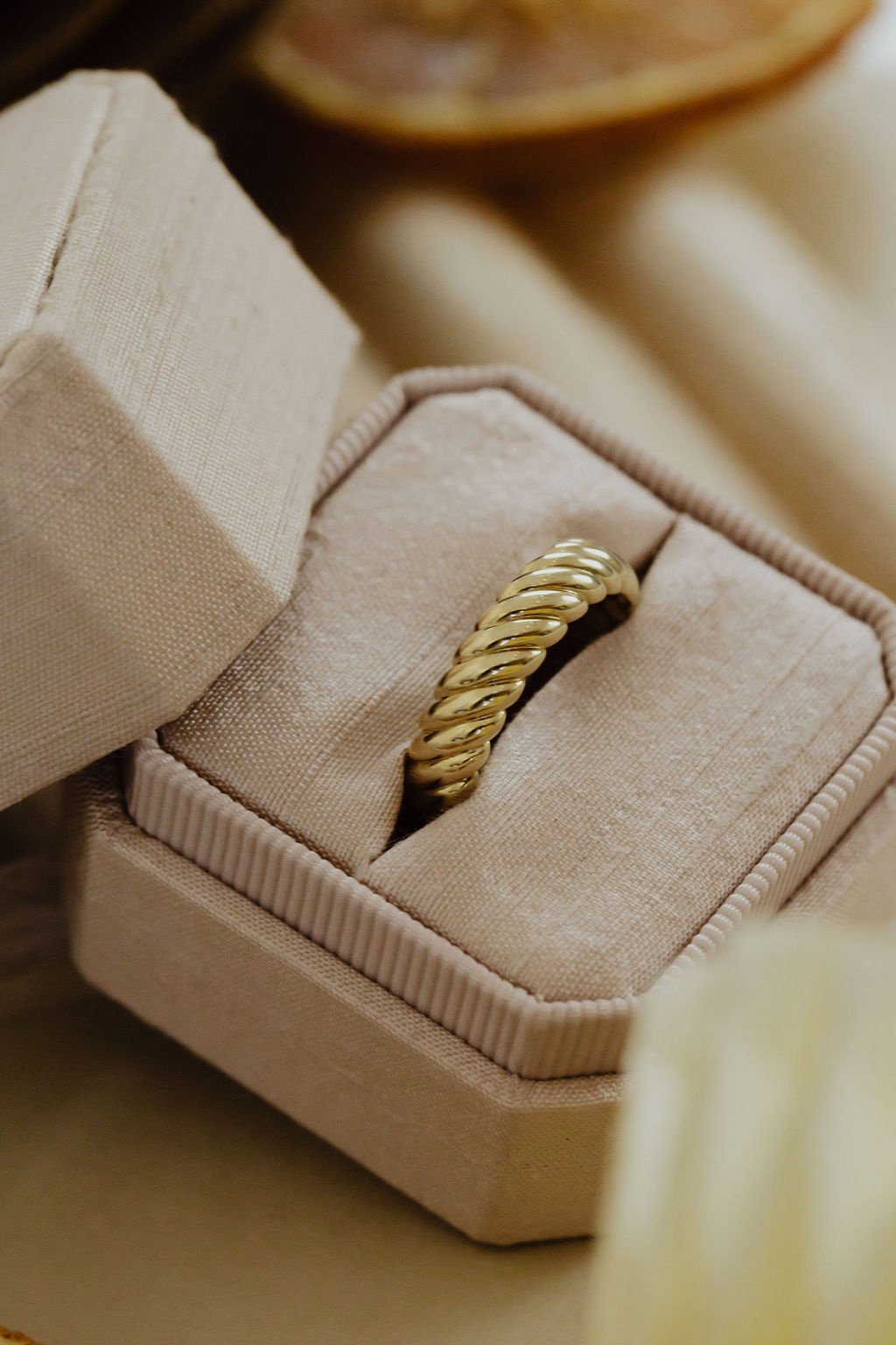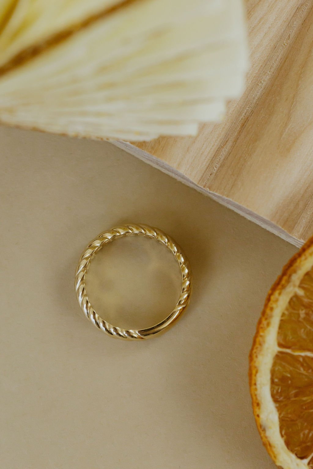 This 14k yellow gold 5mm band features a rope pattern and sizing bar.