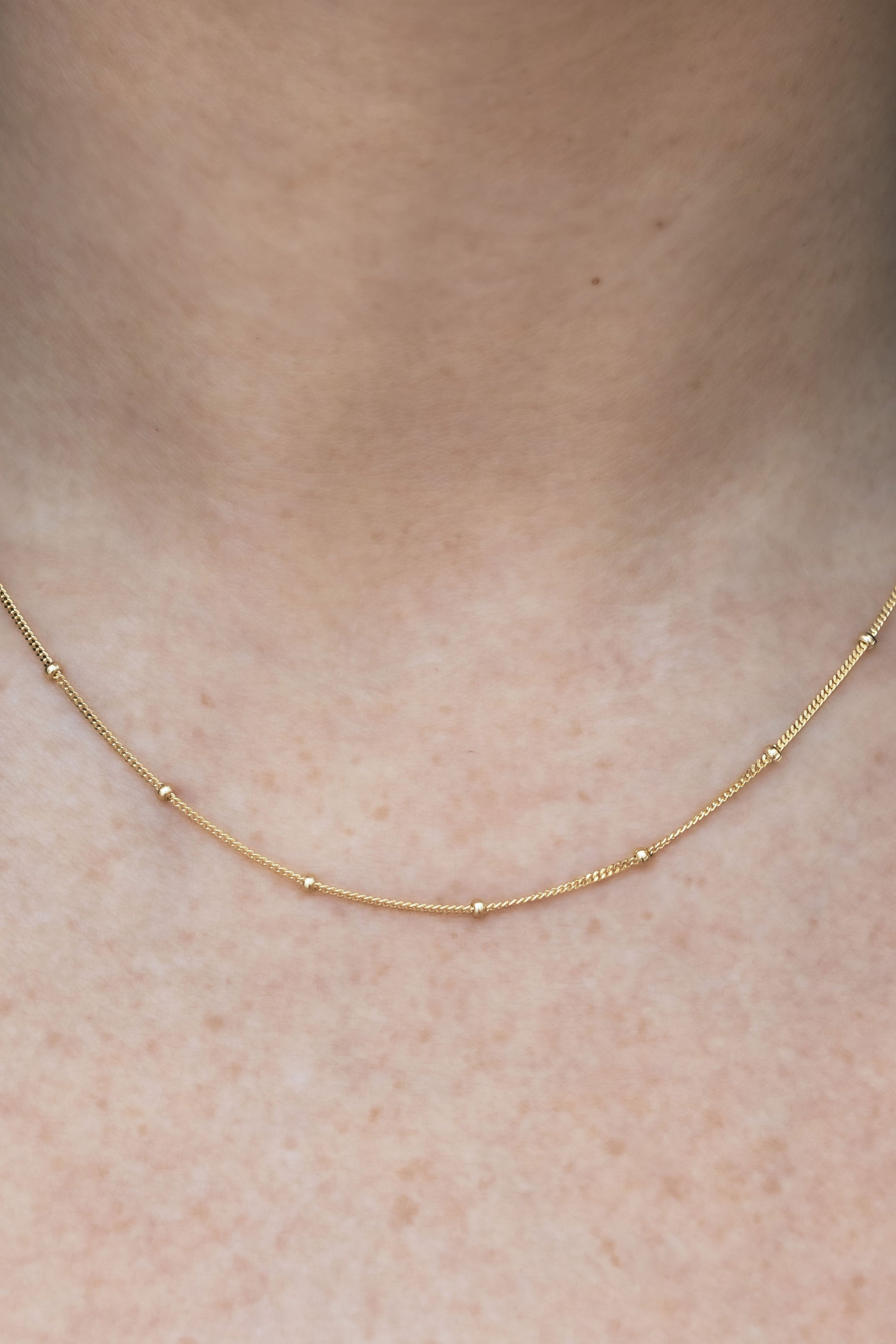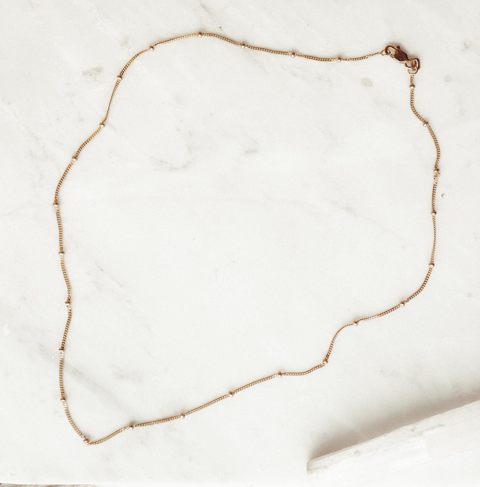 This 14k yellow gold chain necklace has tiny gold balls spaced out across the chain. It comes in two length options (16" or 18") and is available in yellow gold only.