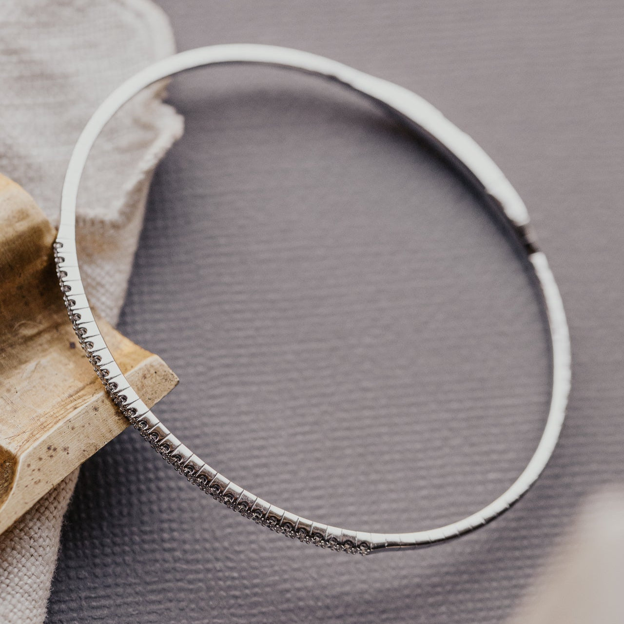 This 14k gold bracelet features .30 cttw round diamonds that go half way around the flexible bangle design.
