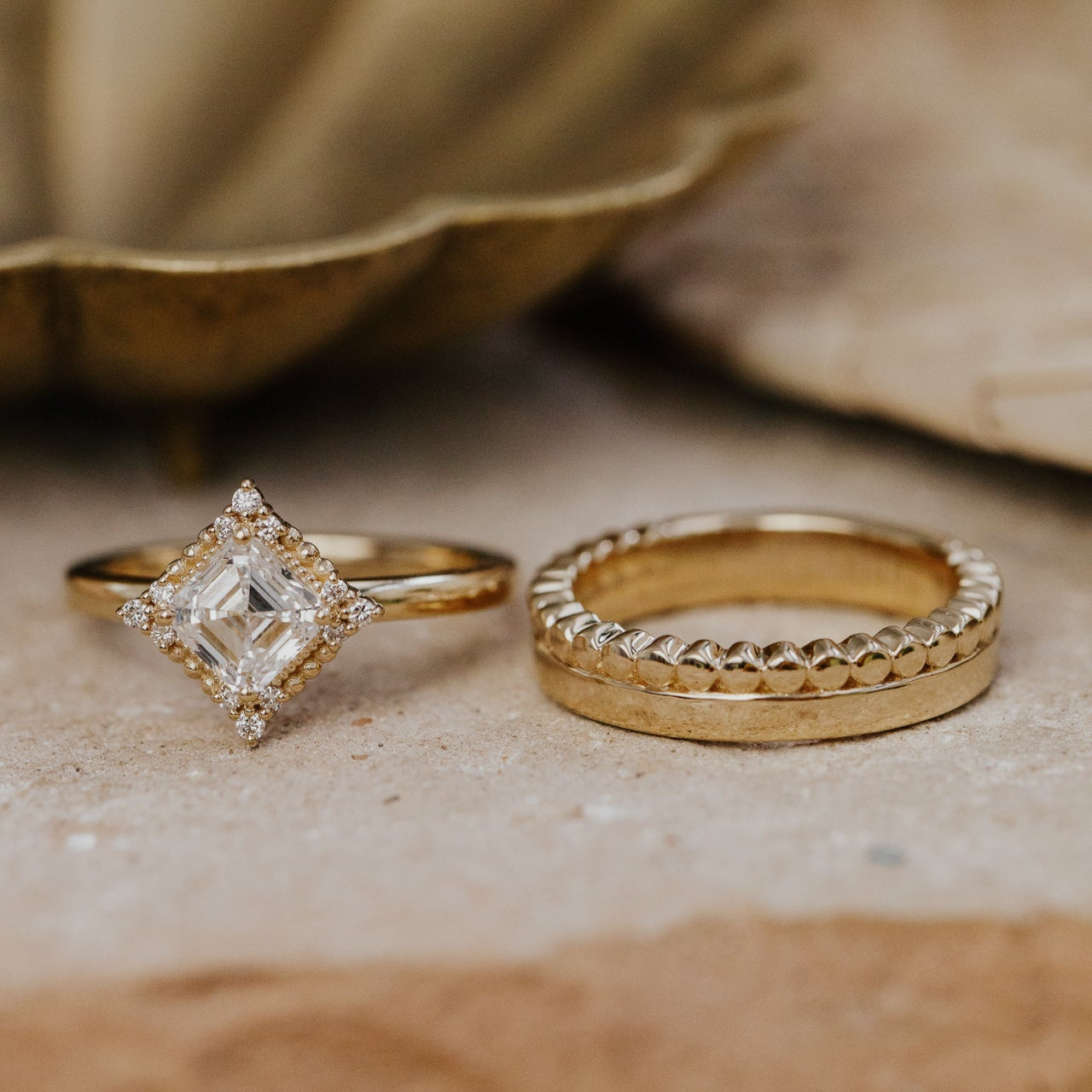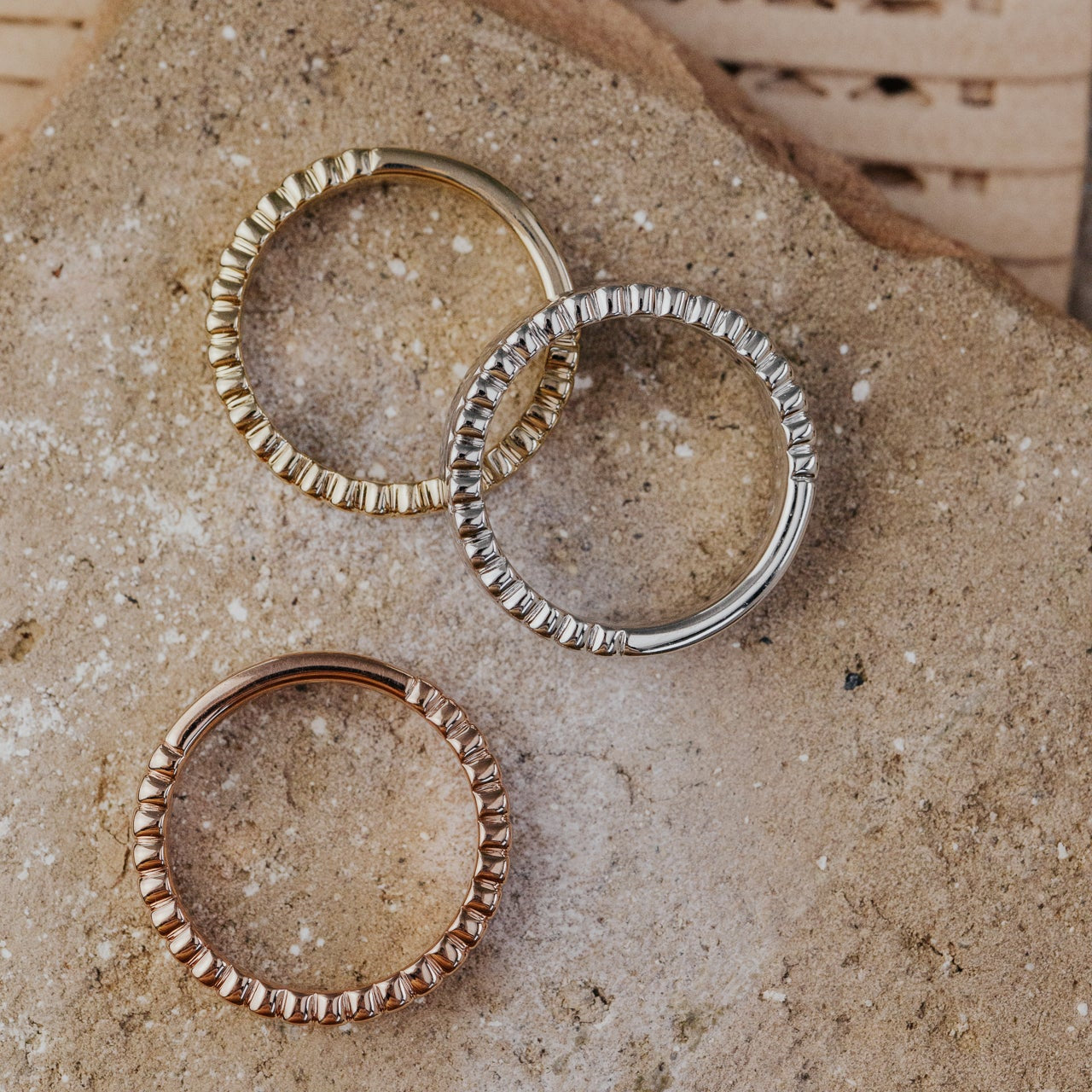 The Aurora Band features a beaded textured pattern on a flat gold band.