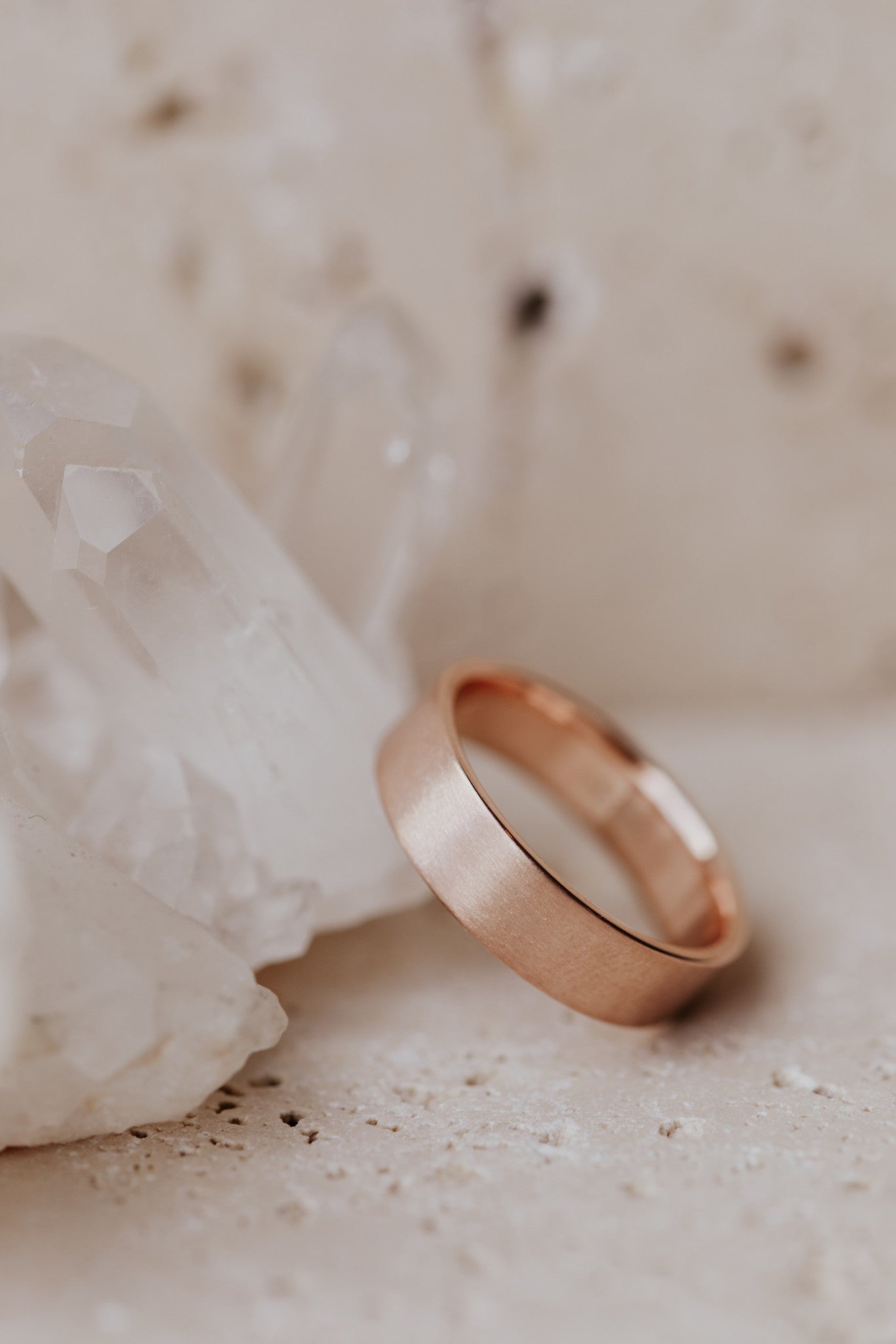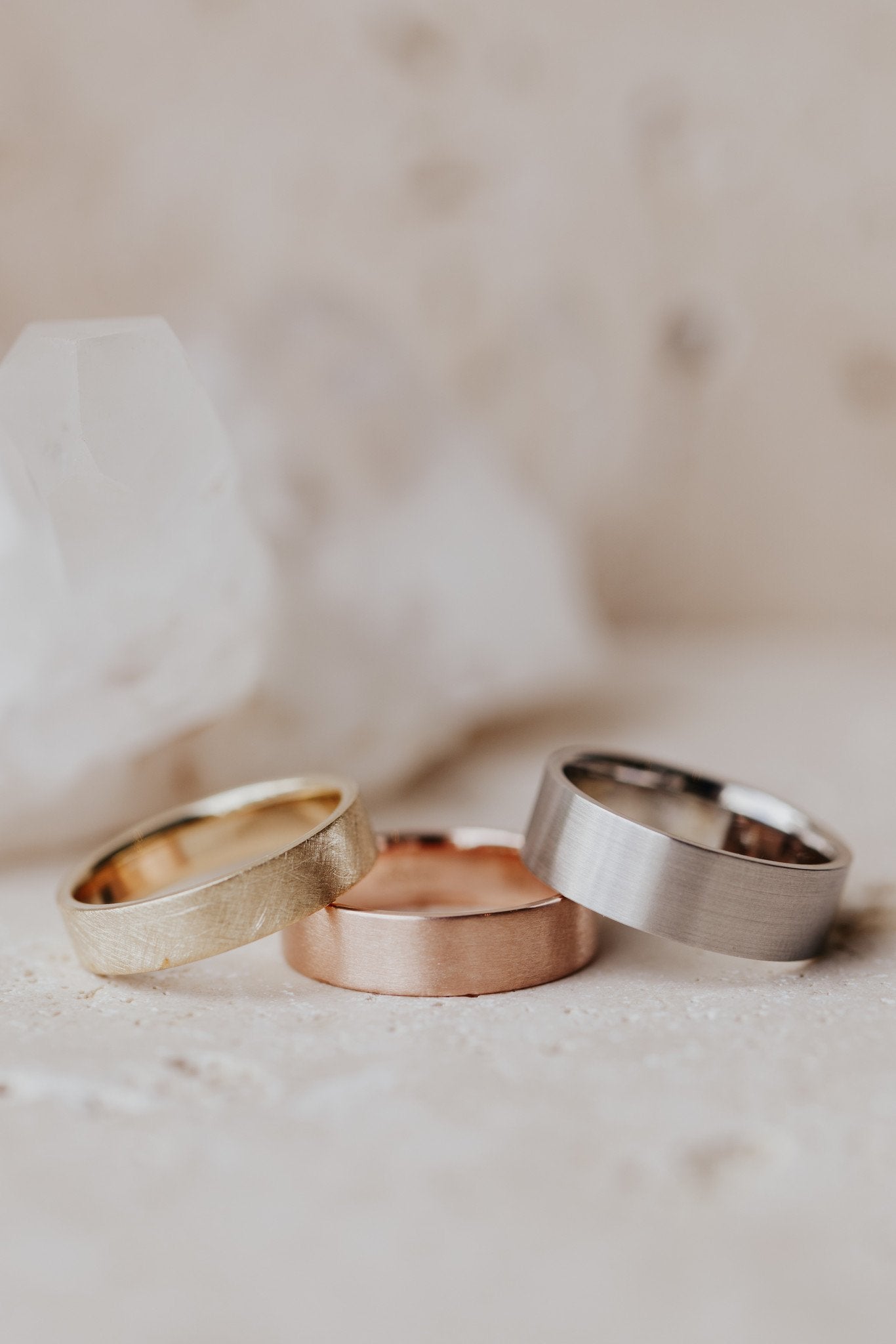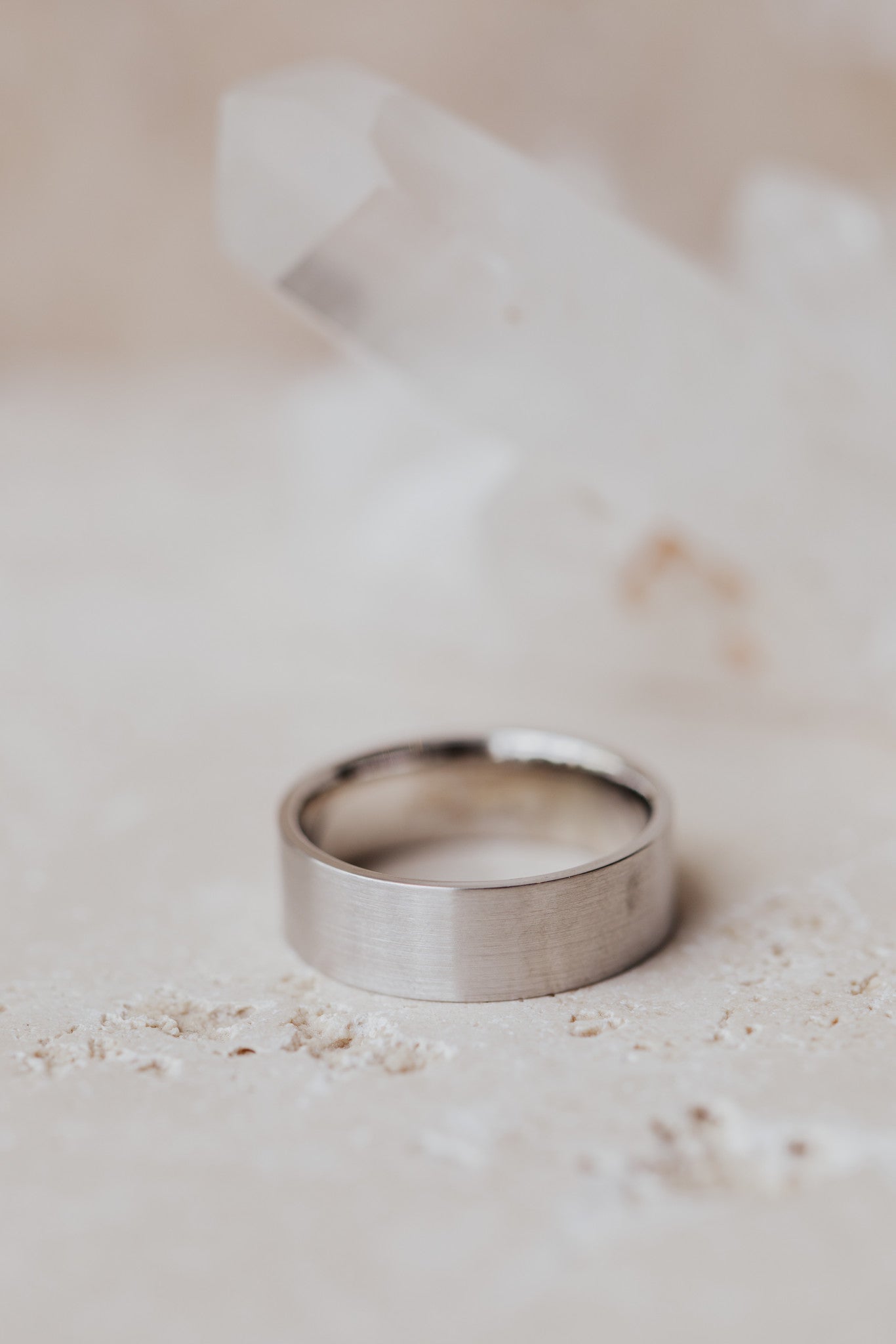 The Carter Flat Band features a comfort fit interior and is available in various metal colors, widths, and finishes.