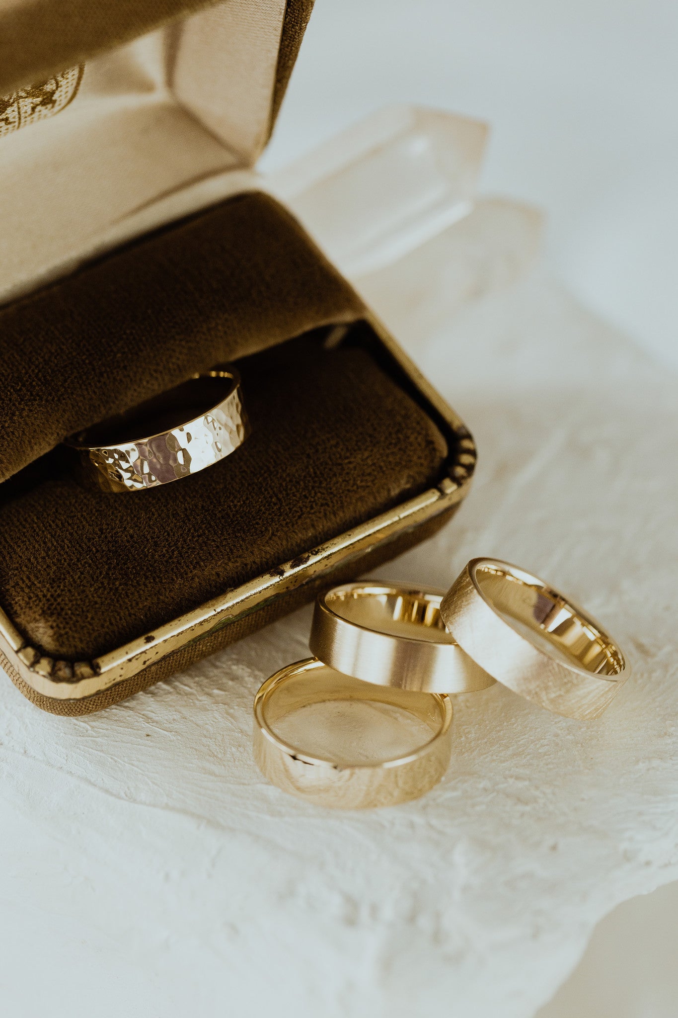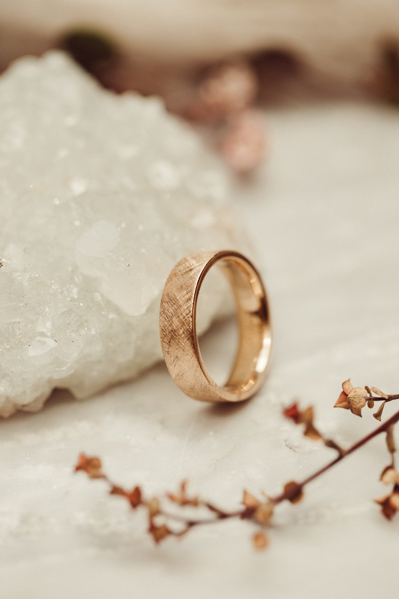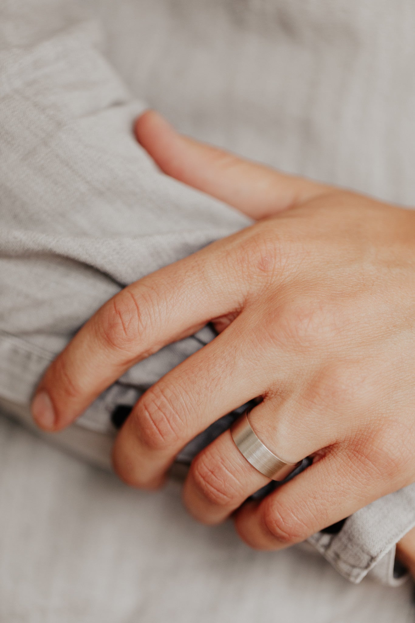The Carter Flat Band features a comfort fit interior and is available in various metal colors, widths, and finishes.
