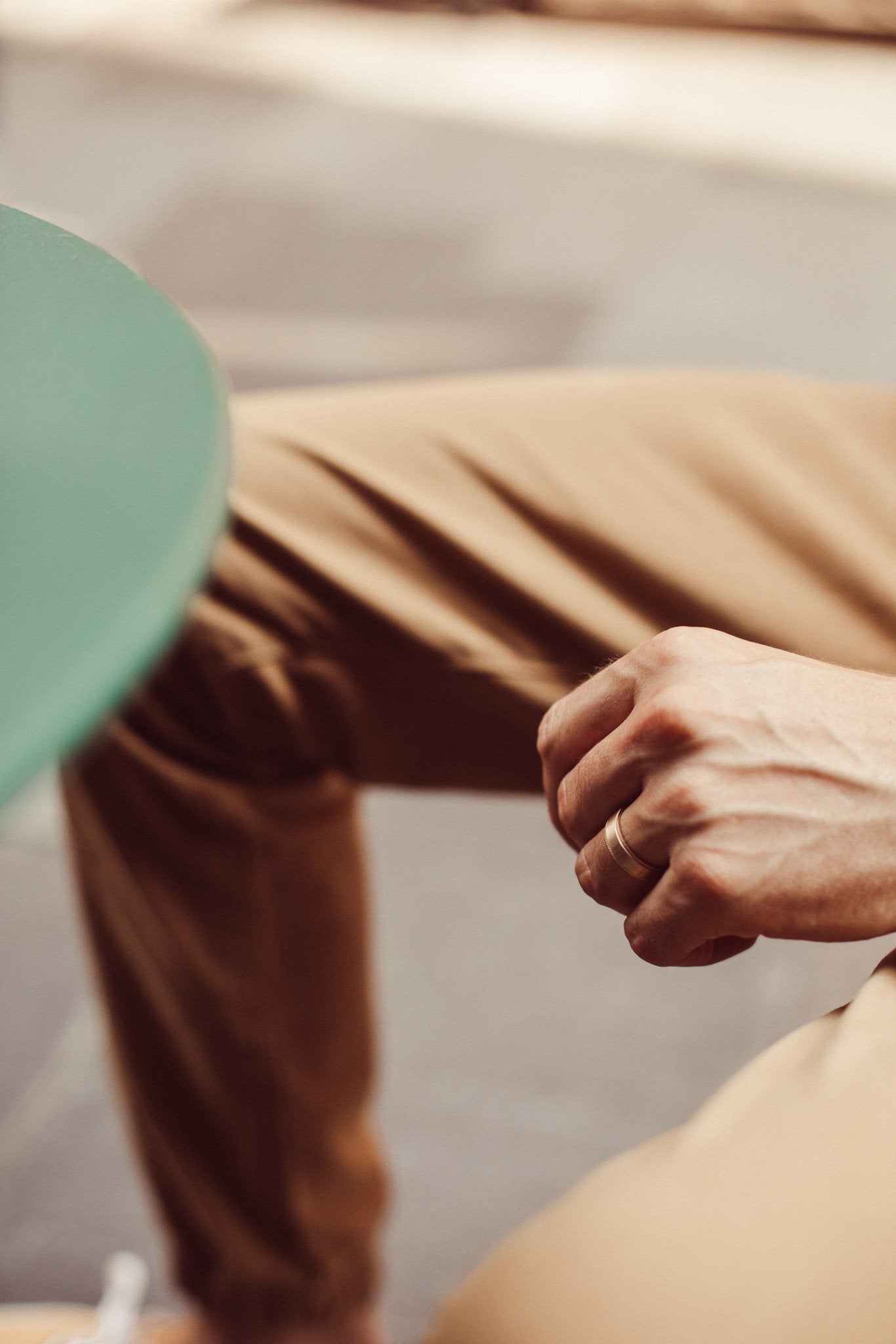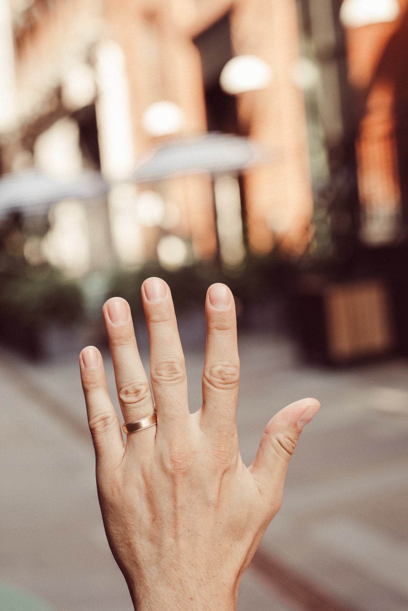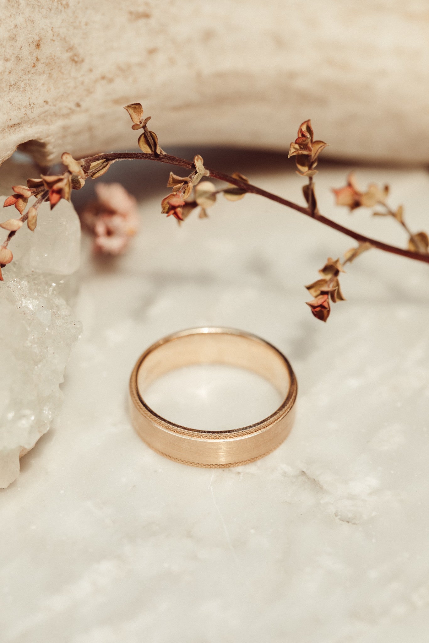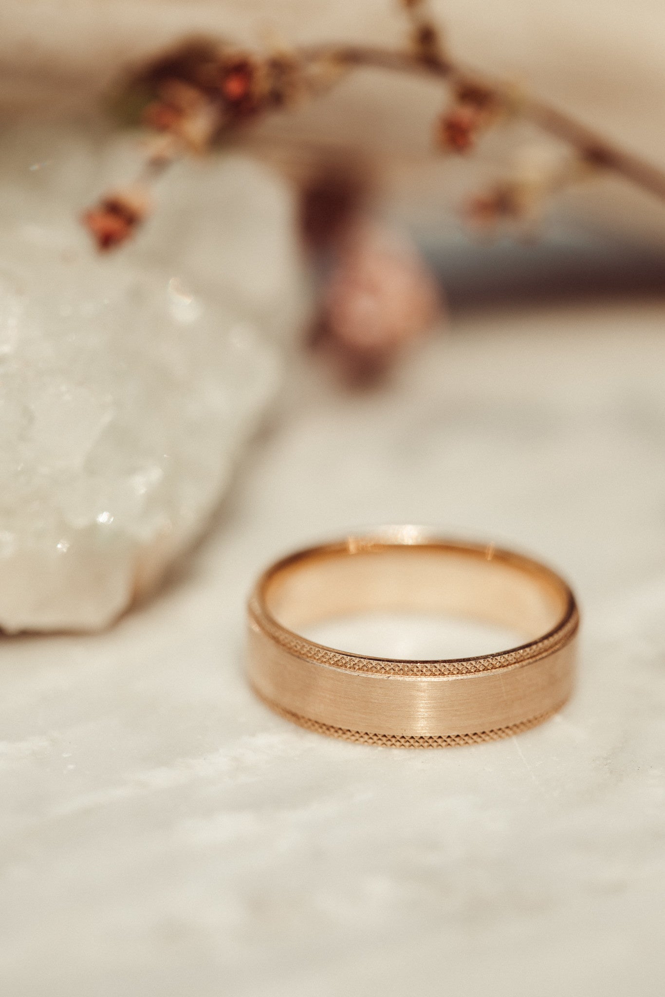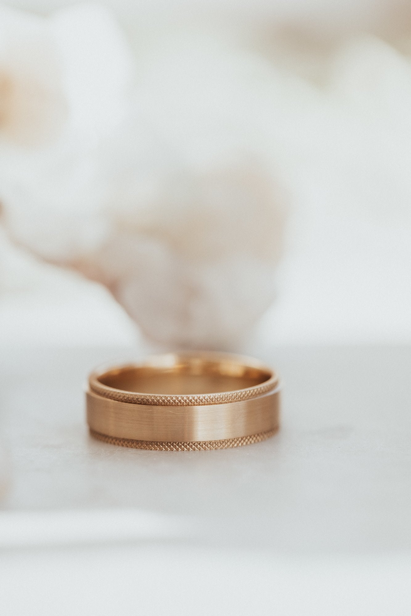 The Hayden Textured Edges Band is available in a 6mm width with a brushed center and a unique texture.