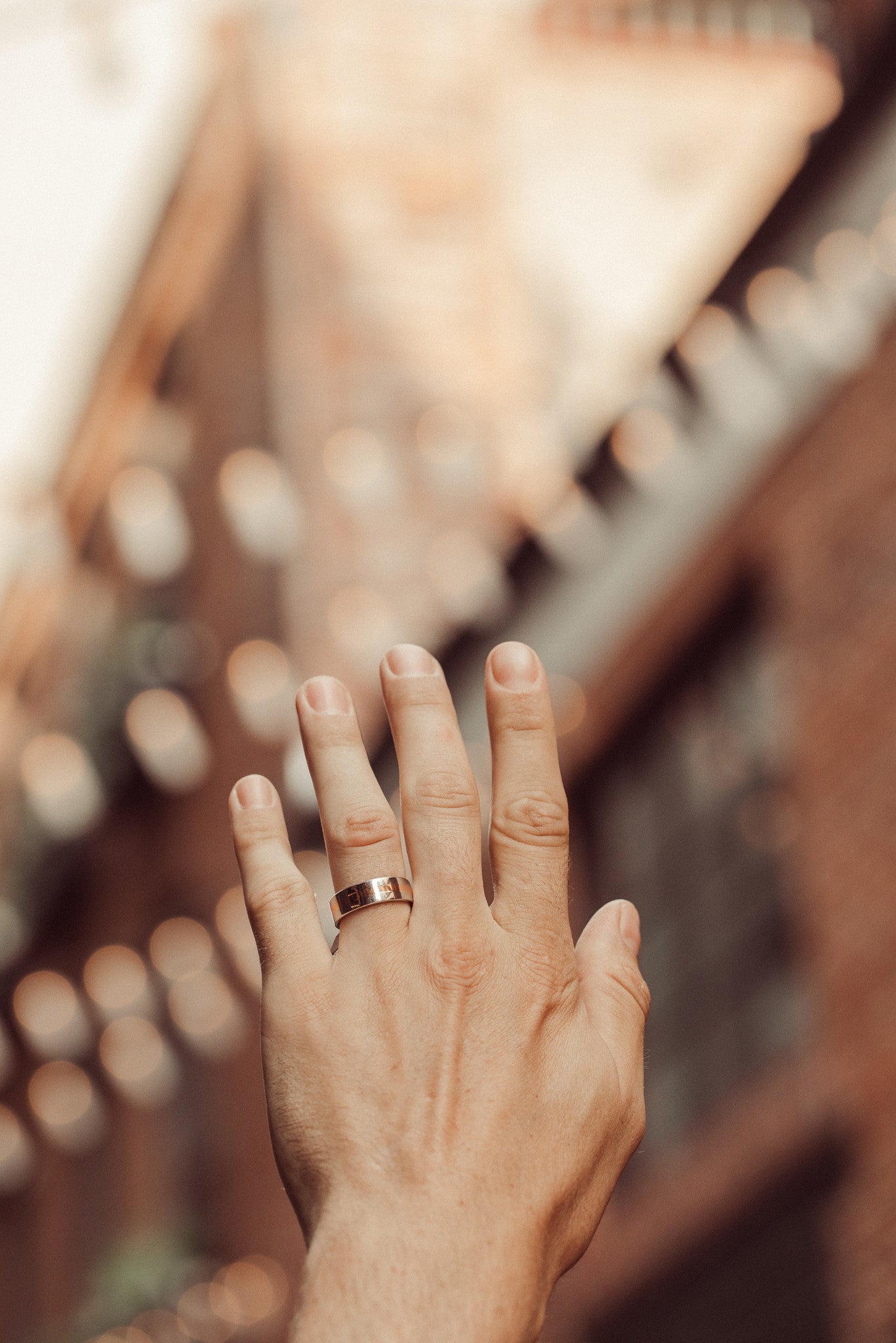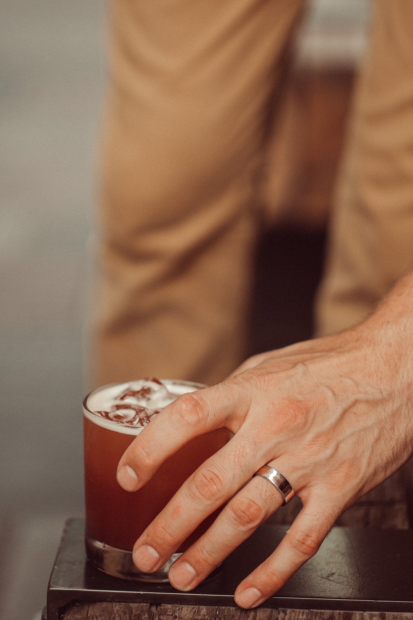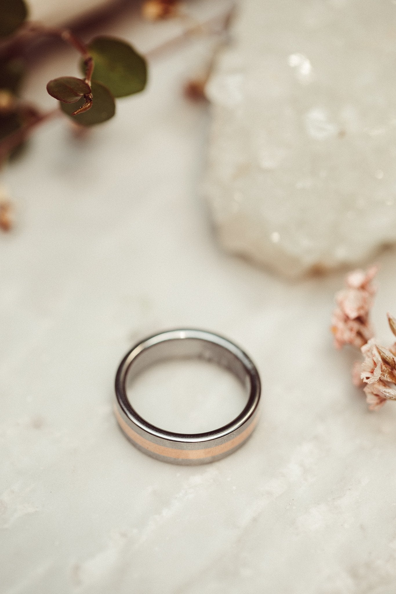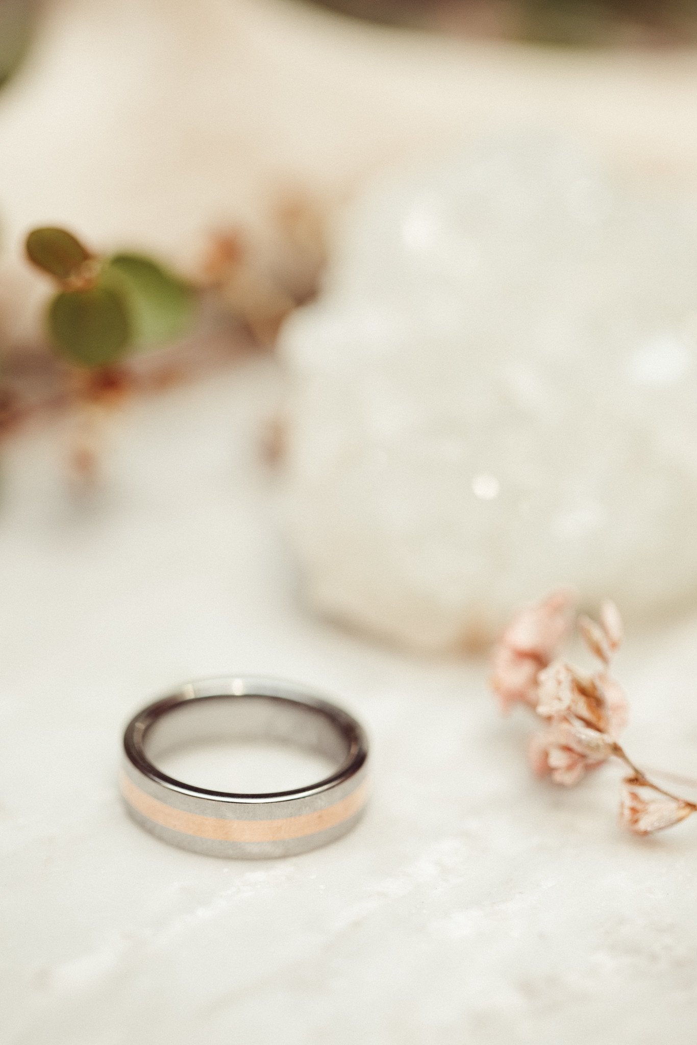The Jayce Cobalt Stripe Band features a flat side profile and has a 14k gold stripe through the middle of the band. This cobalt band is lightweight and hypoallergenic and has a platinum color.