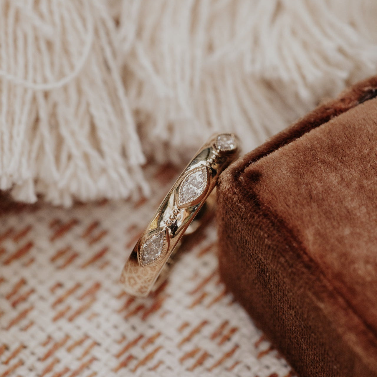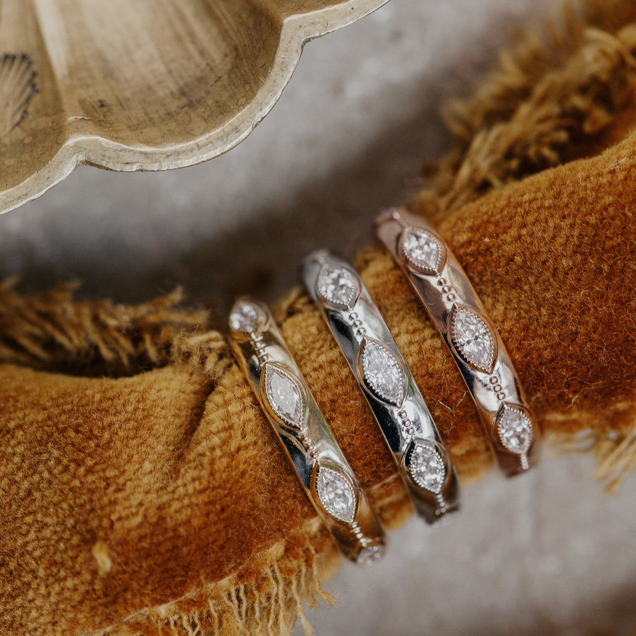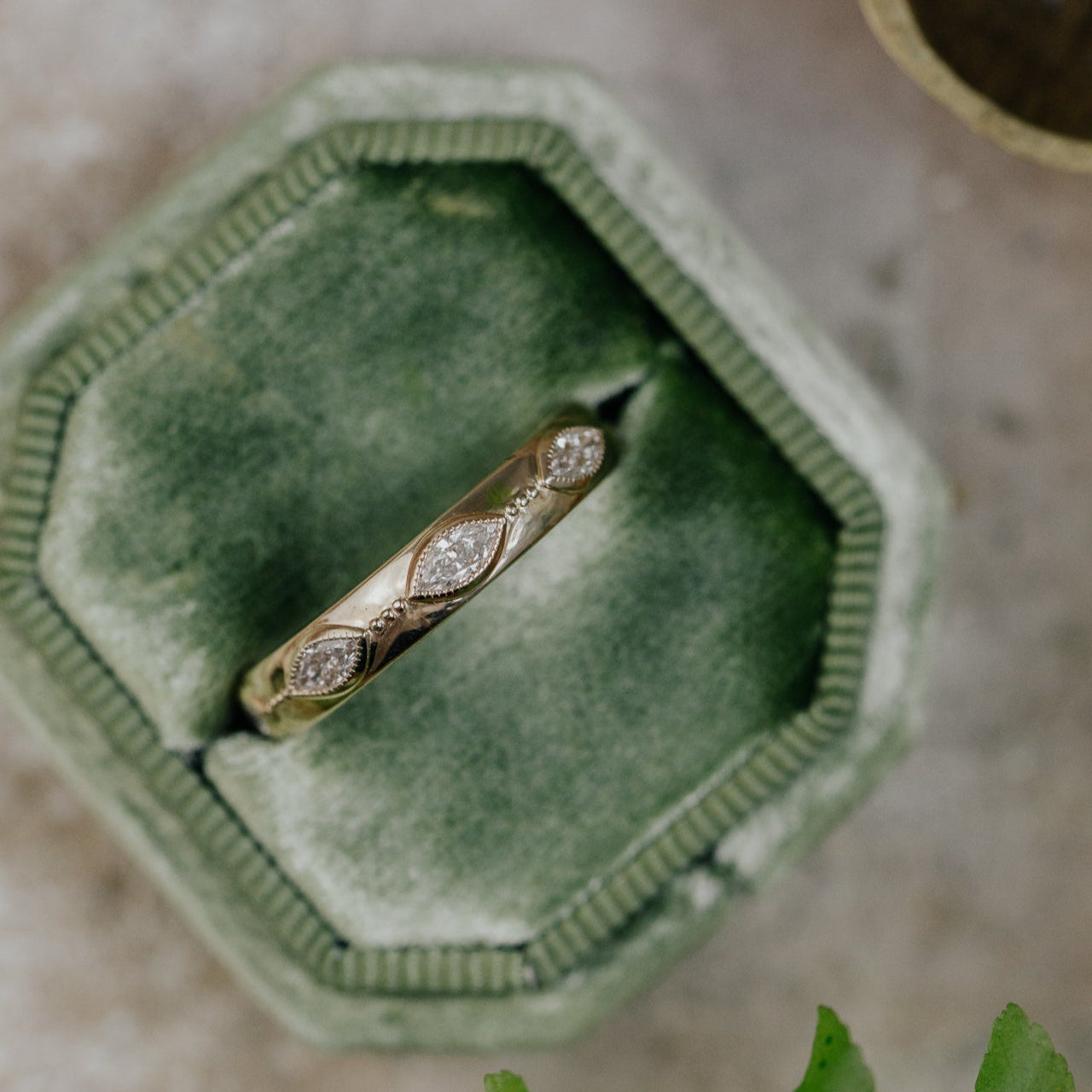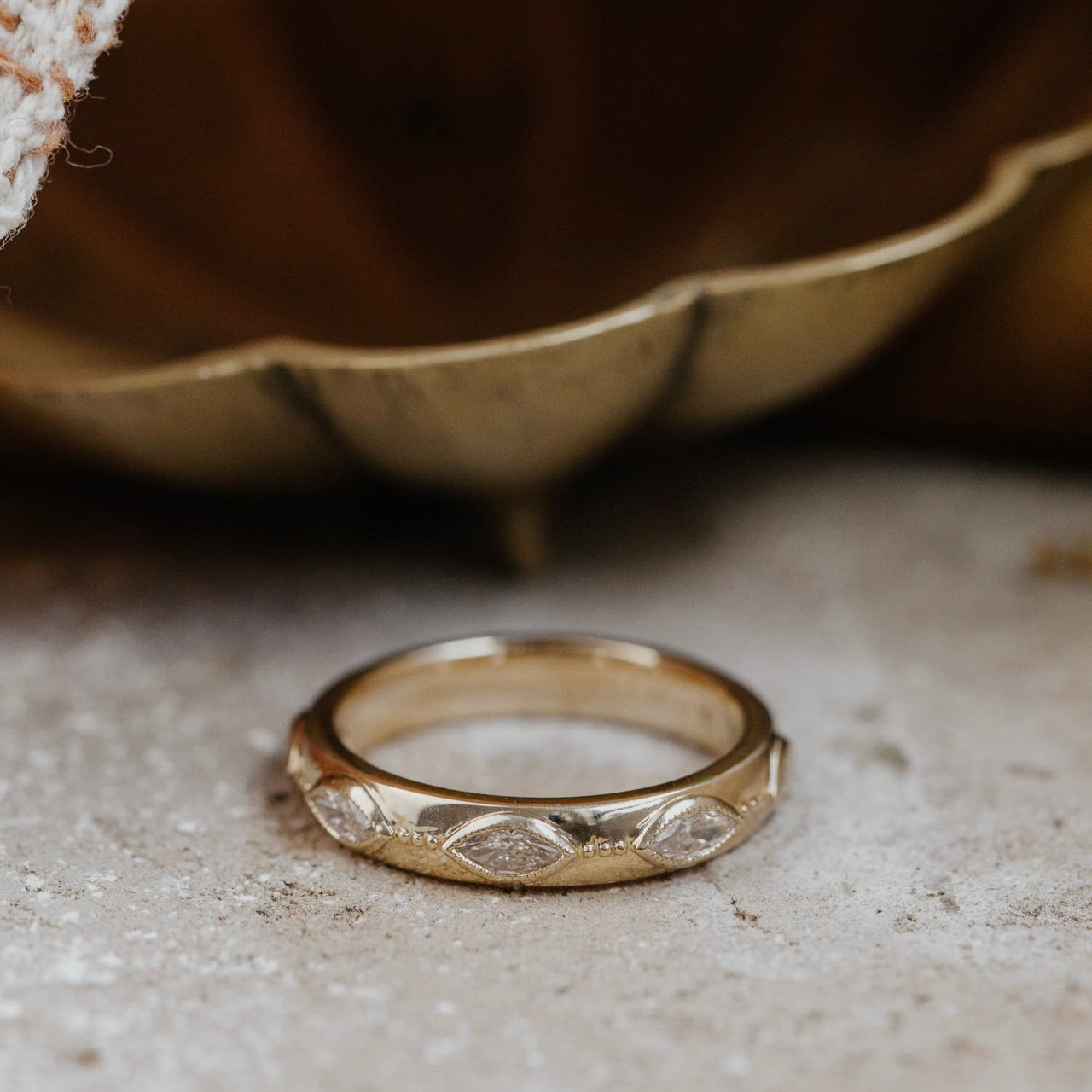 The Maravilla Band features ~.50 cttw marquise diamonds set in a bezel with milgrain details on a rounded gold band.