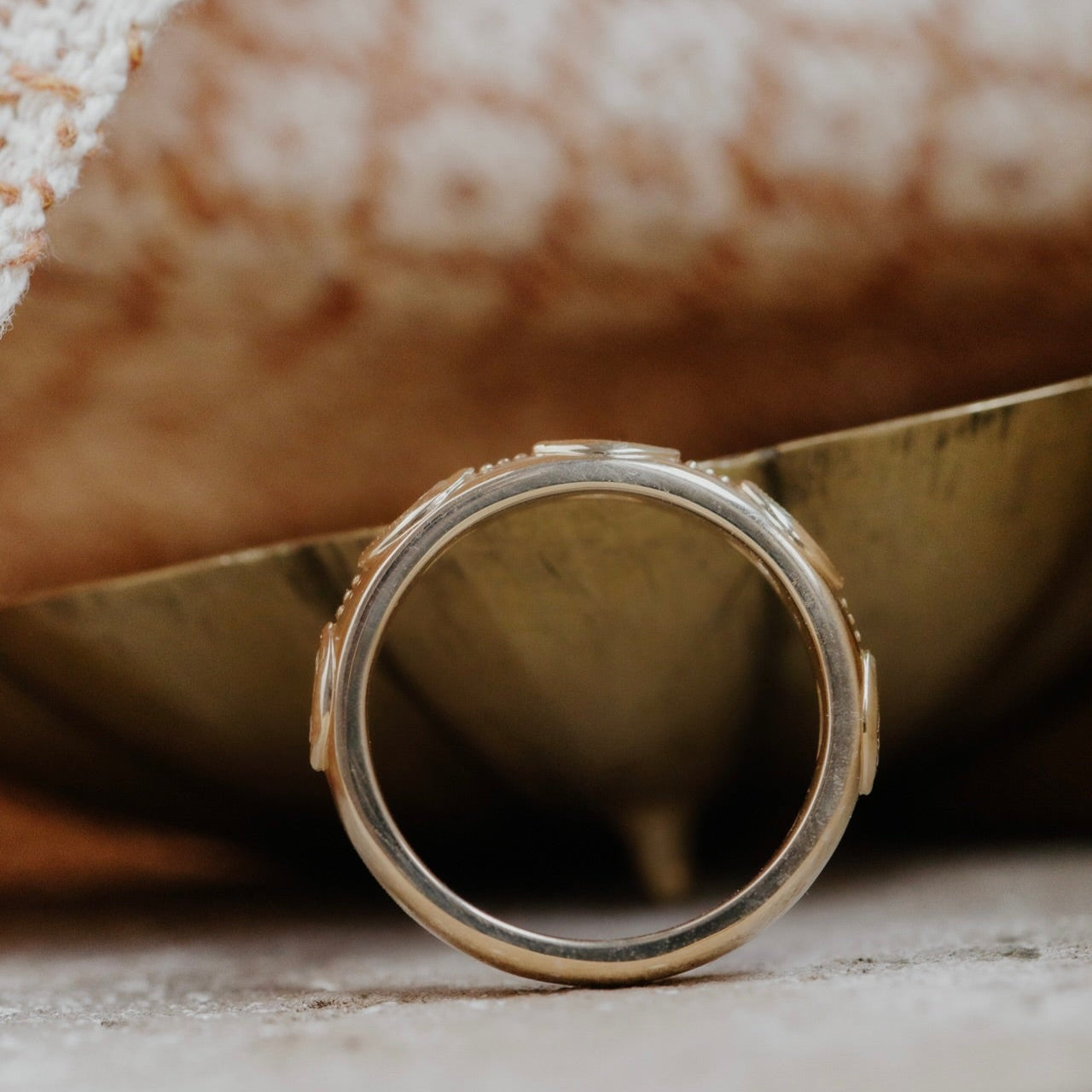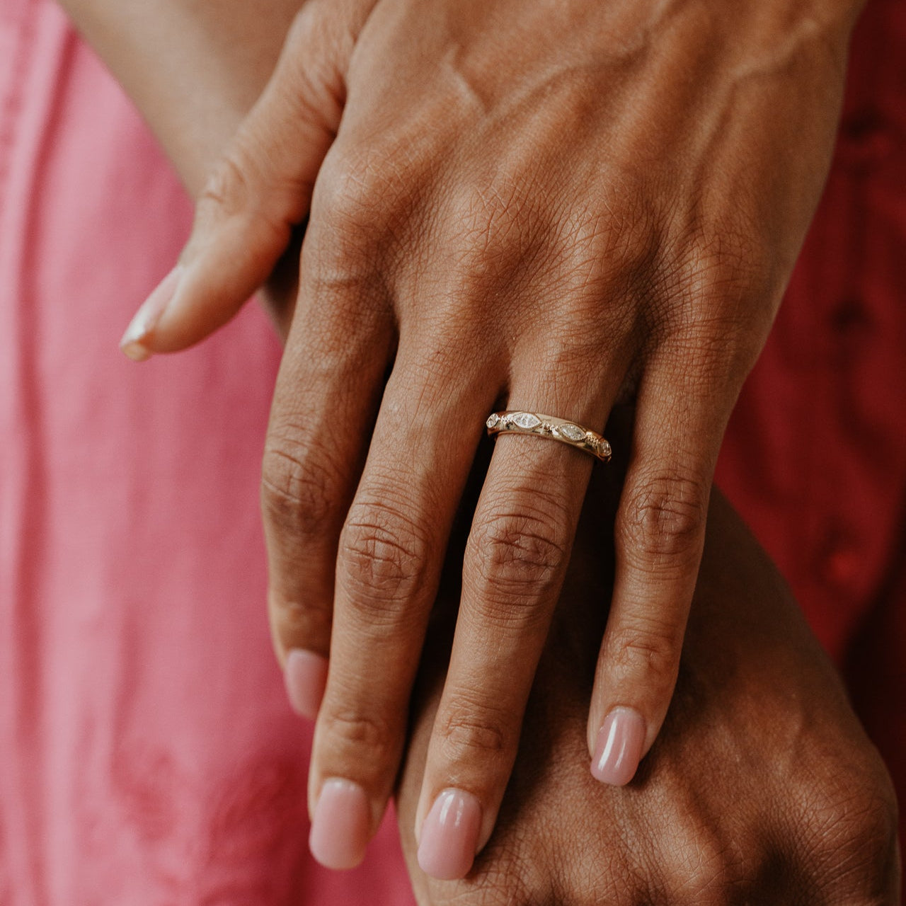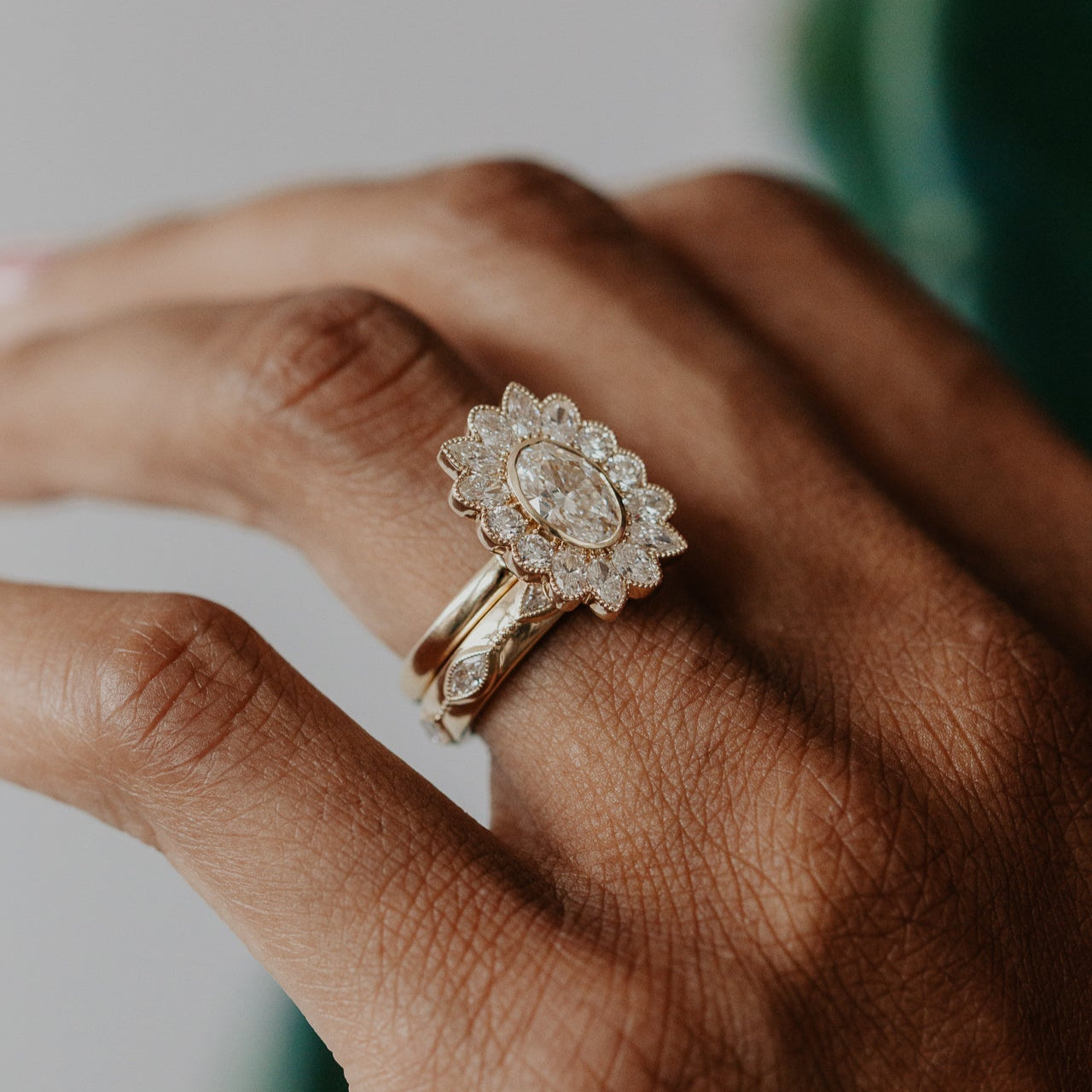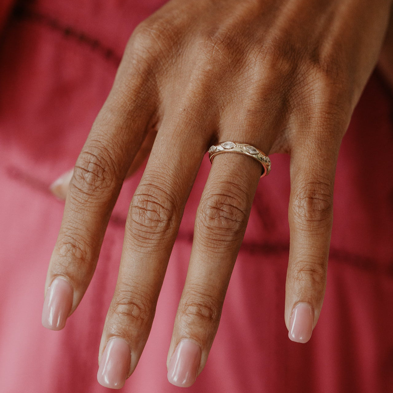 The Maravilla Band features ~.50 cttw marquise diamonds set in a bezel with milgrain details on a rounded gold band.