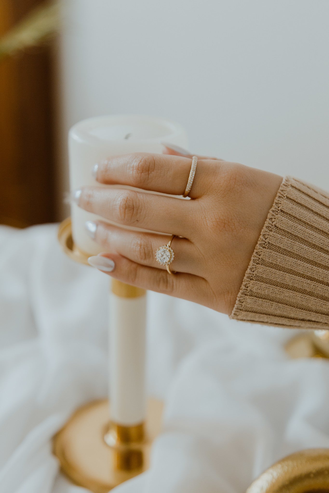 This 14k gold ring features a round center diamond set in four prongs, surrounded by a ~.12 cttw starburst diamond halo. The design is set on a rounded gold band that measures ~1.8mm in width.