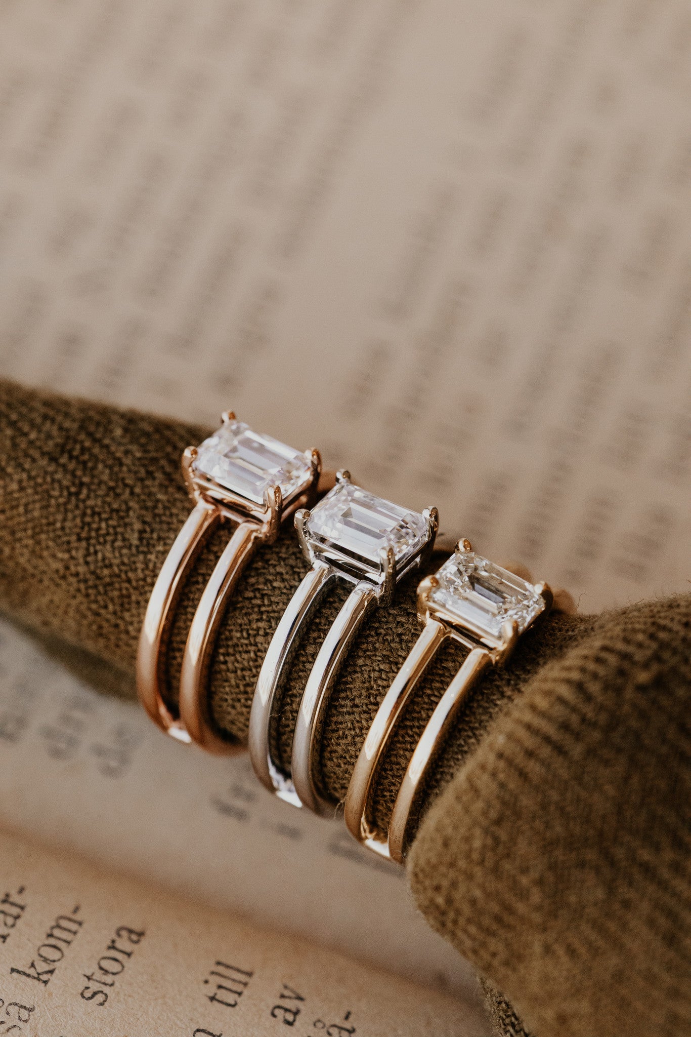 The Amanda Emerald Cut Double Band Solitaire Ring includes an emerald cut center stone set in 4-prongs set between two bands. Made-to-Order based on customization selected. Each band measures approximately 1.8mm.
