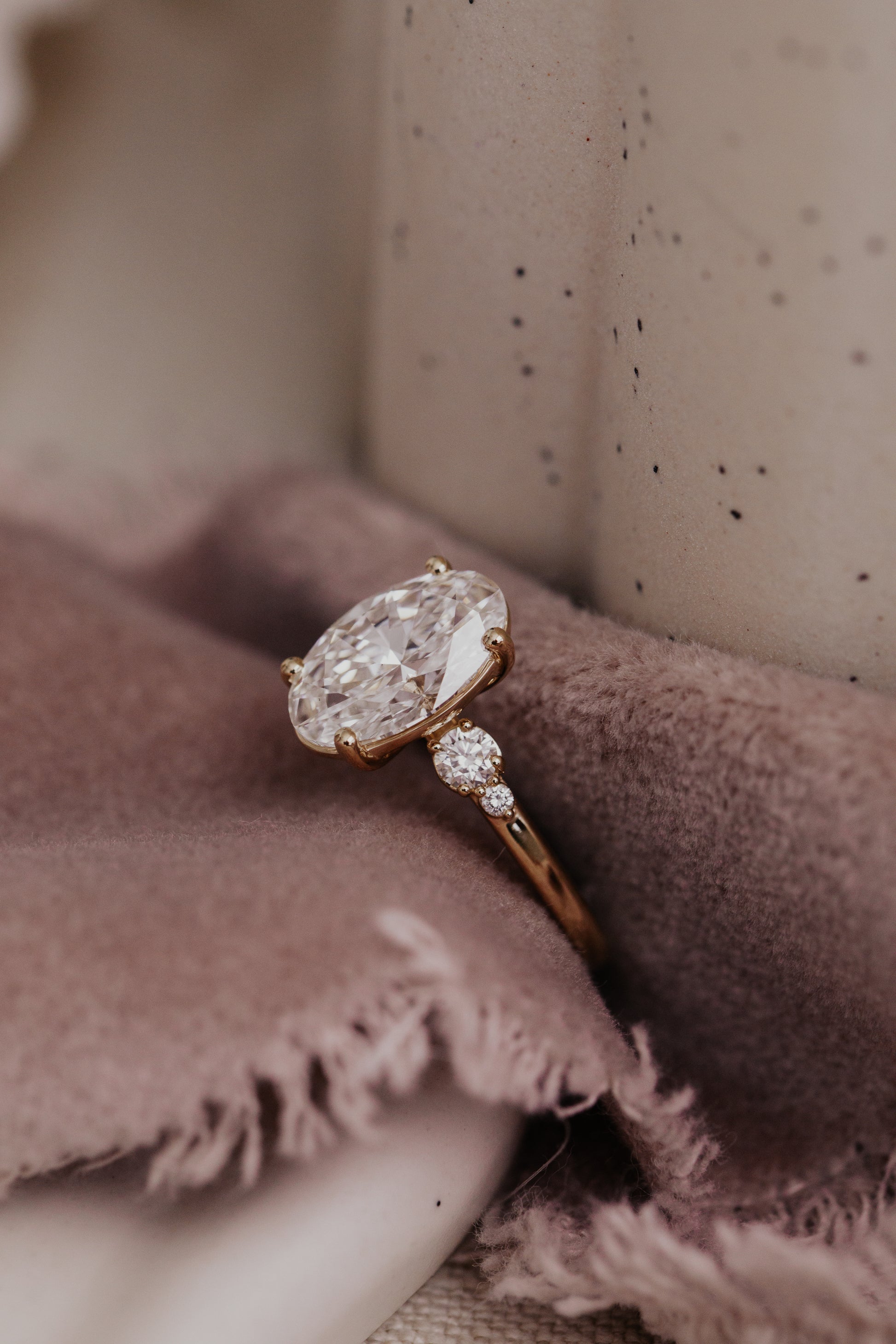 This 14k gold ring features a oval center stone set in four prongs, flanked on either side by ~.27 cttw round diamond clusters. The entire design is set on a high polish band.