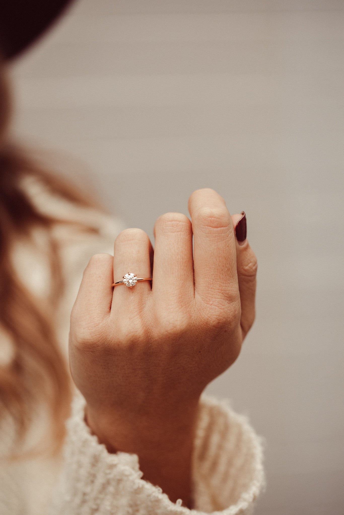 The Maeve Round 6-Prong Solitaire Ring includes a round center stone set in 6-prongs.