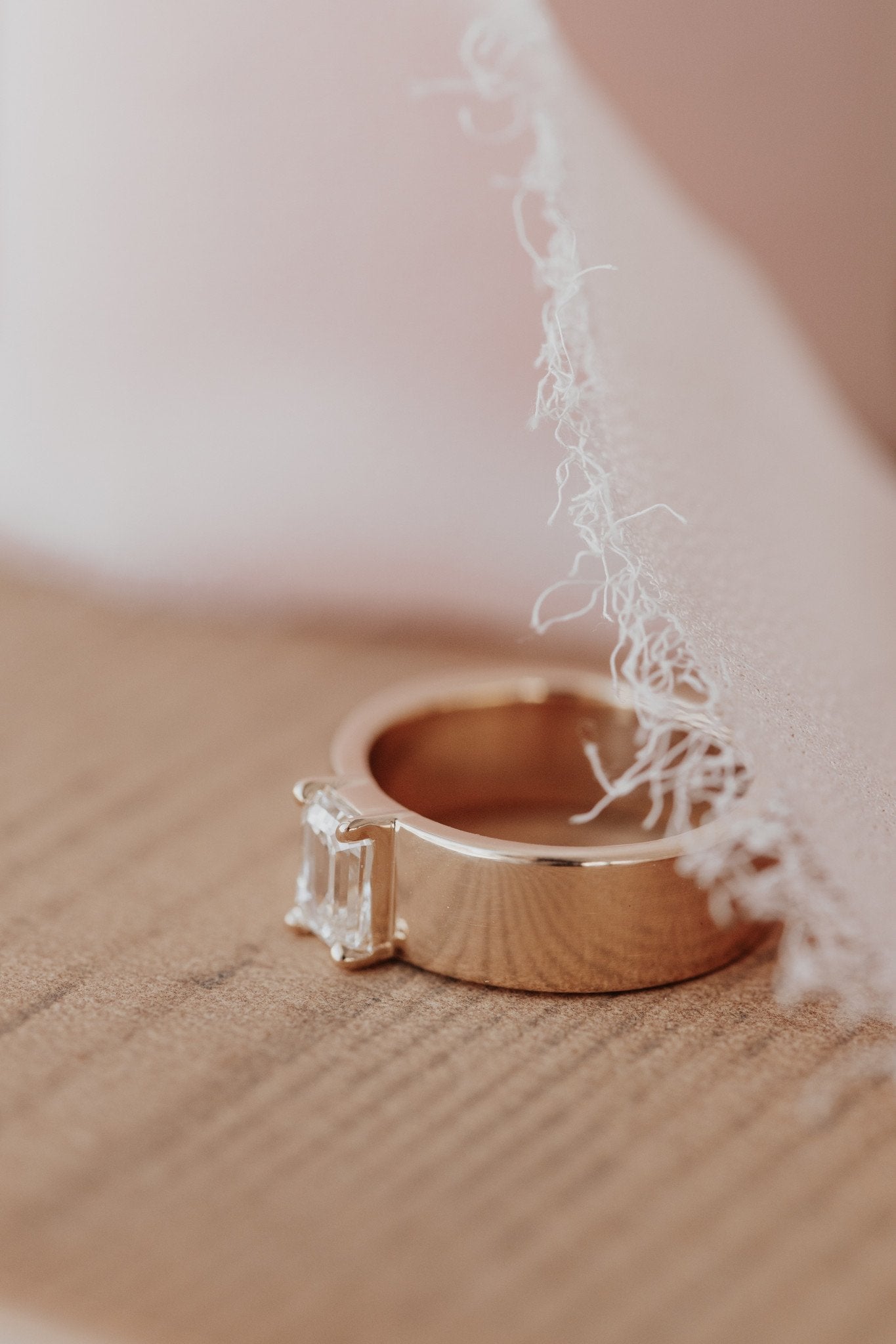 The Maya Emerald Cut Cigar Band Solitaire includes an emerald cut center stone set in 4-prongs on a cigar style wide band.