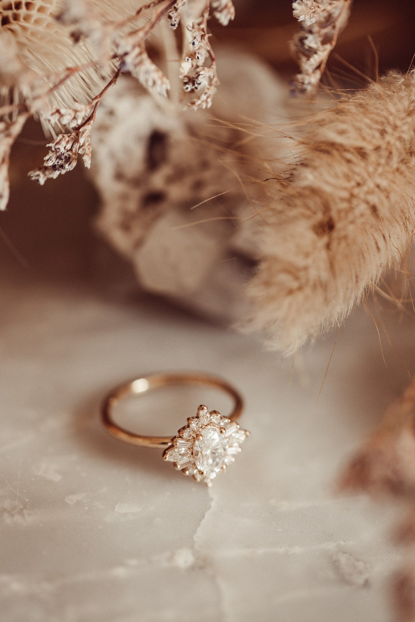 Inspired by The Harlem Ring, the Mini Harlem is a 14k gold ring features a .50 ct diamond center stone and .44 ct diamond halo bursting with pear, baguette, and round diamonds.
