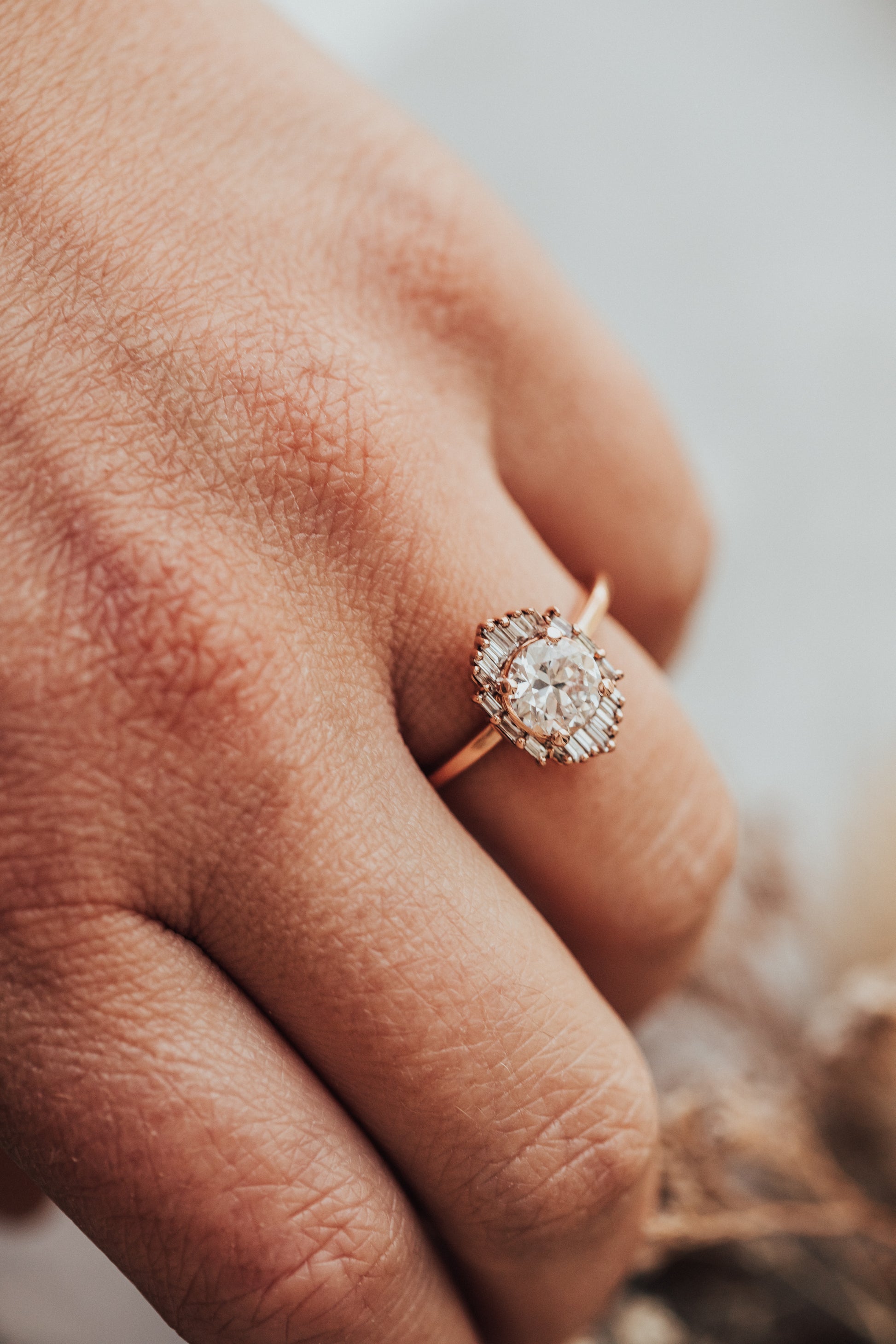This 14k gold ring features a 1 ct round center stone with .25 ct all-baguette diamond halo.