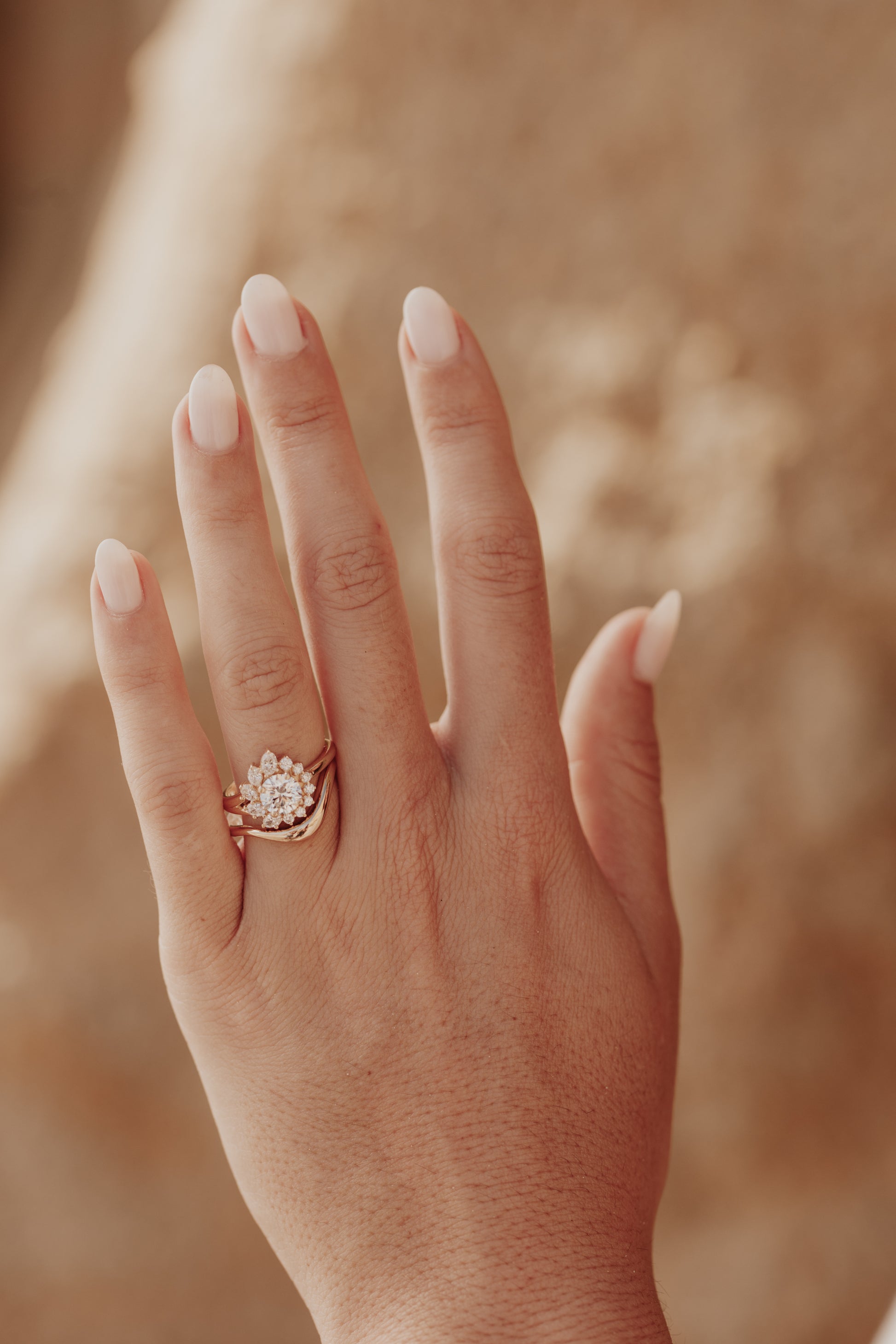 Our Solstice Ring is made in 14k gold and features a 1 ct round center diamond and a .50 ct oval and round starburst diamond halo set on an asymmetrical split shank band. The entire design is set flush to the finger.