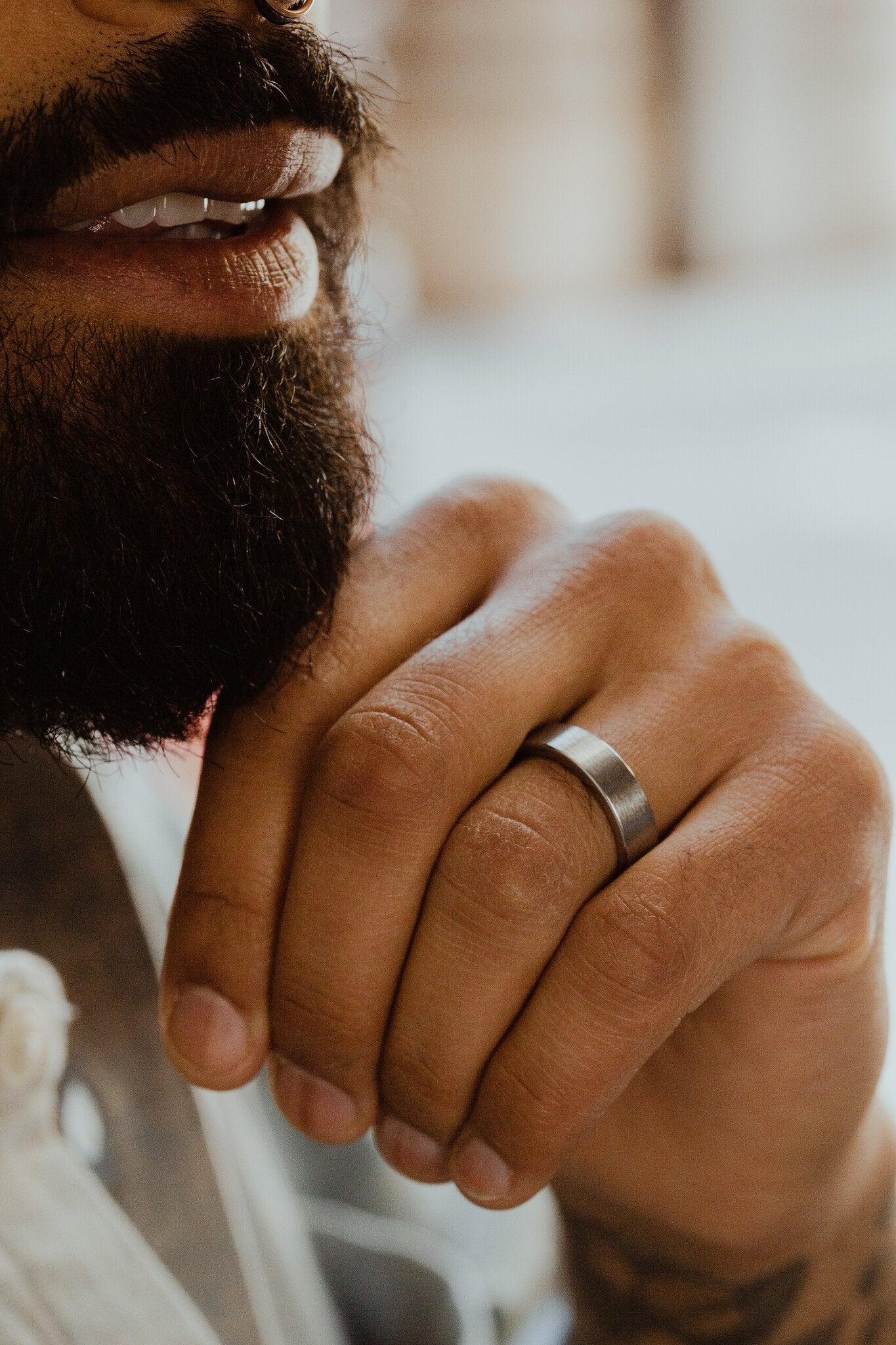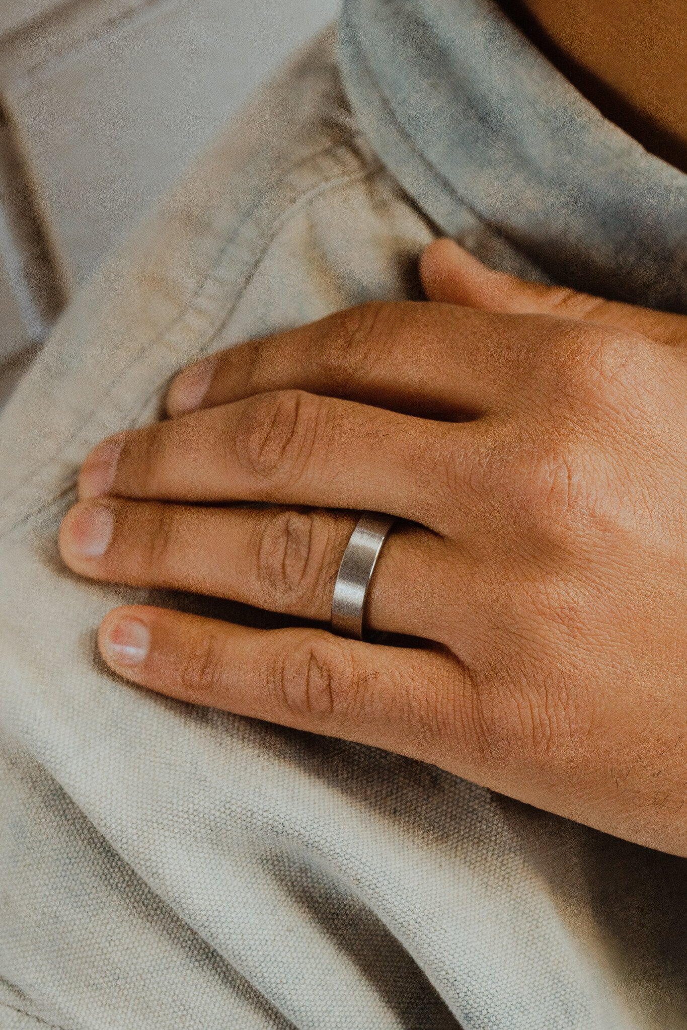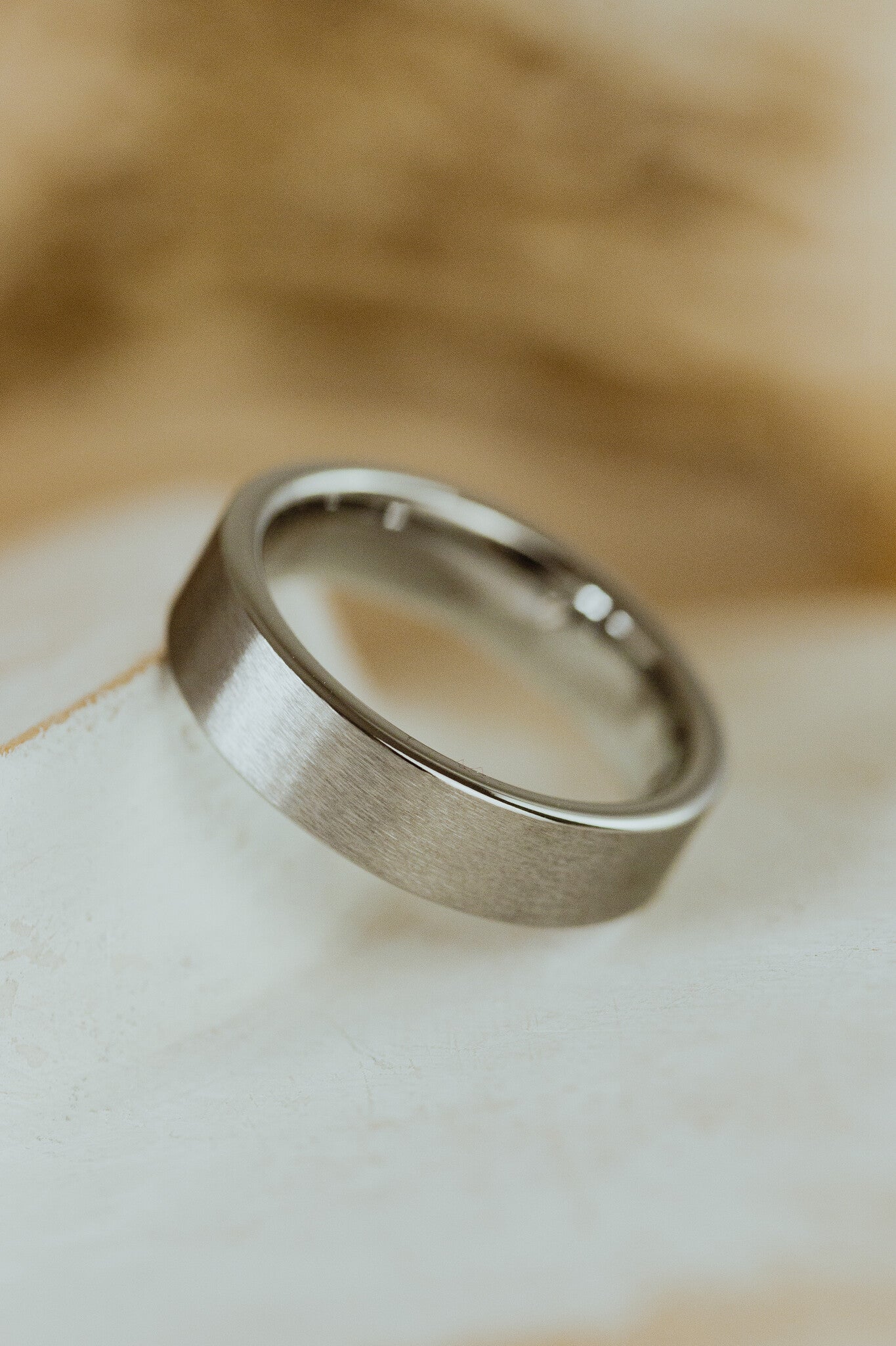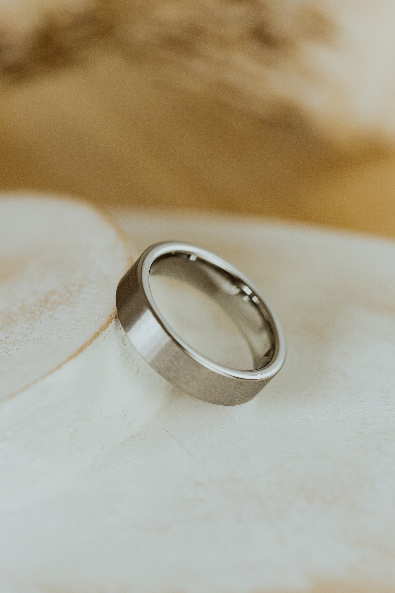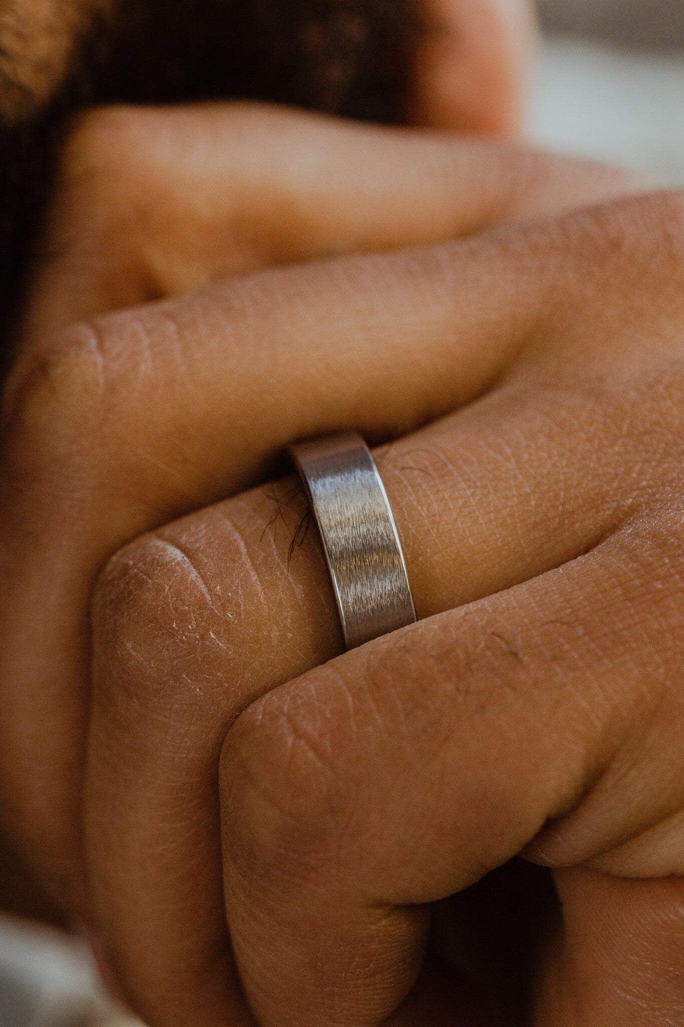The Noah Tungsten Flat Band features a flat band profile and a satin finish. Tungsten is one of the strongest metals used for jewelry with a heavier weight and dark grey color.