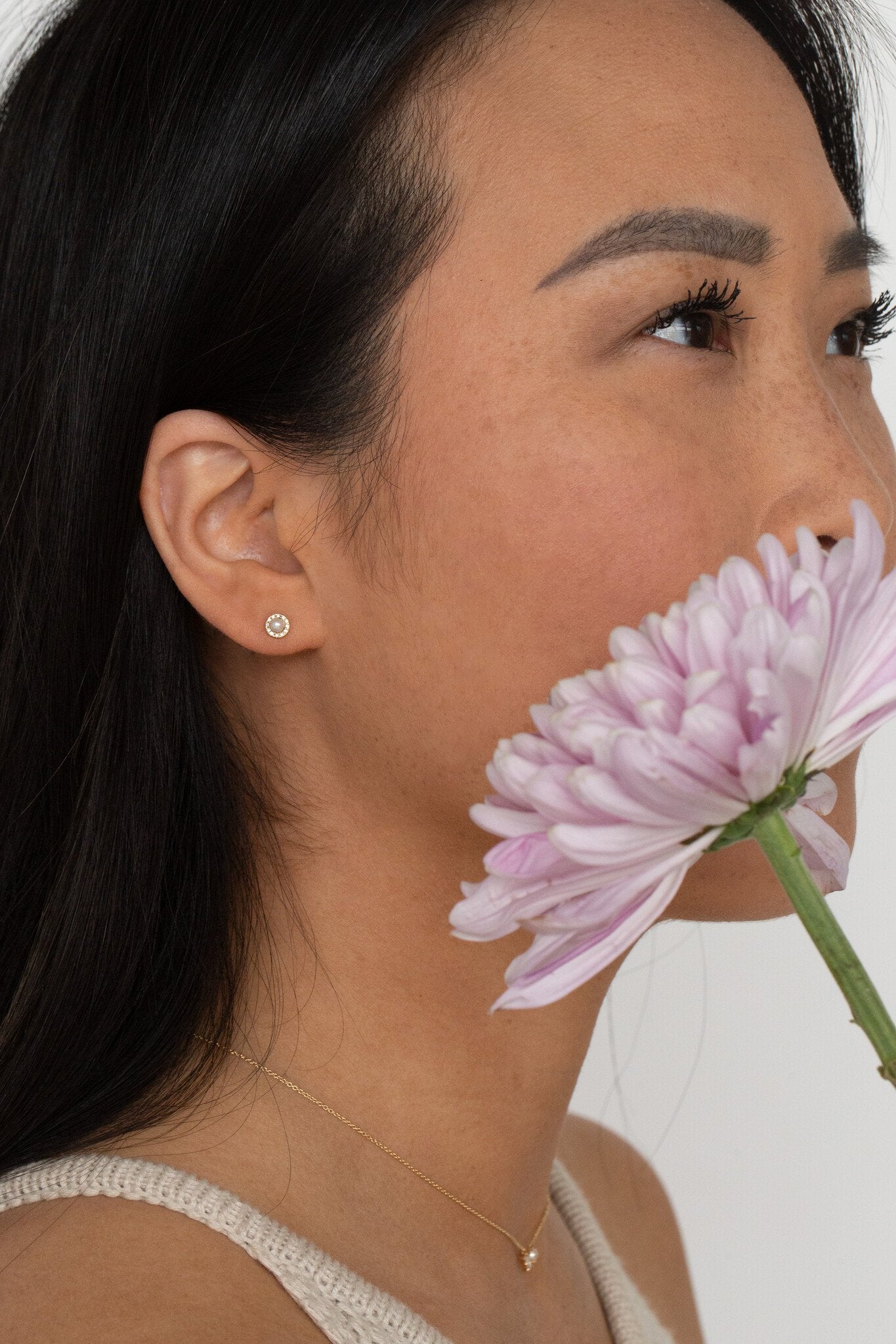 These 14k gold stud earrings feature a freshwater pearl surrounded by a diamond halo.
