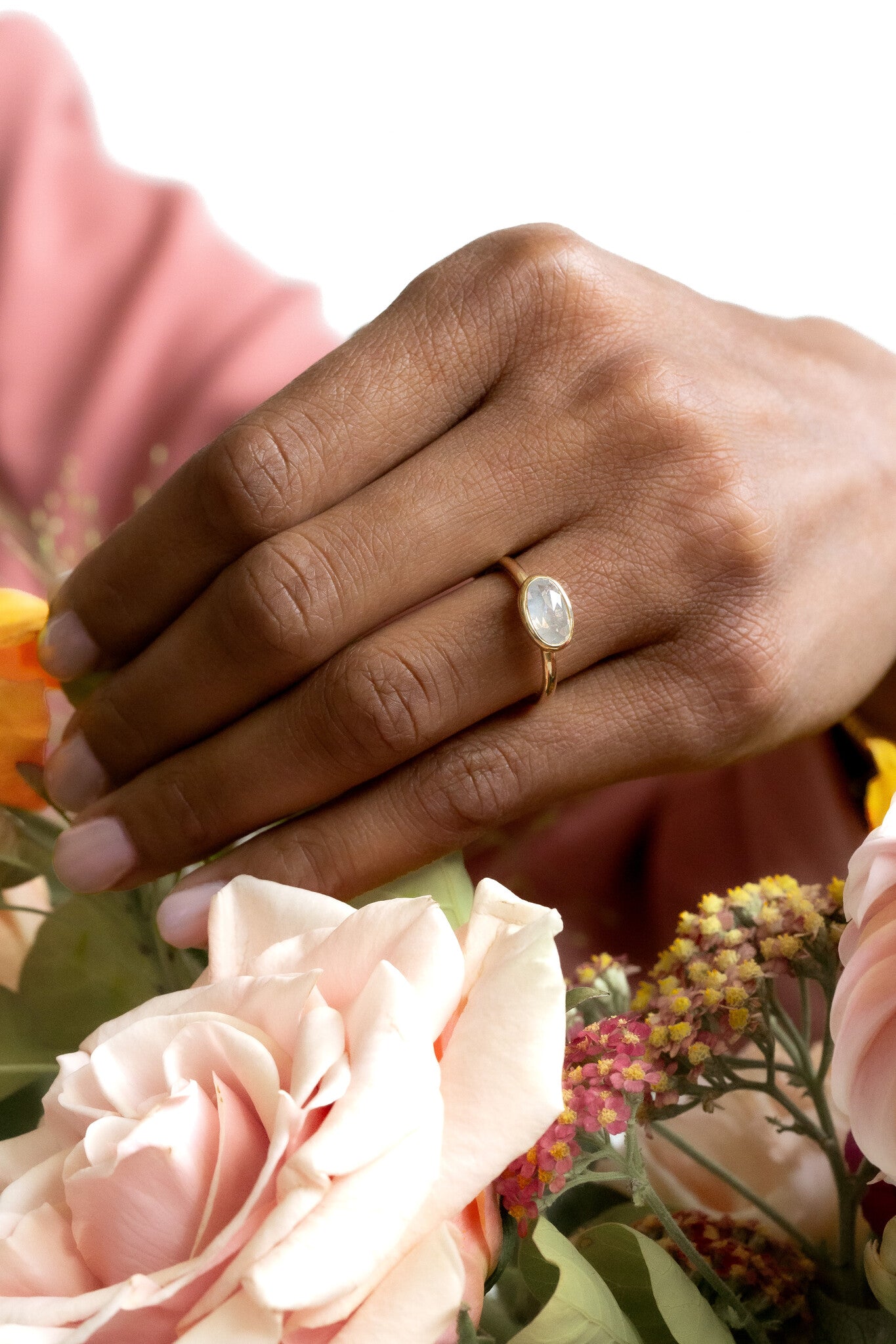 This 14k yellow gold ring features a 1.69 ct milky white oval rustic diamond set east/west in a high polish bezel on a rounded band.