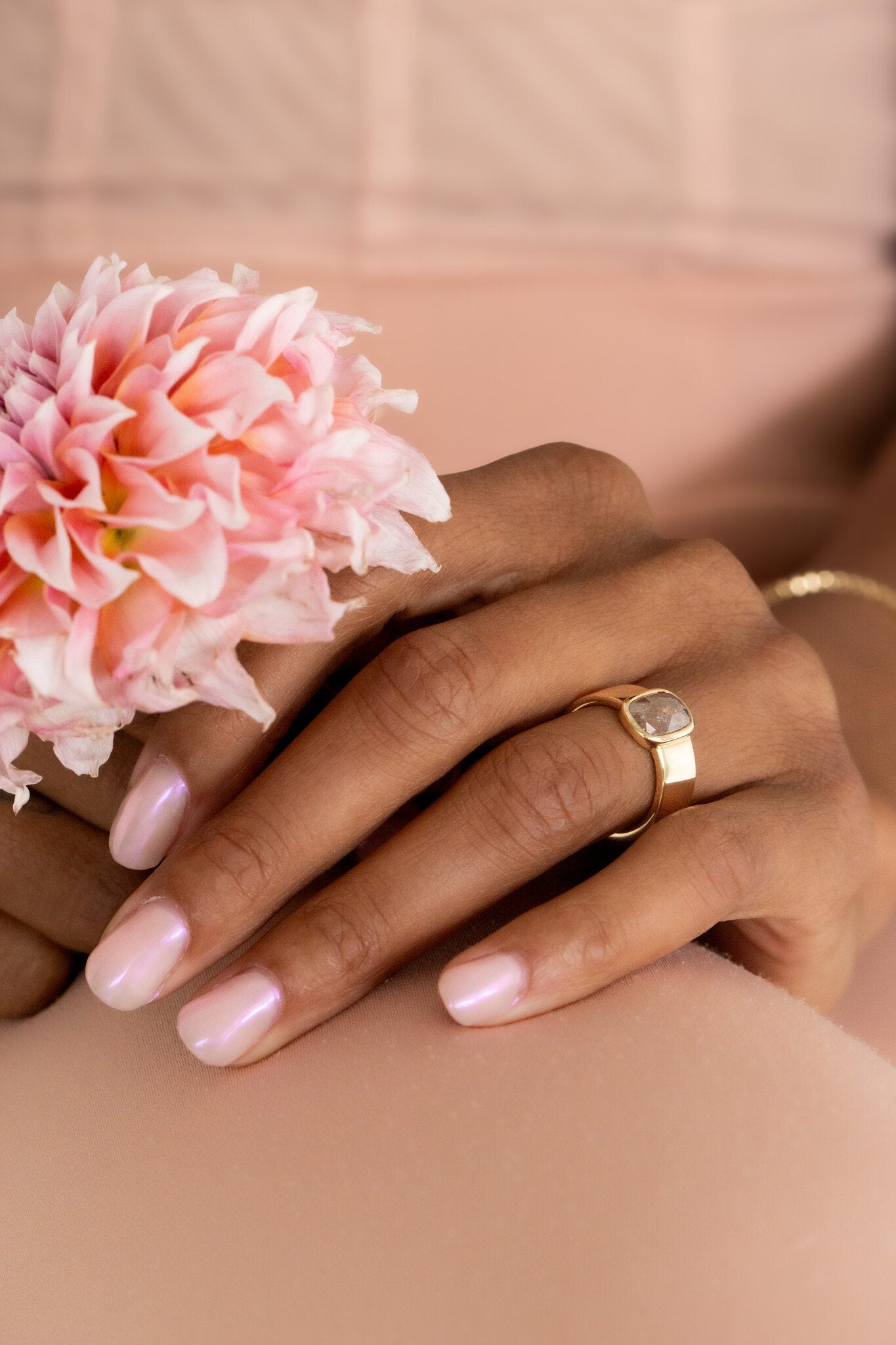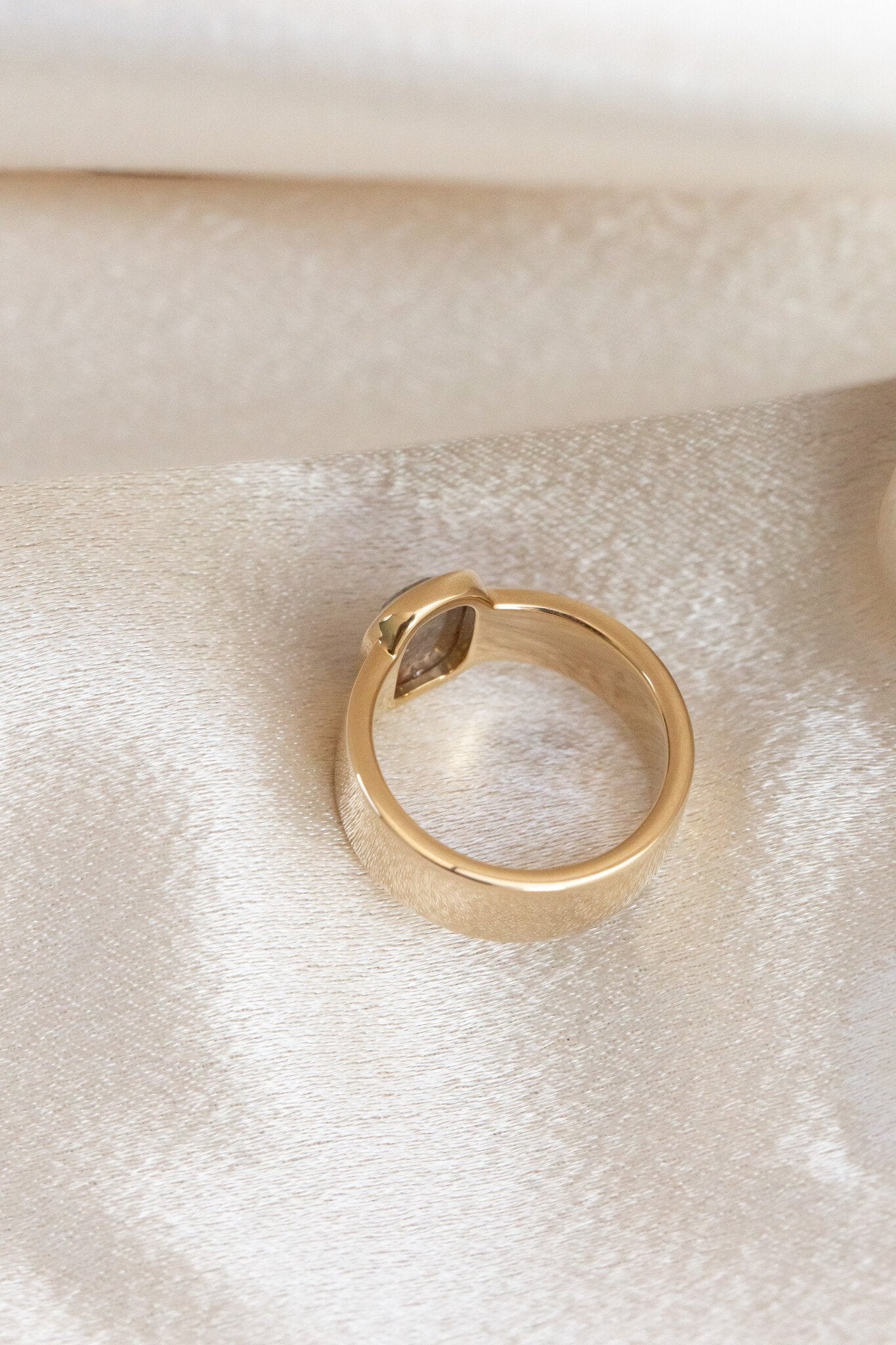 This 14k yellow gold ring features a 2.04 ct long cushion rustic diamond set in a high polish bezel on a wide flat band.