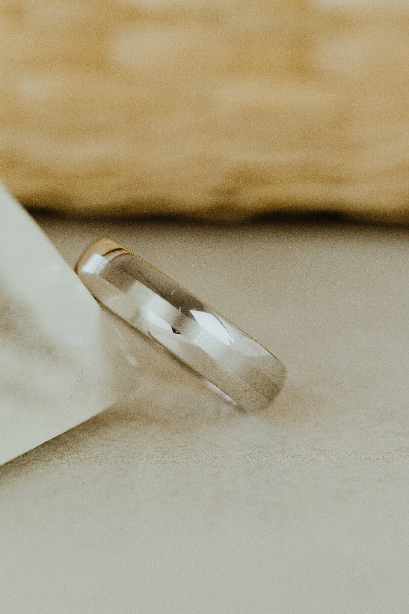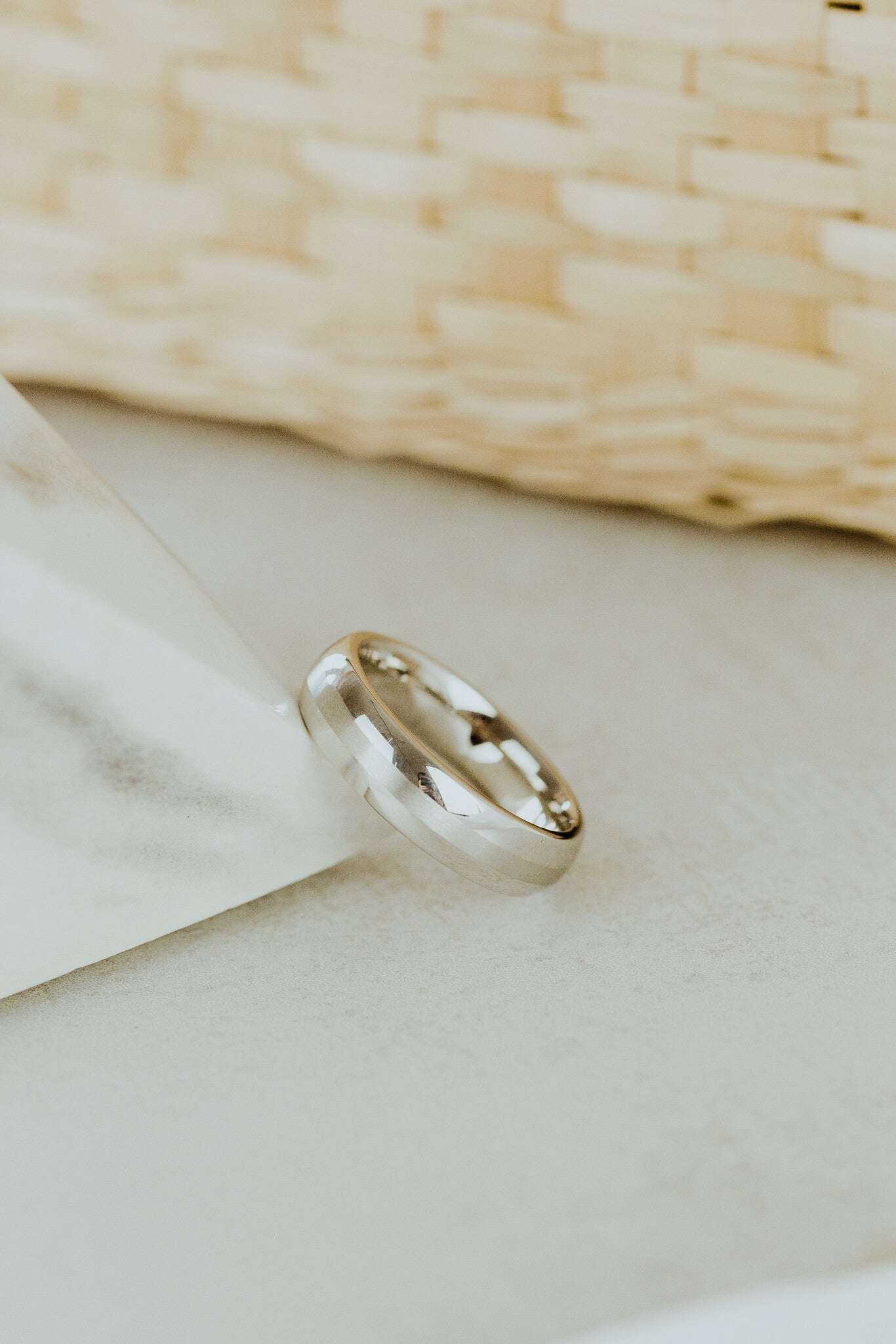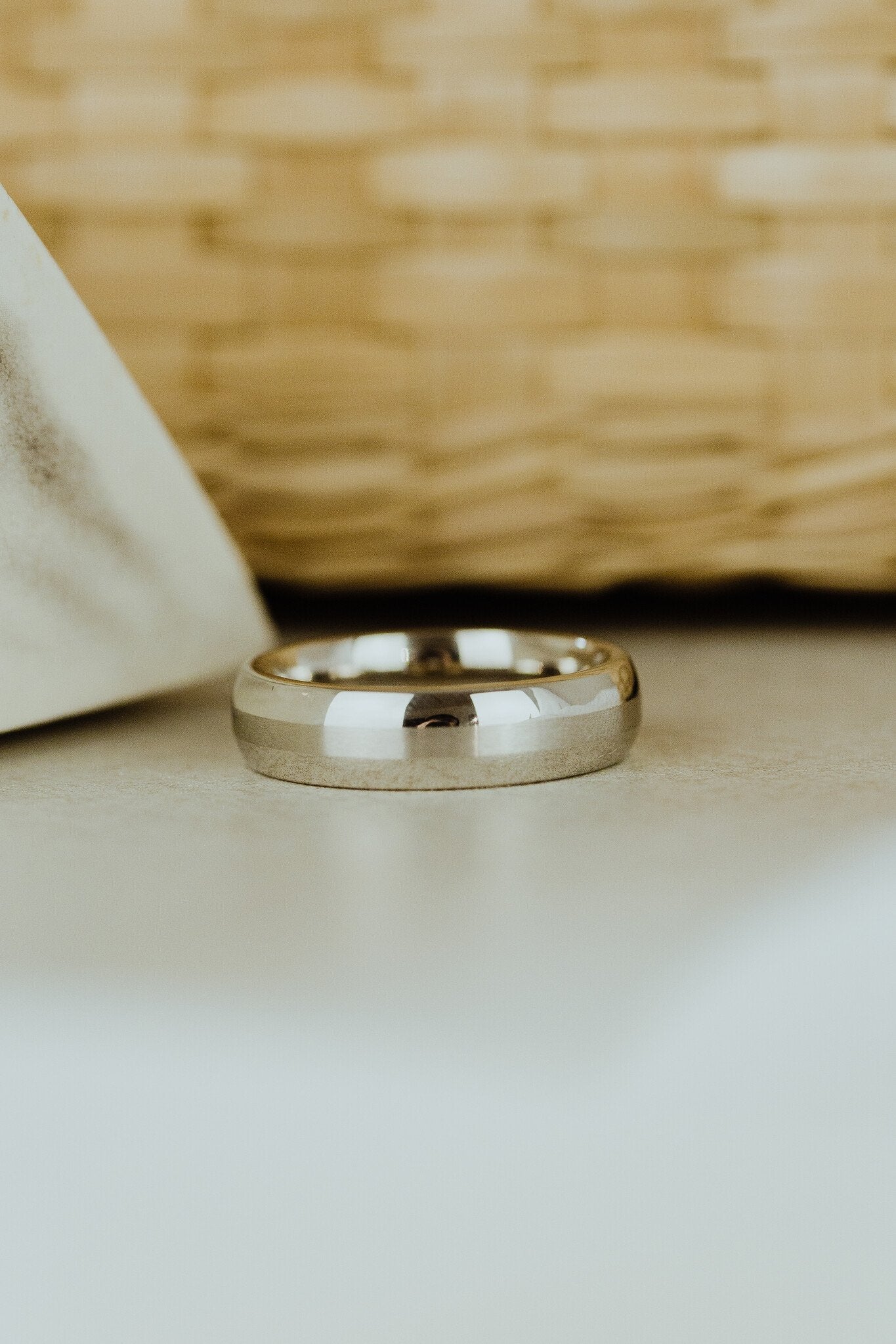 The Taylor Cobalt Stripe Band has a rounded band profile with a satin stripe running down the center of the band. These cobalt bands are lightweight and hypoallergenic and have a platinum color.