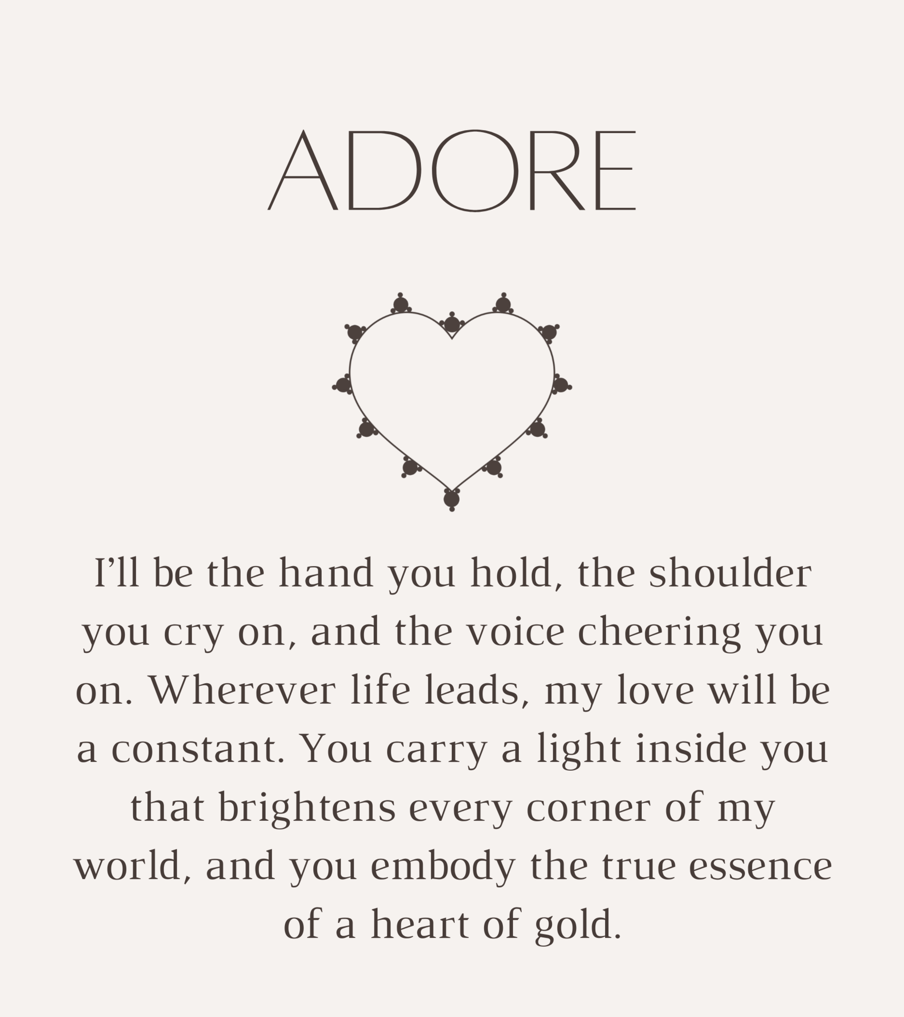 I’ll be the hand you hold, the shoulder you cry on, and the voice cheering you on. Wherever life leads, my love will be a constant. You carry a light inside you that brightens every corner of my world, and you embody the true essence of a heart of gold.