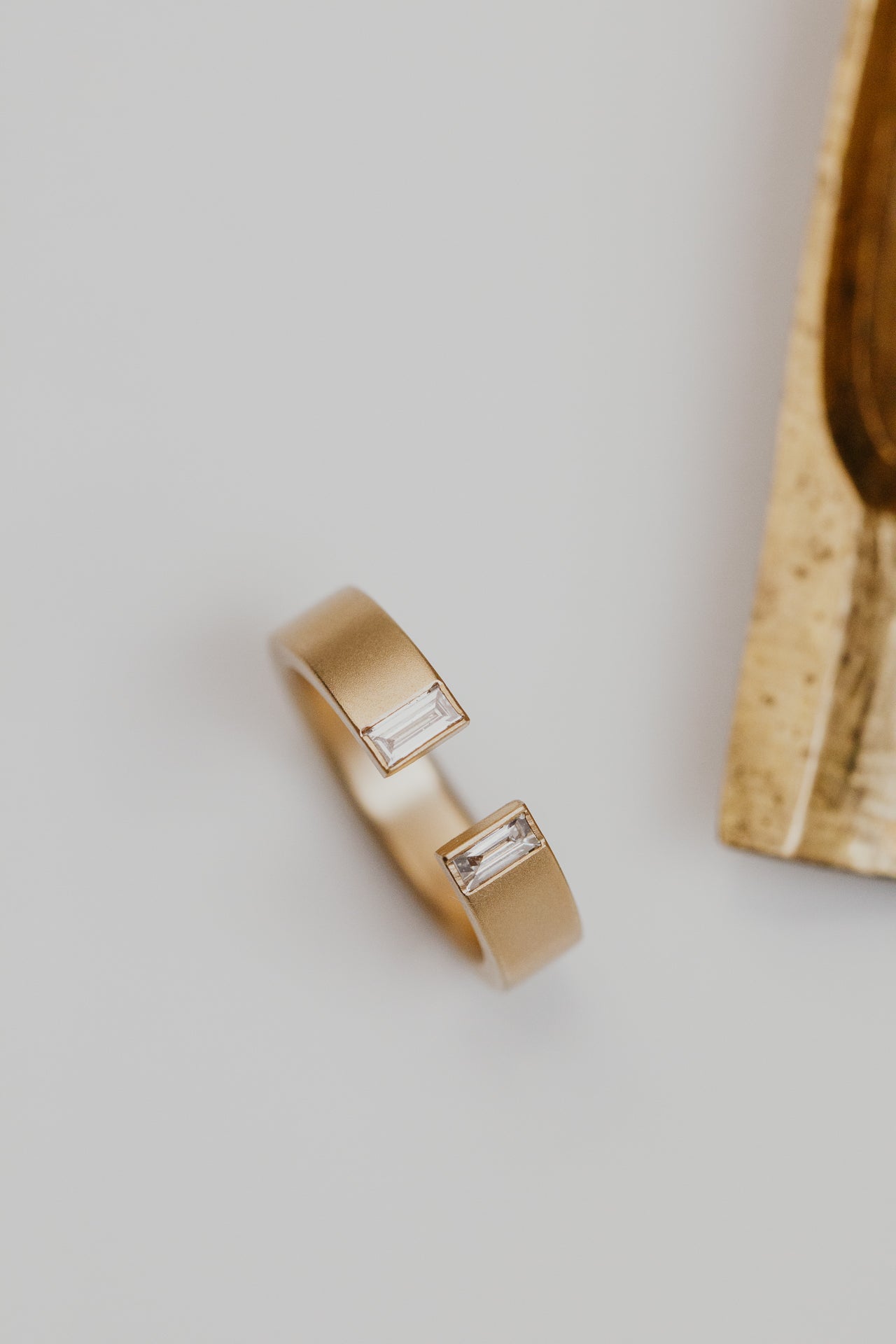 The Briar Baguette Band features an open design with ~.30 cttw baguette diamonds.
