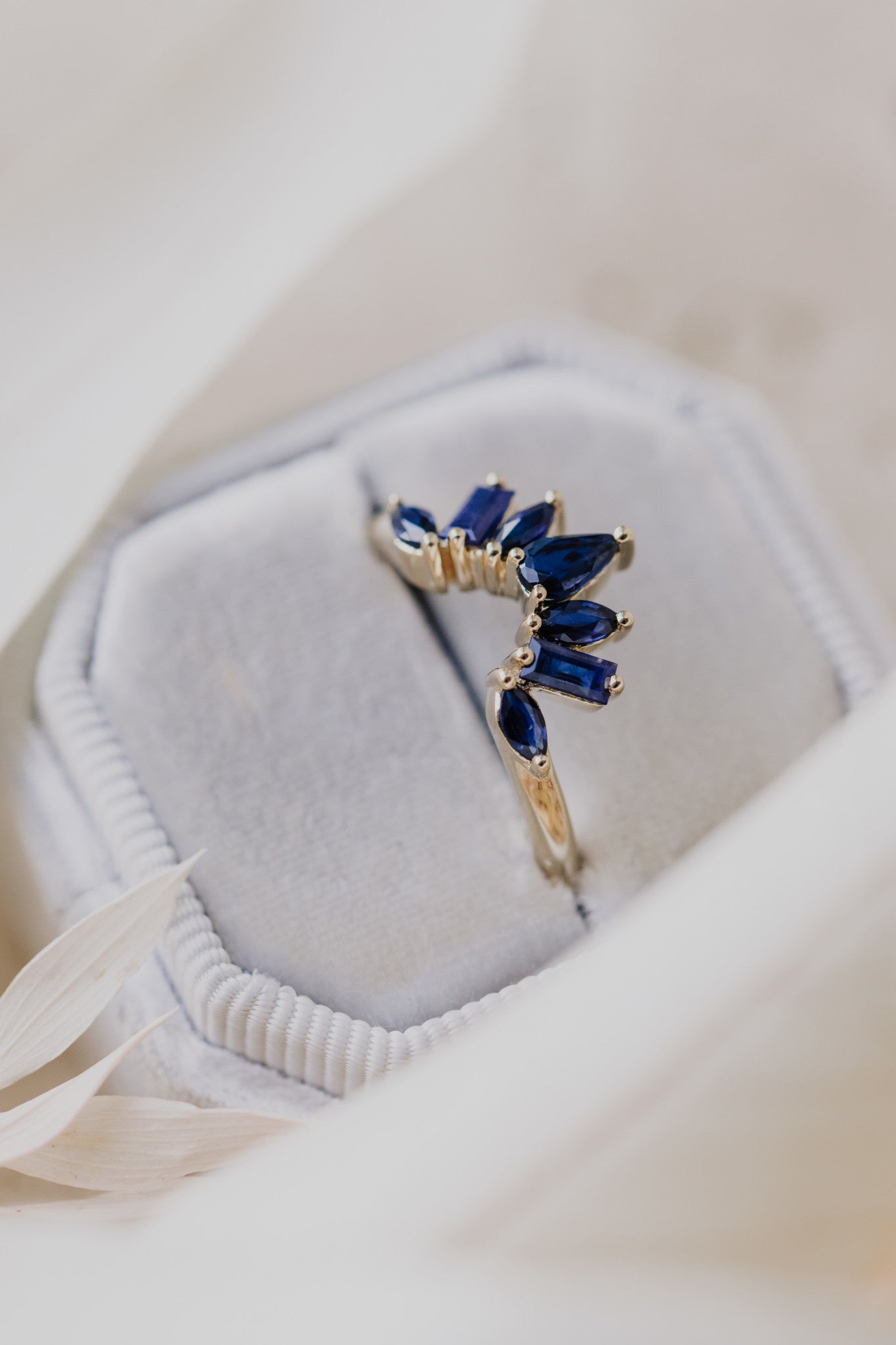 Inspired by our our love of all gemstones, this 14k gold band features .99 cttw pear, marquise, and baguette blue sapphires, set in prongs in a starburst design. The band design is set on a rounded band.
