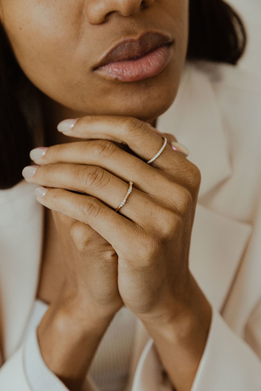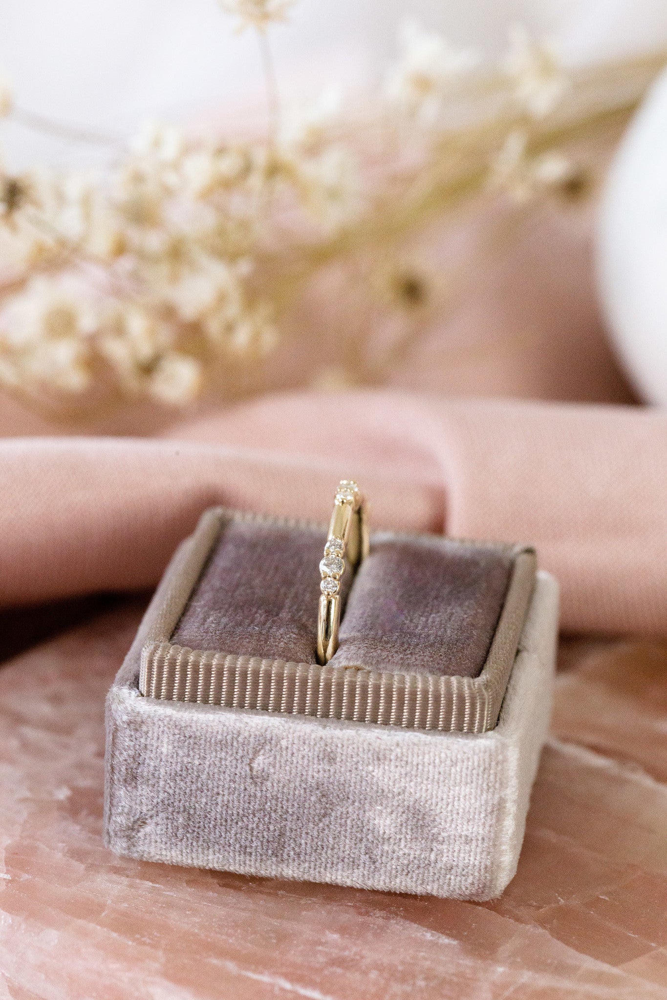 The Frankie Round Band features ~.14 ct round diamonds, set in clusters of three, spaced out on a high polish rounded band.