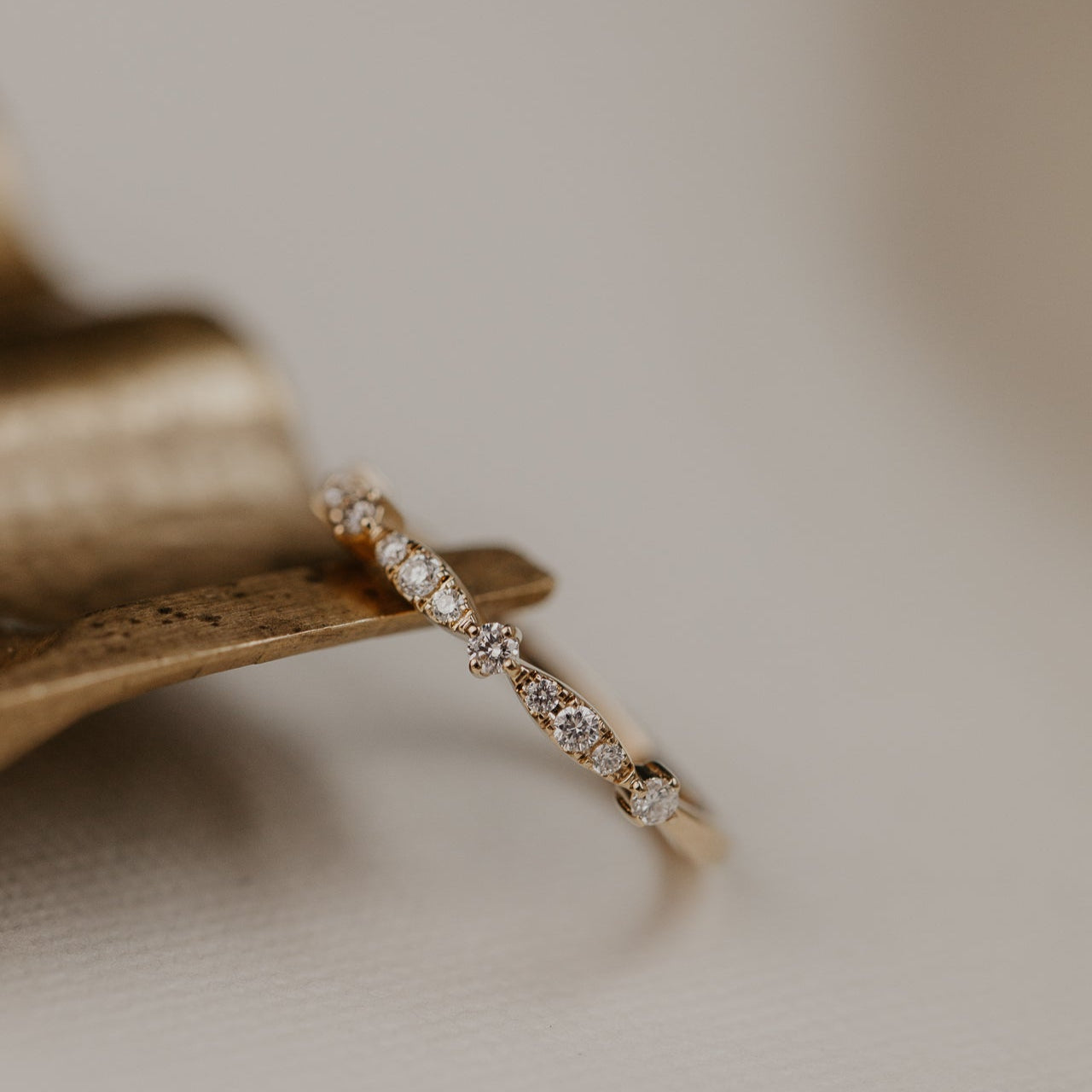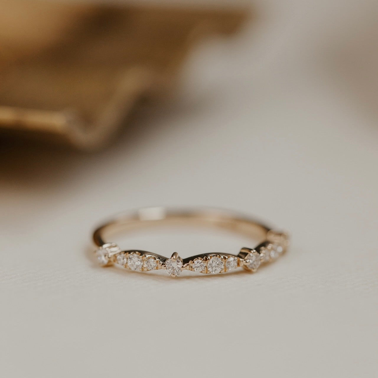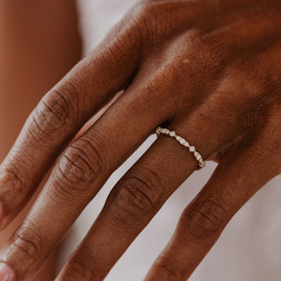 The Ingrid Round Band features ~.19 cttw round diamonds in a fancy marquise and round pattern. The diamonds go approximately halfway around the band.