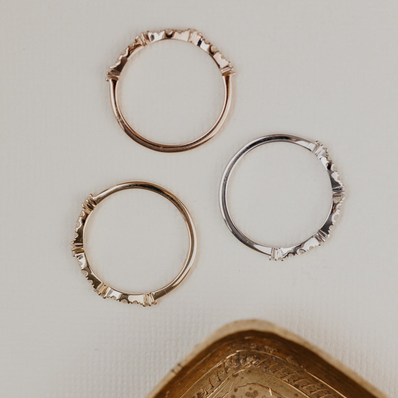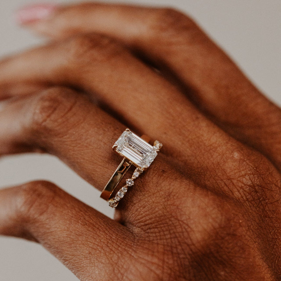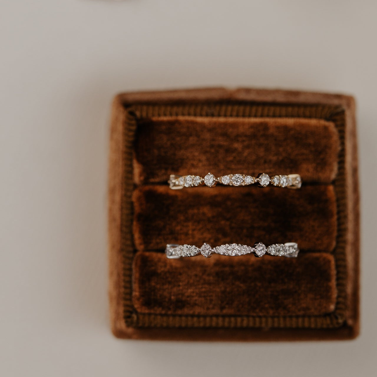 The Ingrid Round Band features ~.19 cttw round diamonds in a fancy marquise and round pattern. The diamonds go approximately halfway around the band.