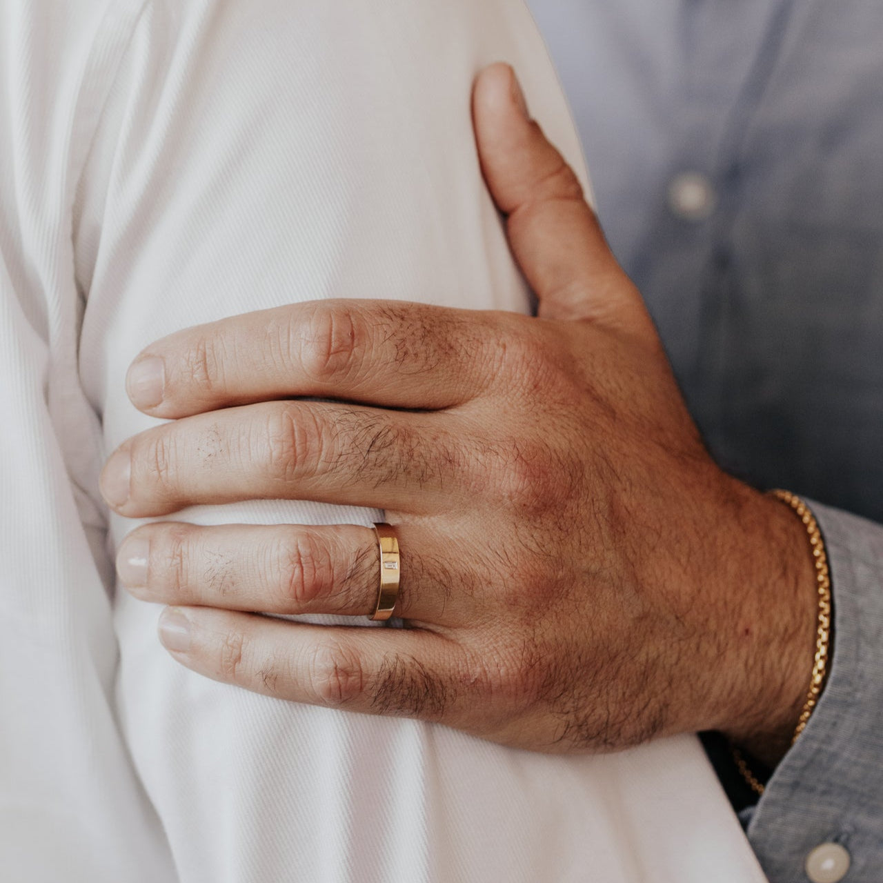 The Jaden Band features a ~.09 ct baguette diamond hammer set in a high polish wide band.