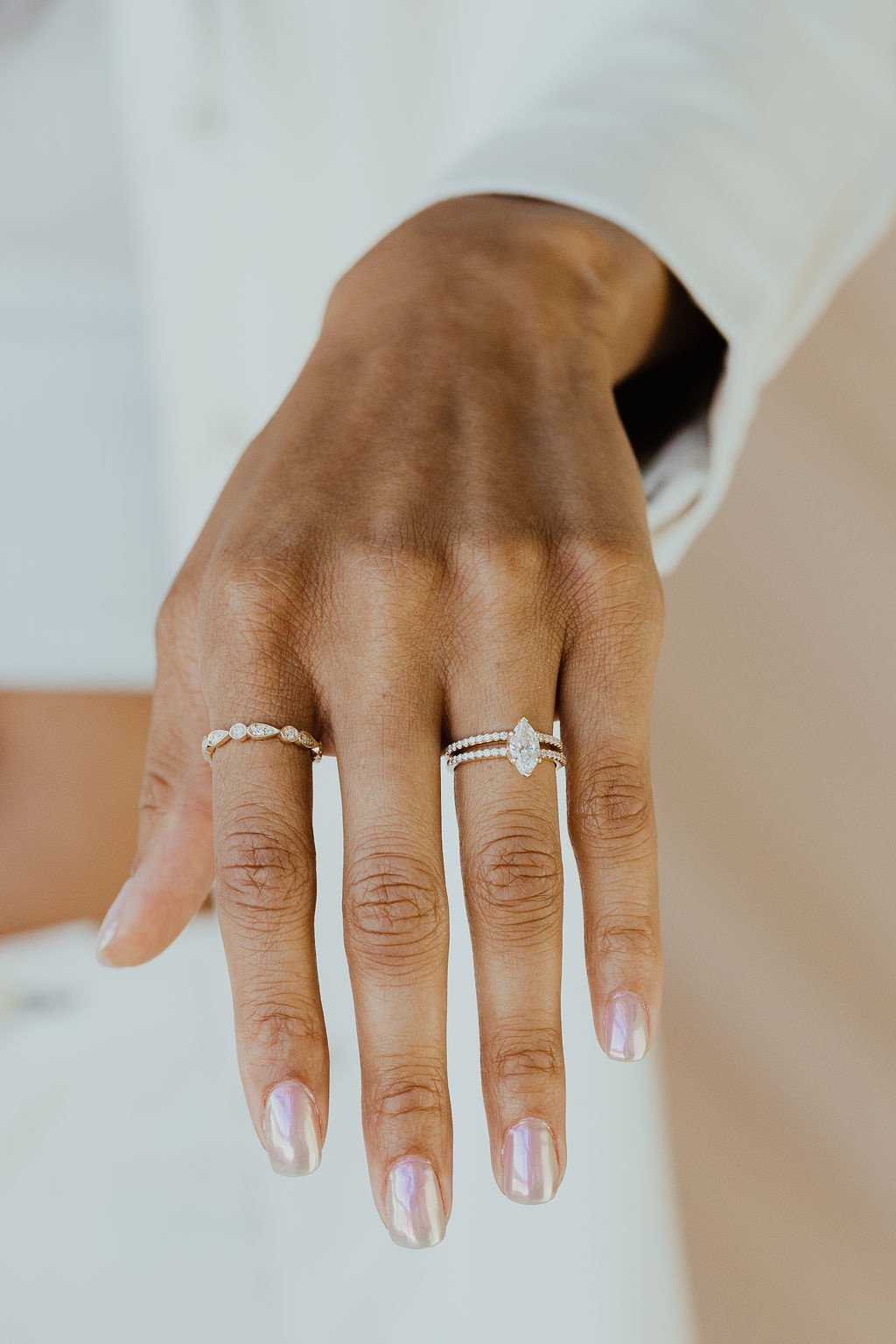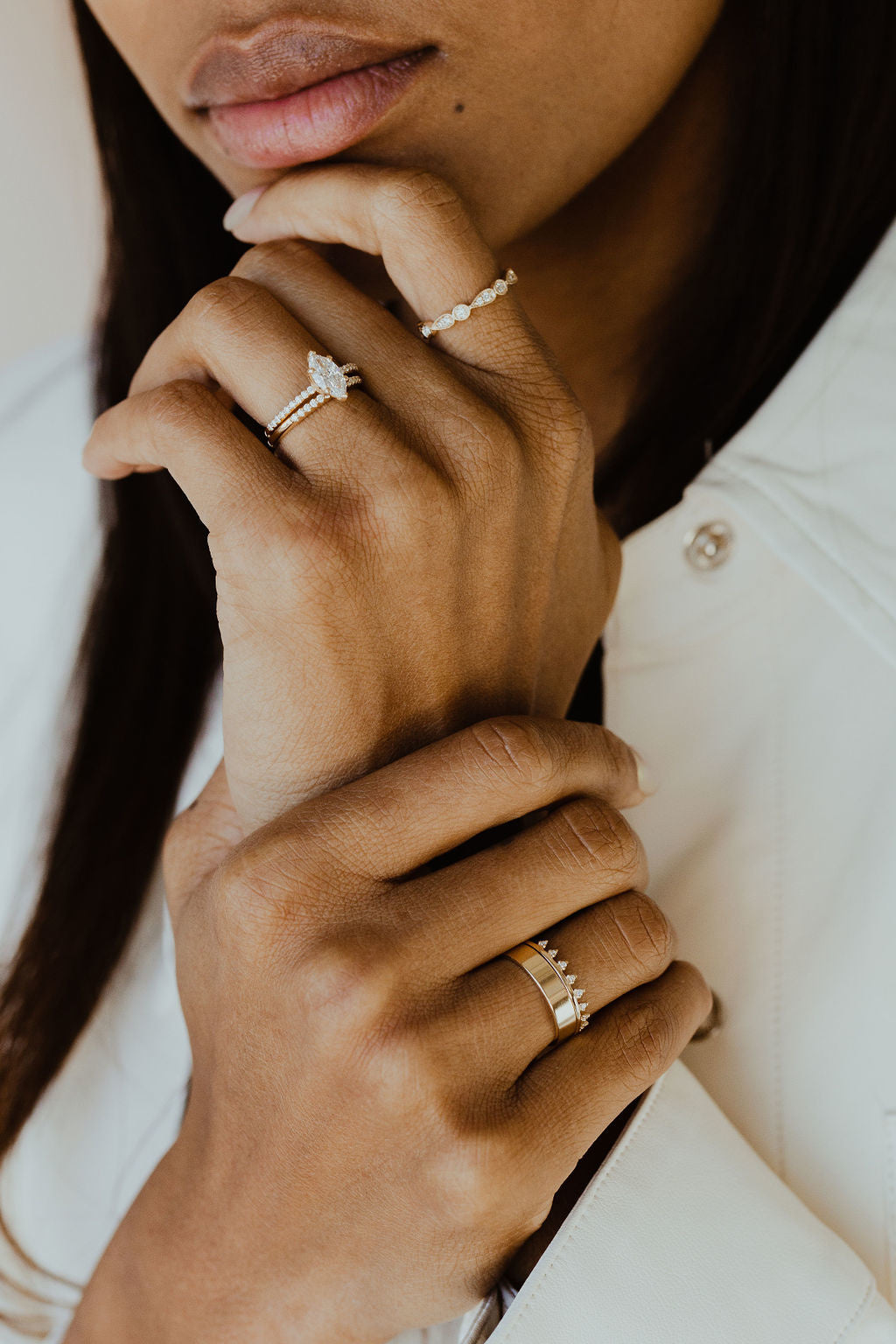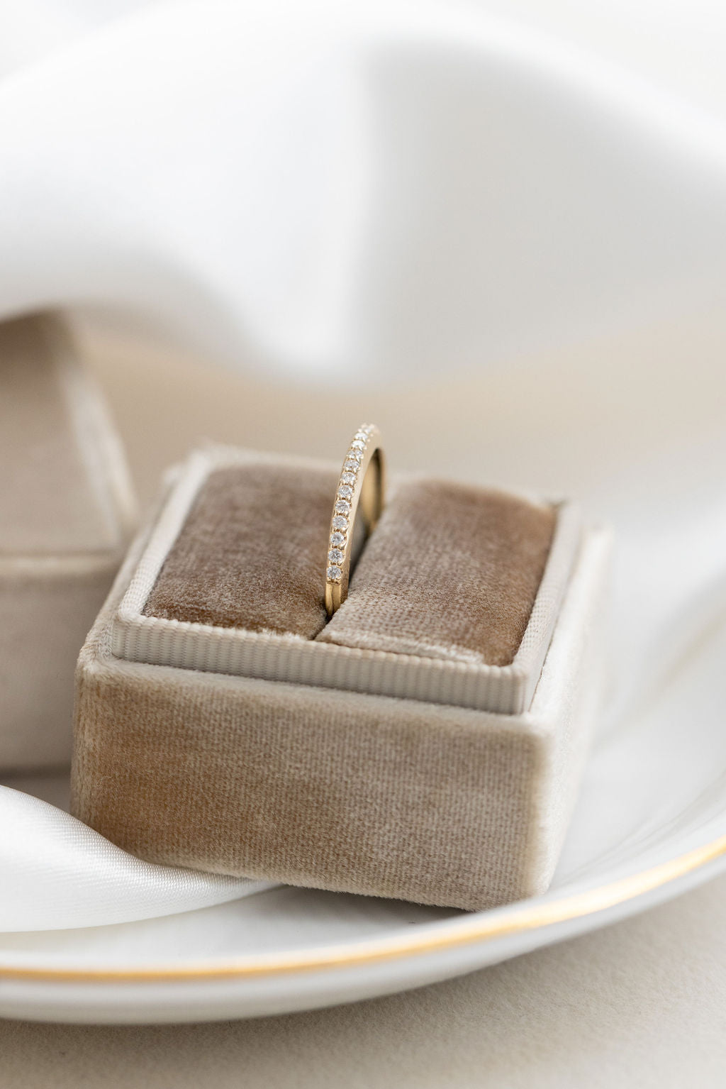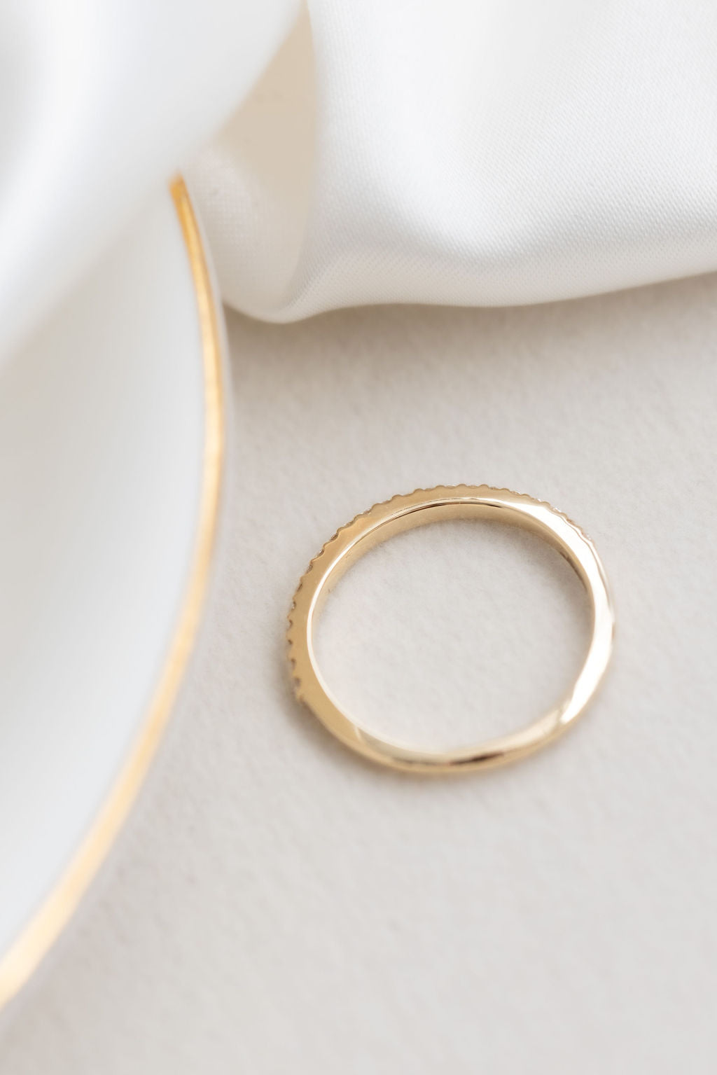 The Jenna Band features ~.17 cttw round diamonds set in prongs in a single-row style.