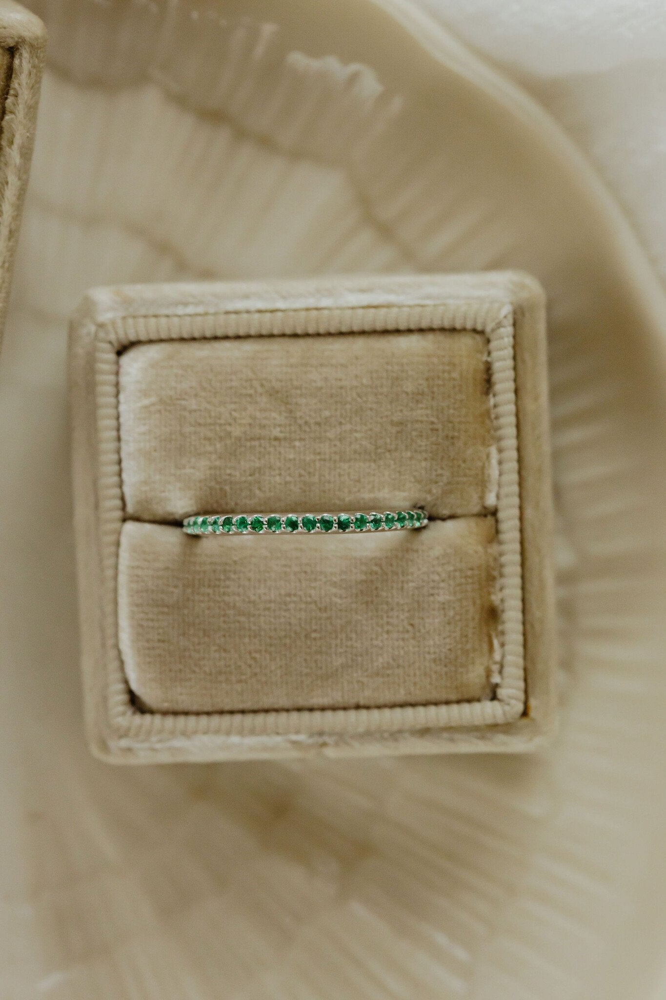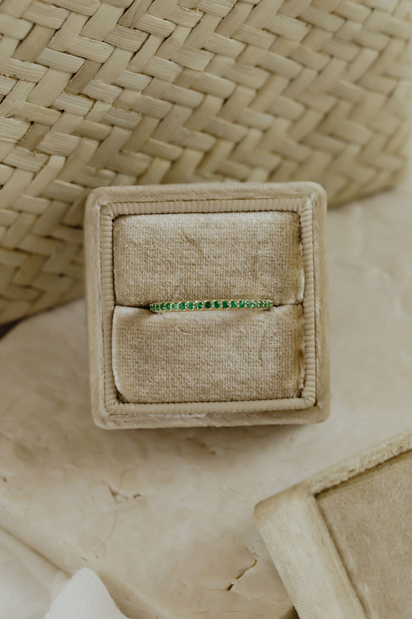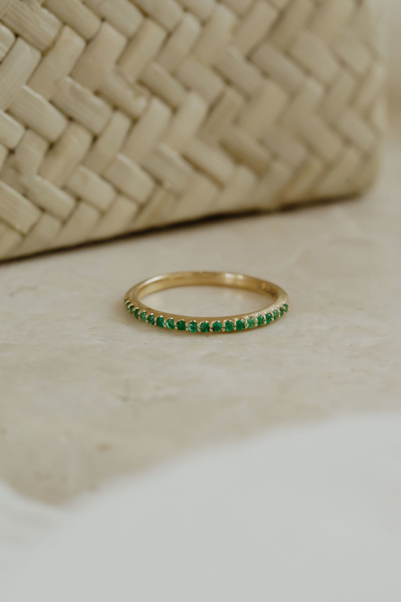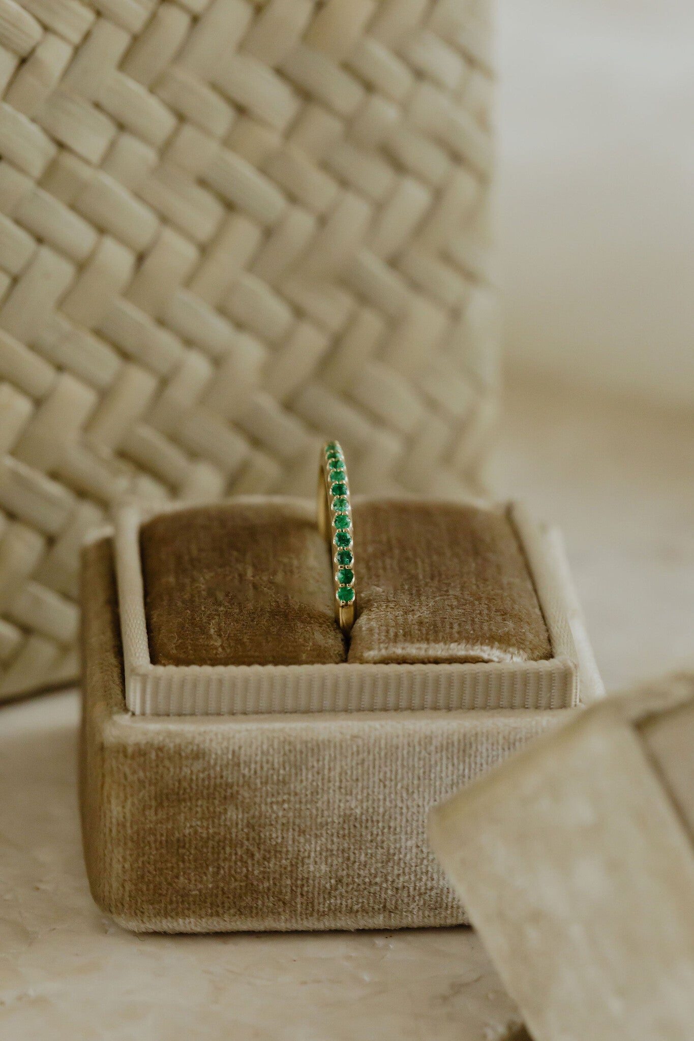 Our Jenna Emerald Band is designed to fit perfectly with our Jenna Ring, no matter the center stone shape. This 14k gold band features .15 ct round emeralds set in prongs in a single-row style.