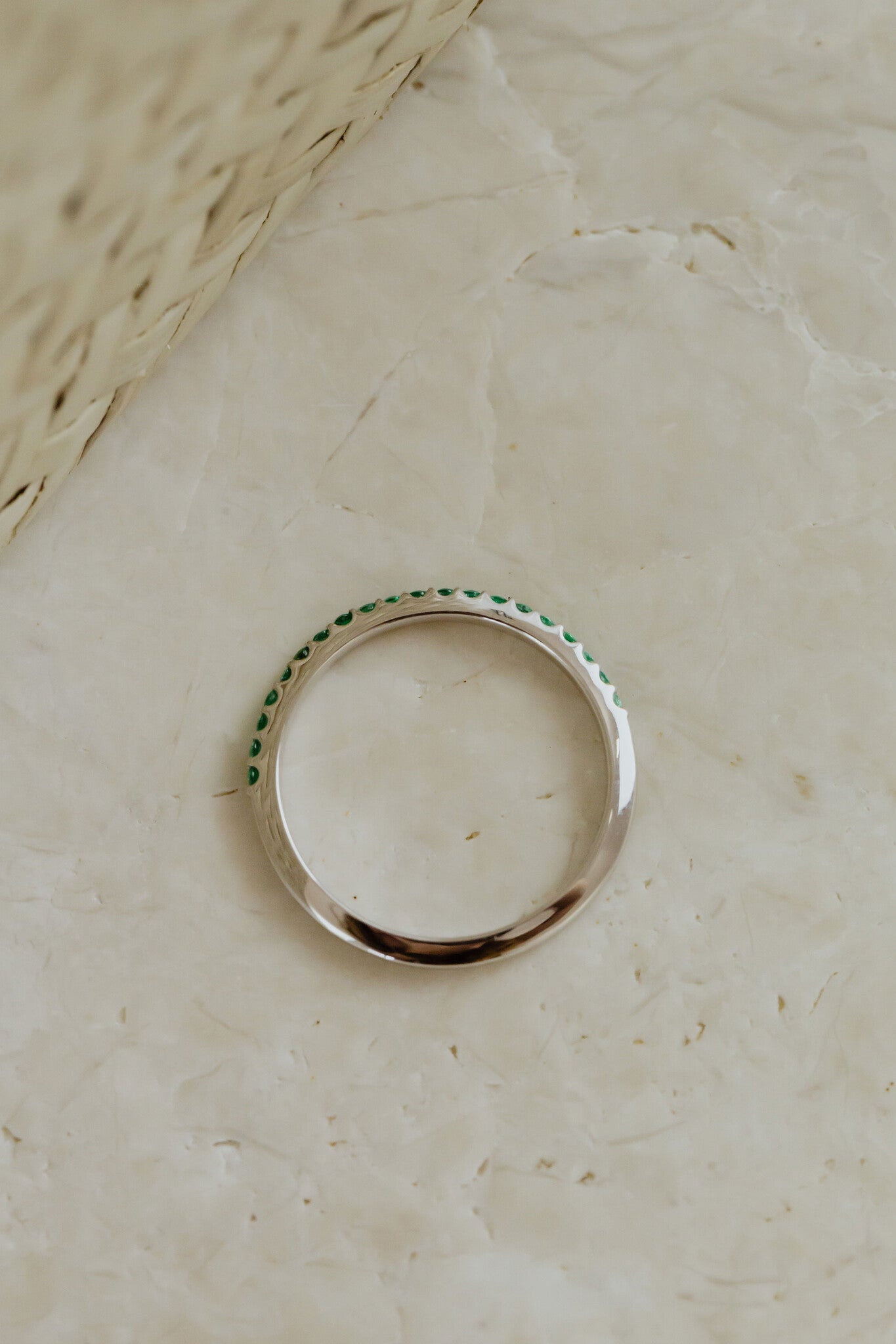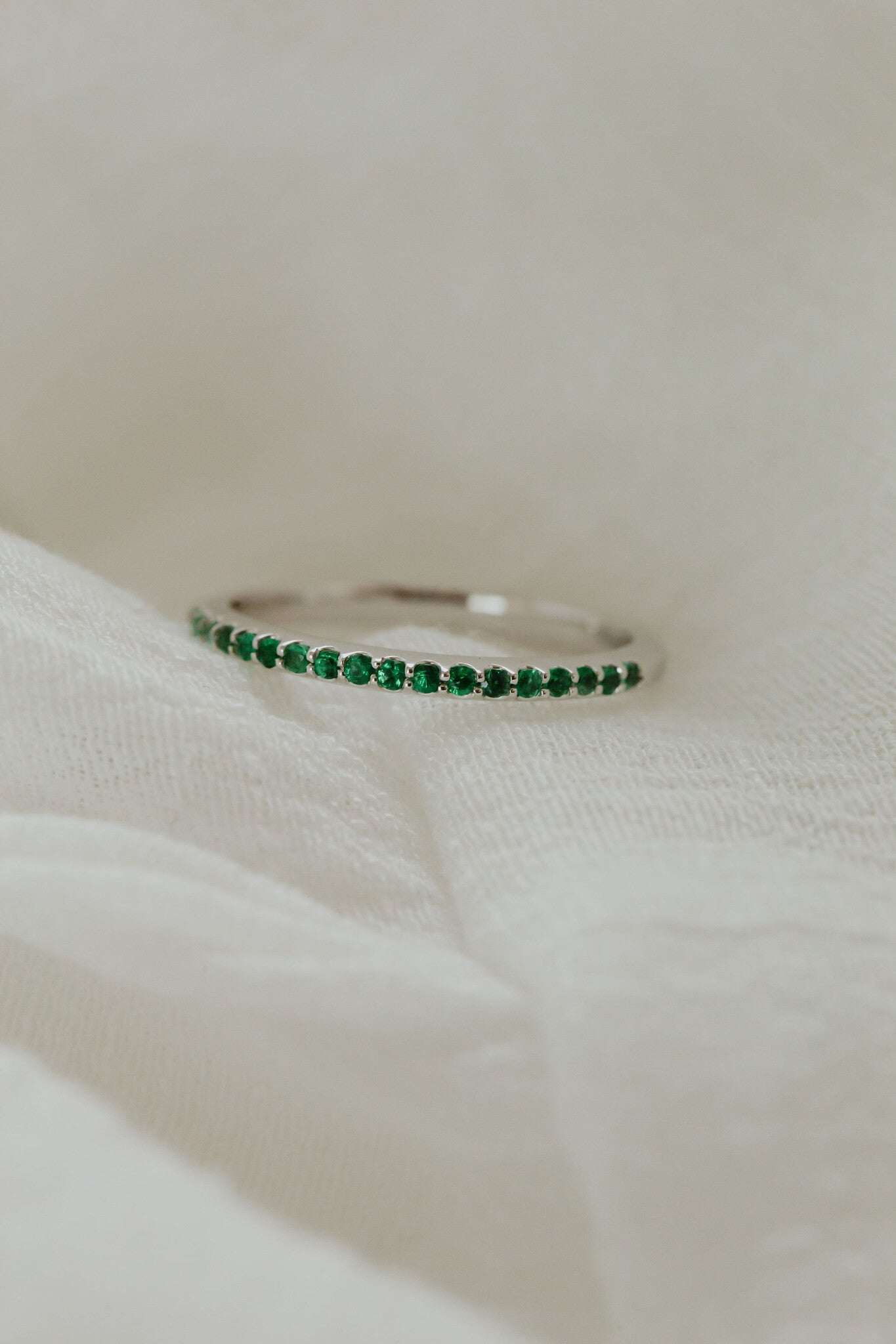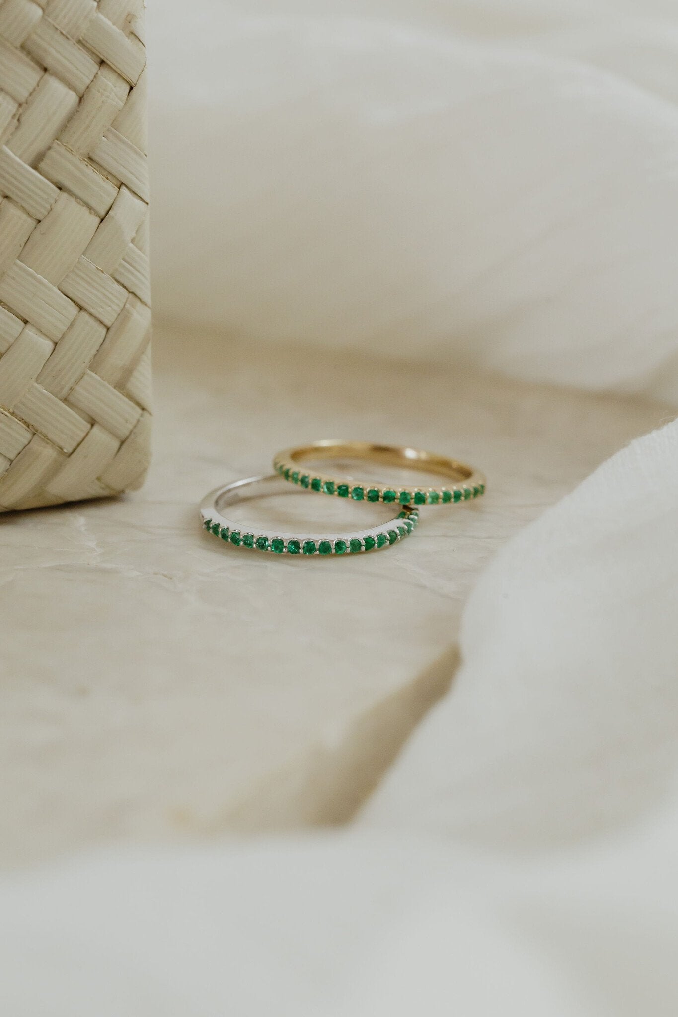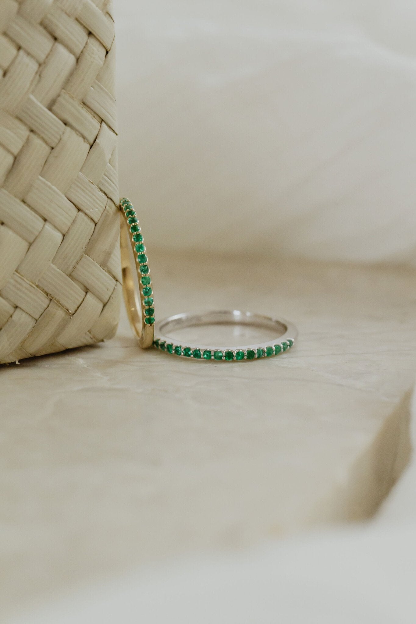 Our Jenna Emerald Band is designed to fit perfectly with our Jenna Ring, no matter the center stone shape. This 14k gold band features .15 ct round emeralds set in prongs in a single-row style.