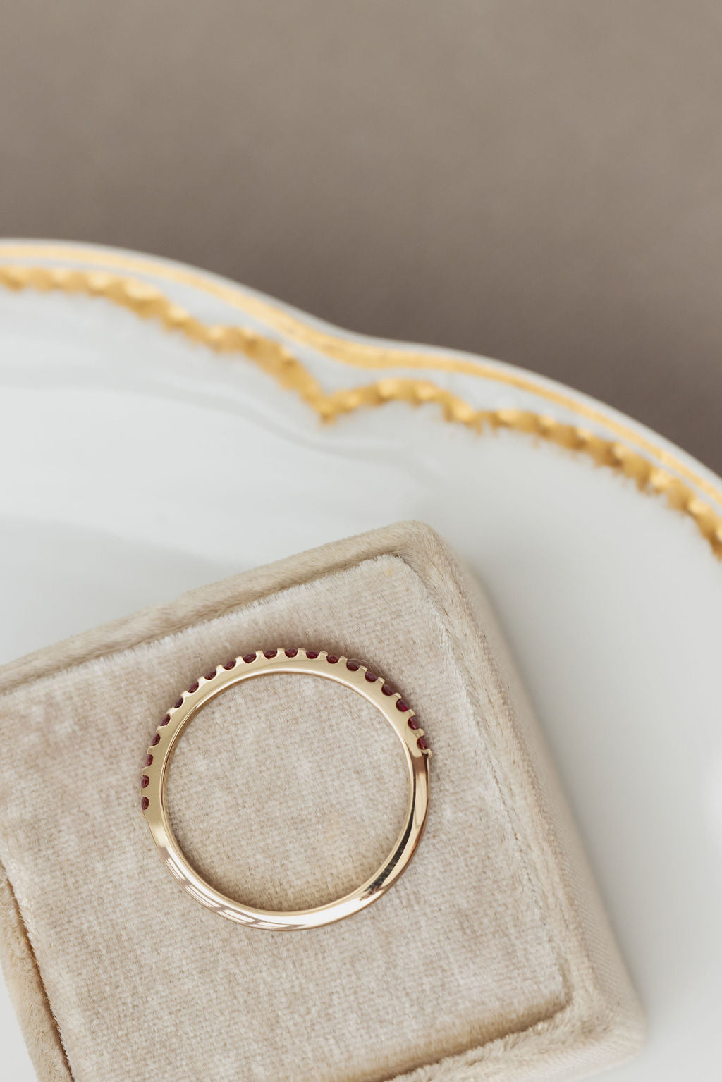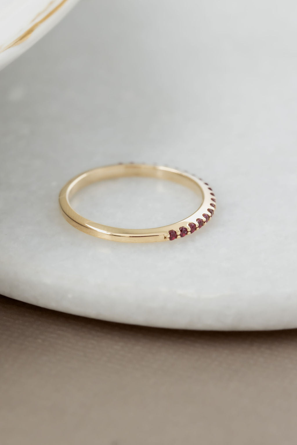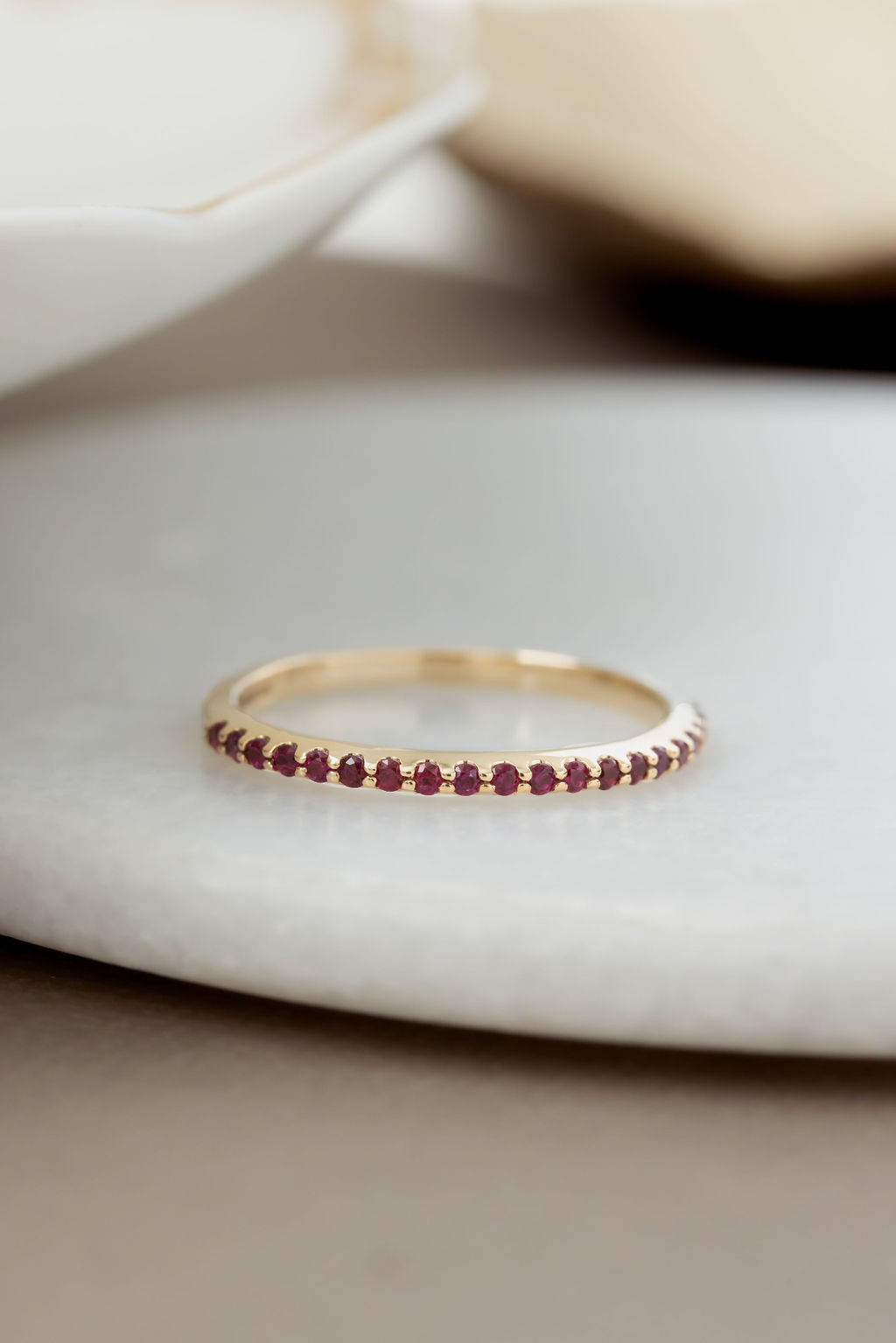 Our Jenna Ruby Band is designed to fit perfectly with our Jenna Ring, no matter the center stone shape. This 14k gold band features .20 ct round rubies set in prongs in a single-row style.