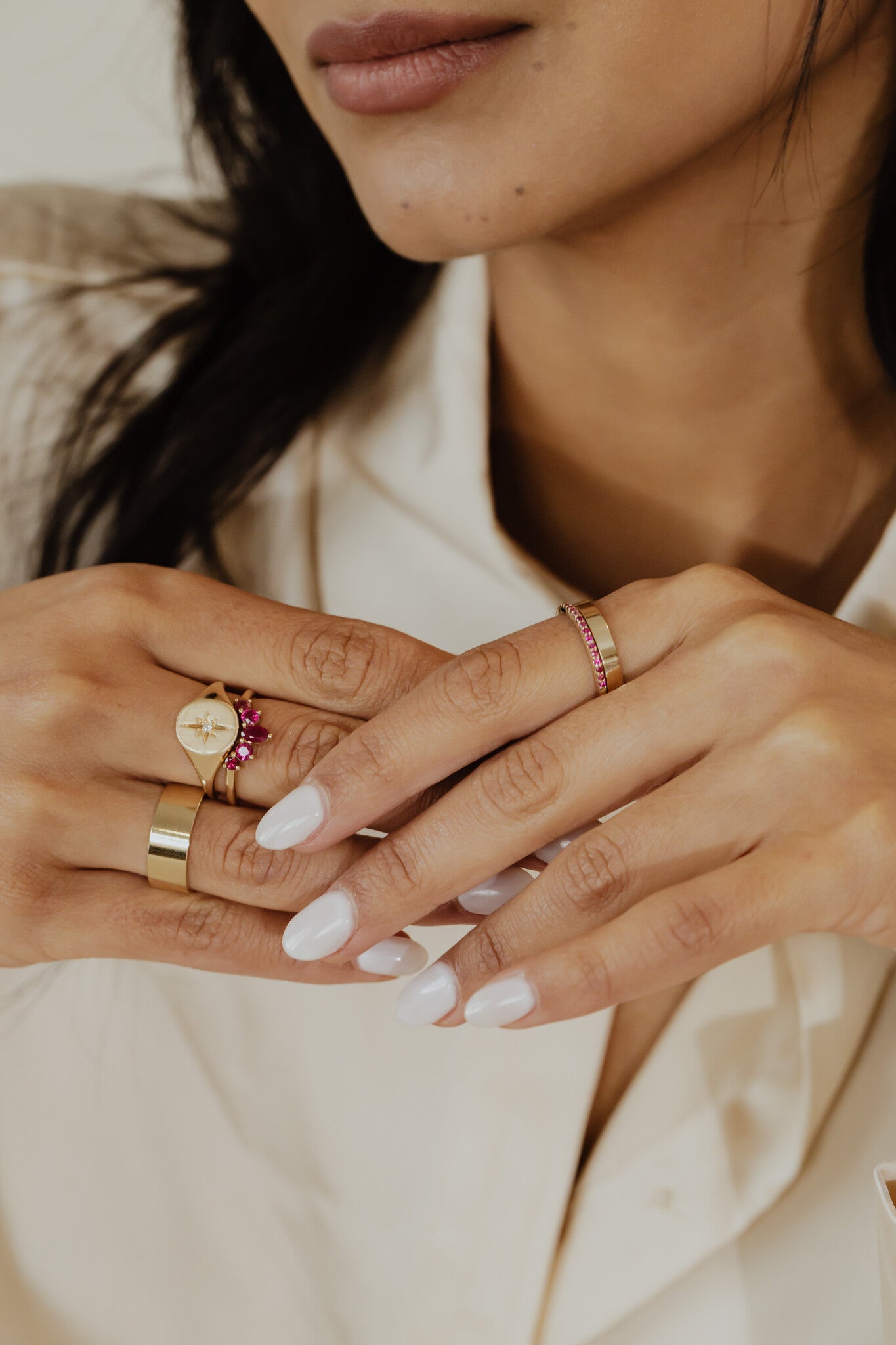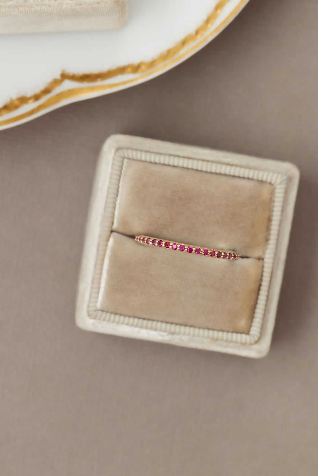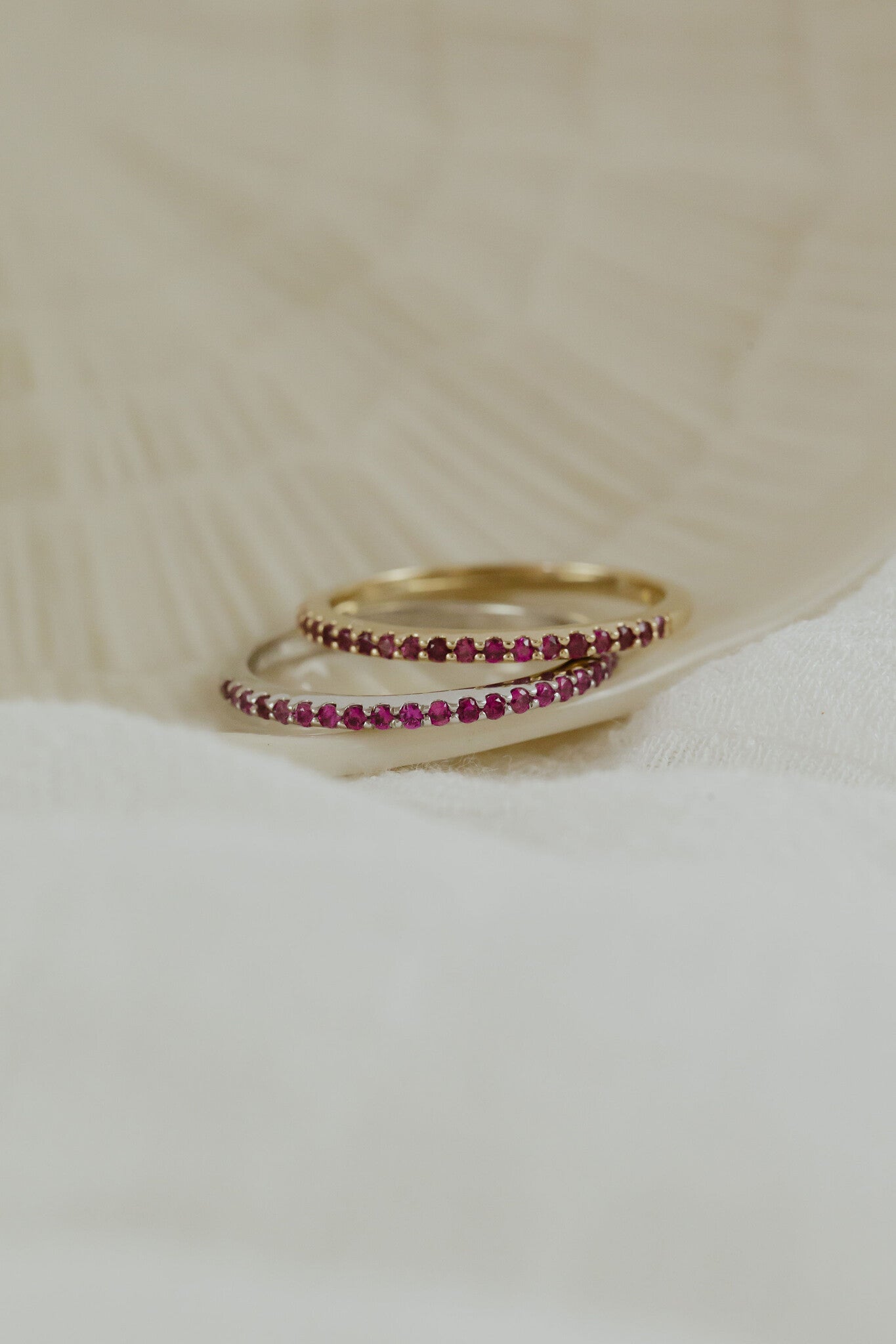 Our Jenna Ruby Band is designed to fit perfectly with our Jenna Ring, no matter the center stone shape. This 14k gold band features .20 ct round rubies set in prongs in a single-row style.