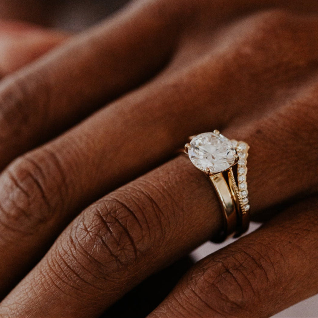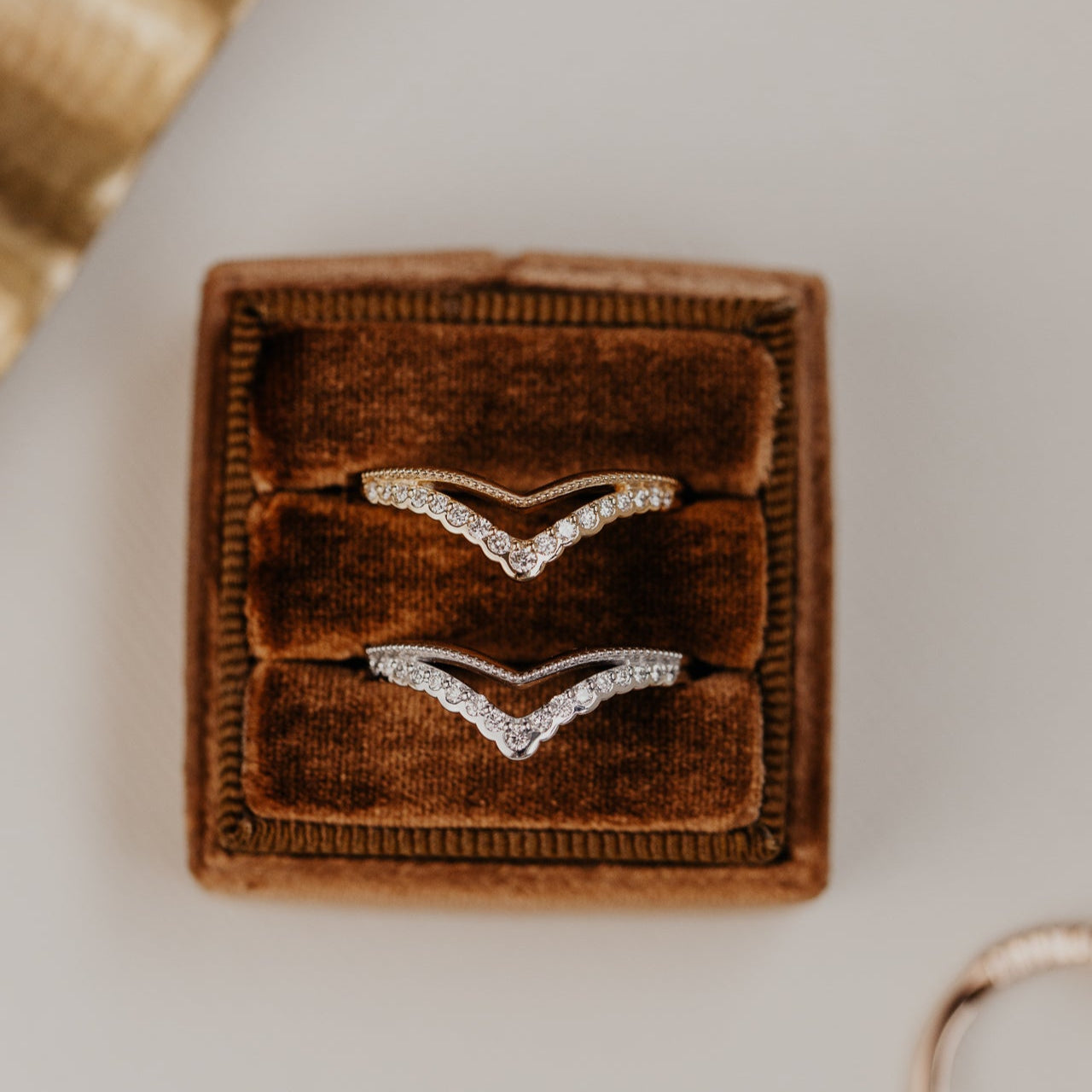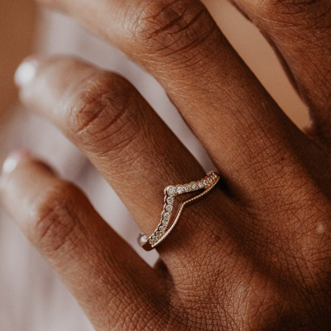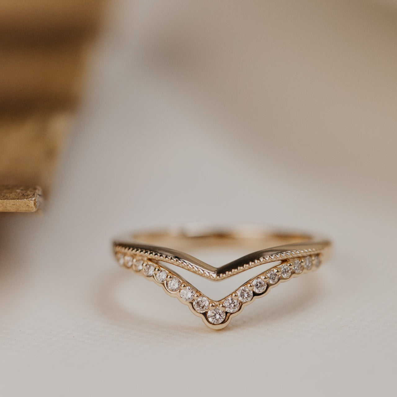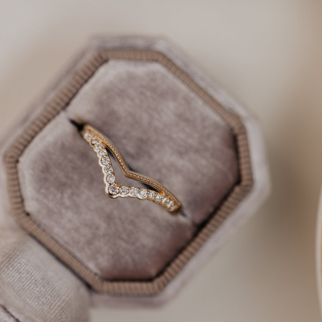 The Juniper Round Tracer Band features a milgrain v band and ~.23 cttw round diamonds set in half bezels and prongs in a v tracer style.