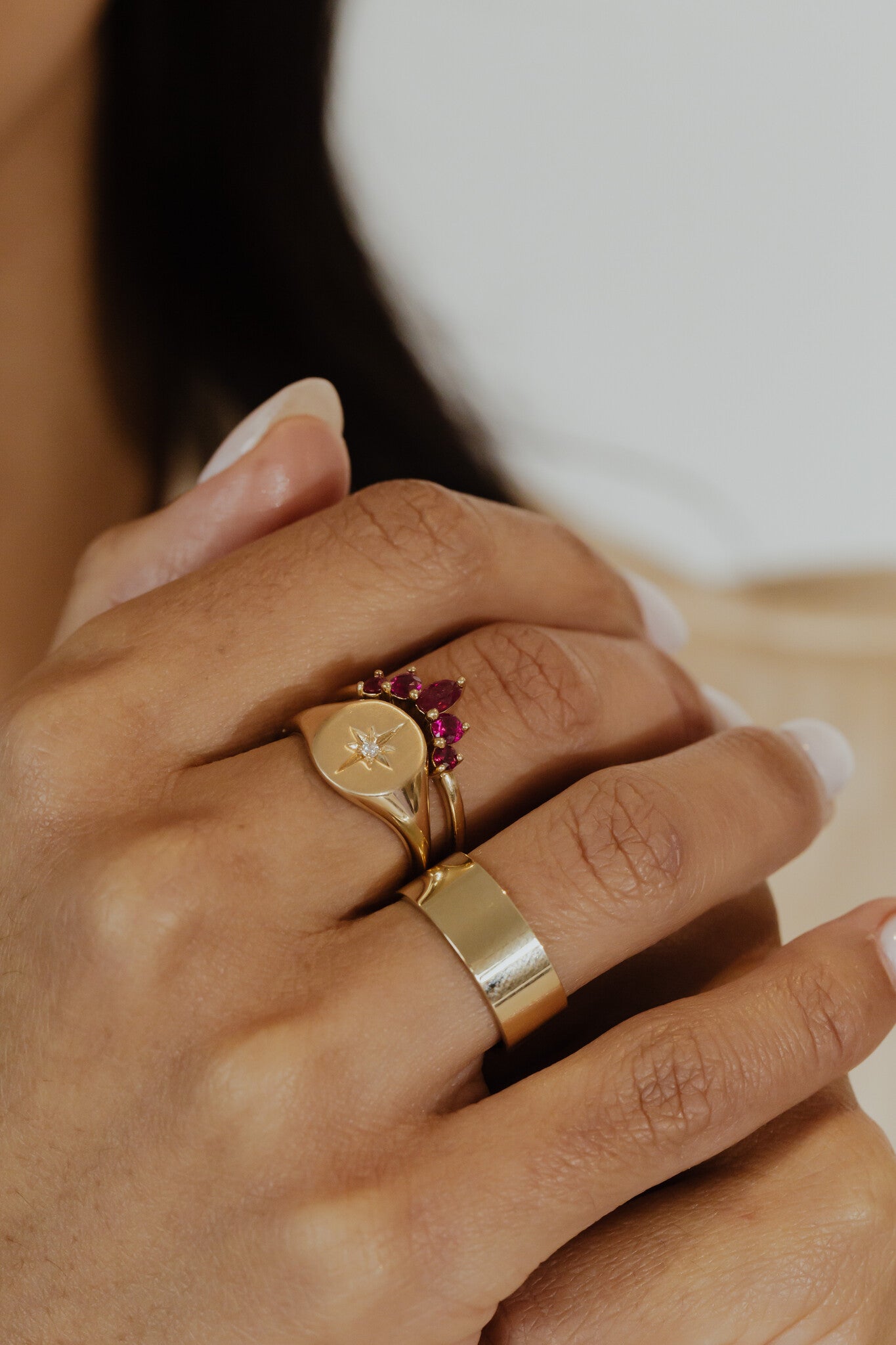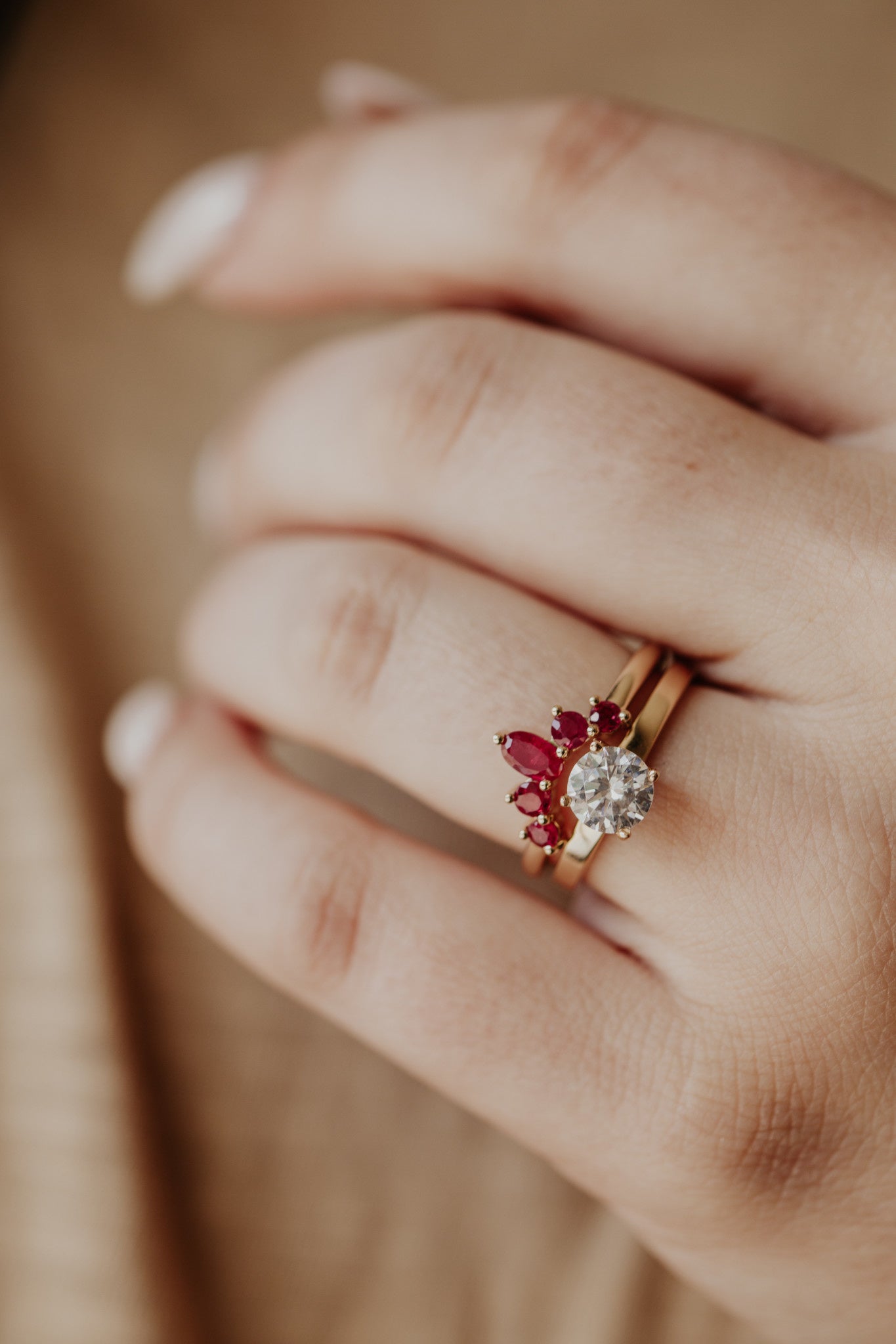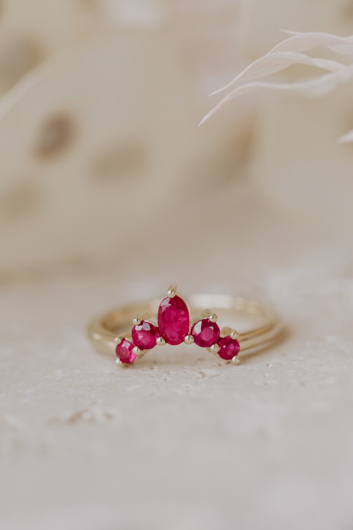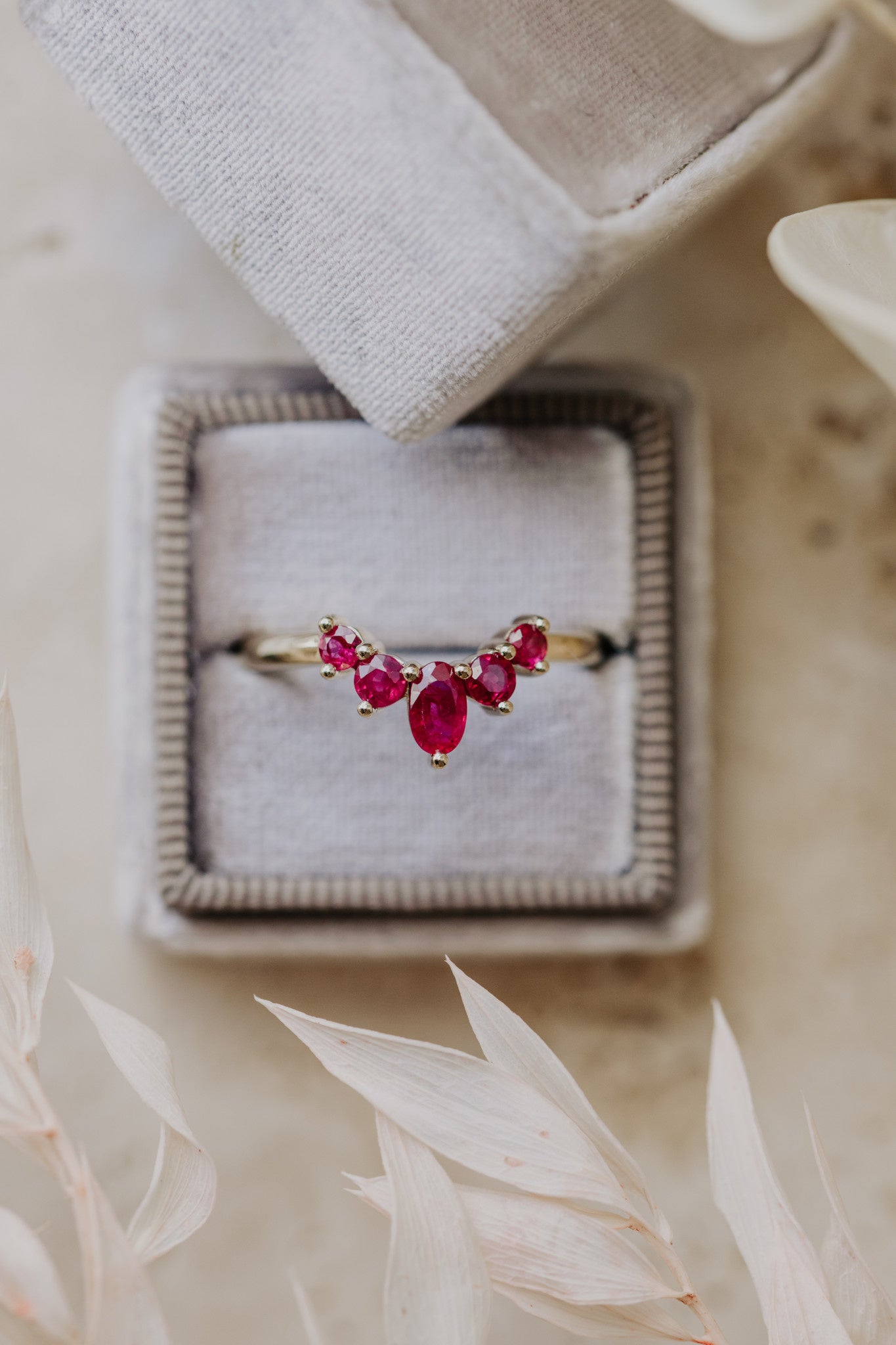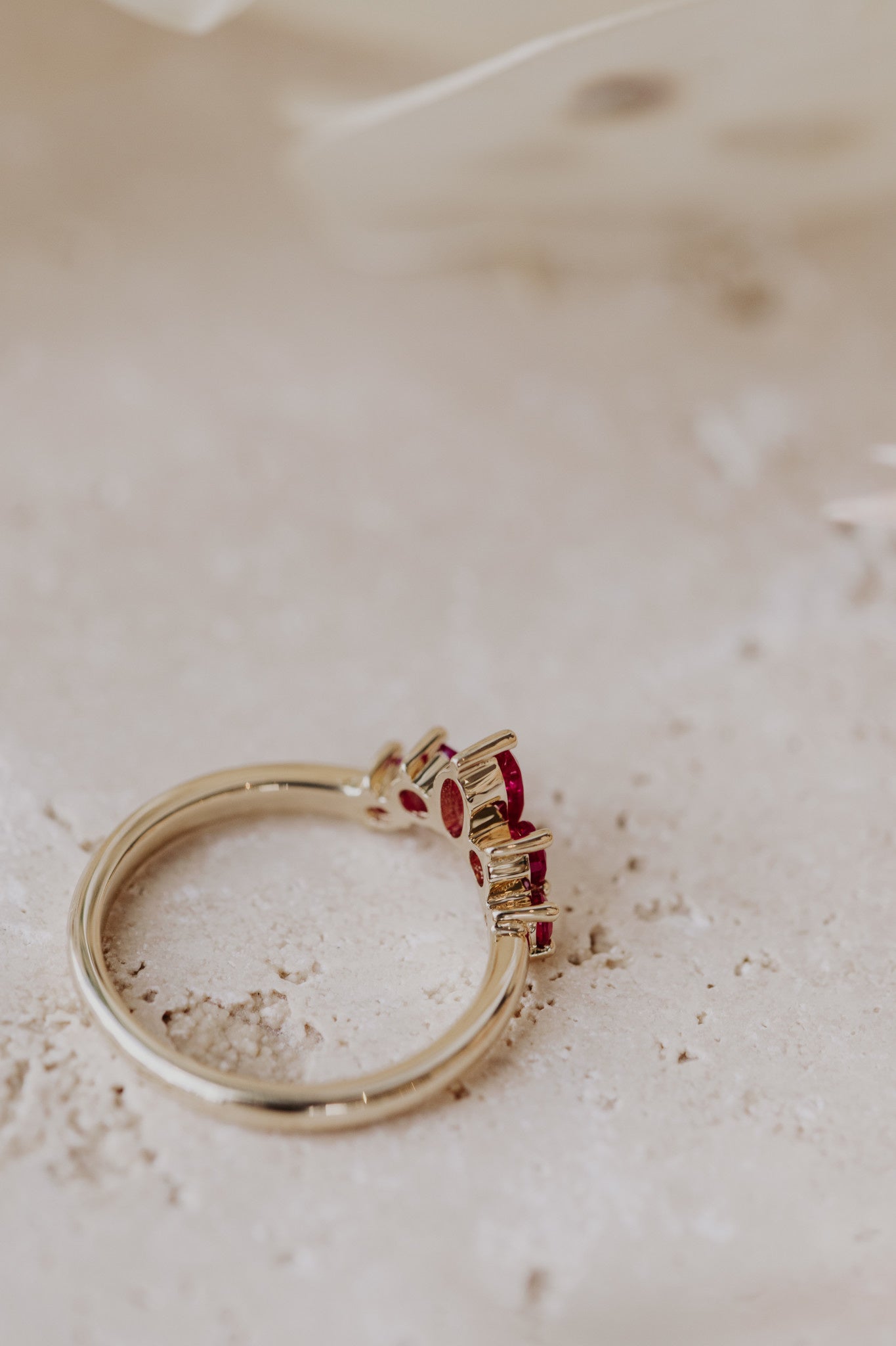 Inspired by our our love of all gemstones, this 14k gold band features .78 cts of round and oval rubies, set in prongs in a starburst design. The band design is set on a rounded band.