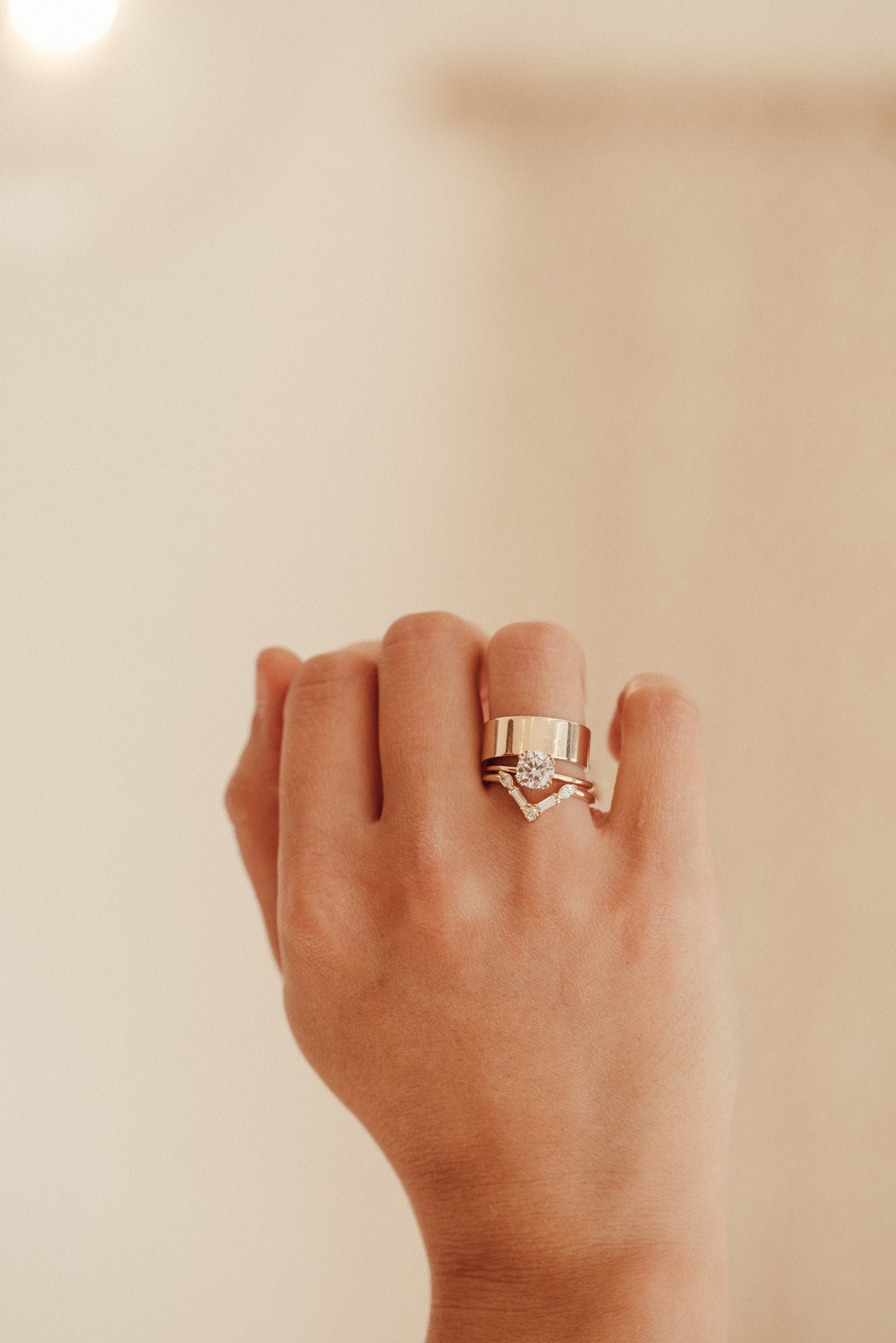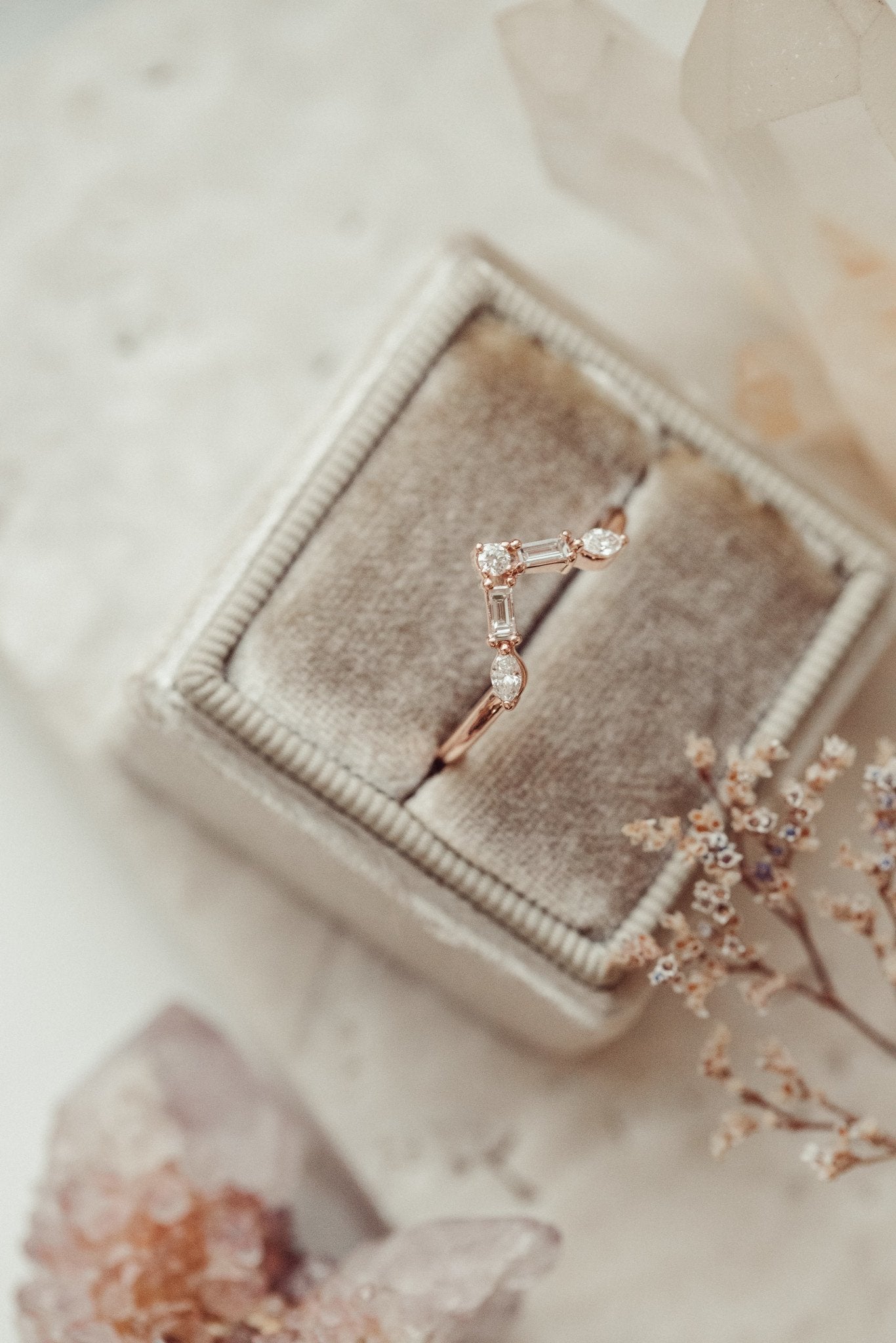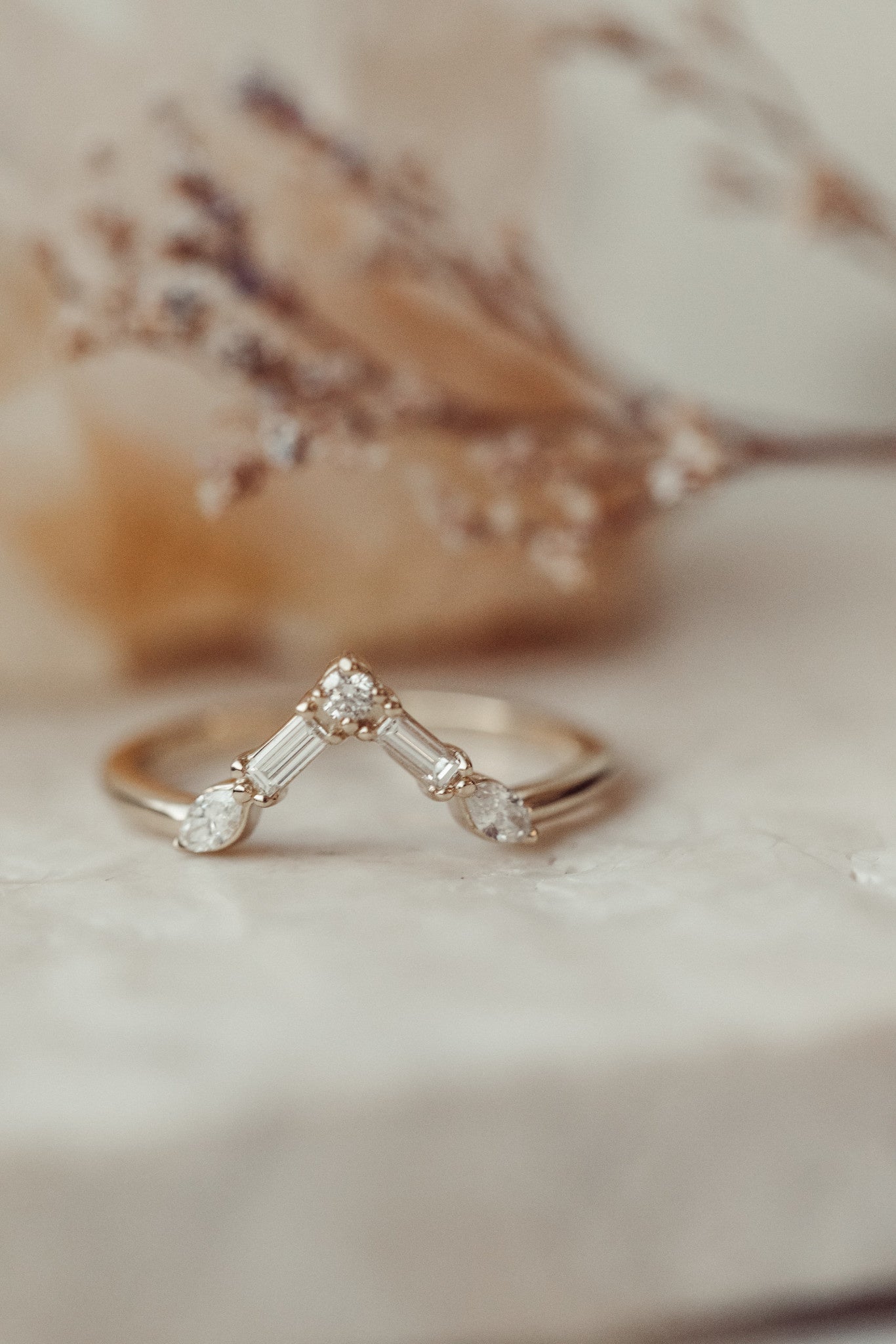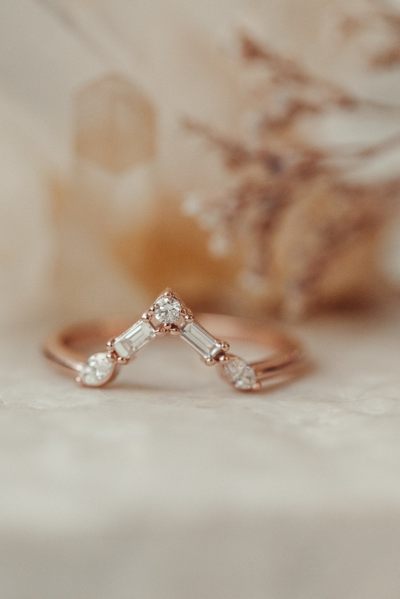 14k gold v-shaped tracer band with marquise, baguette, and round diamonds totaling .25 cts.