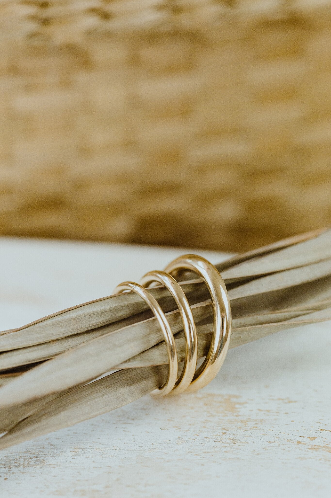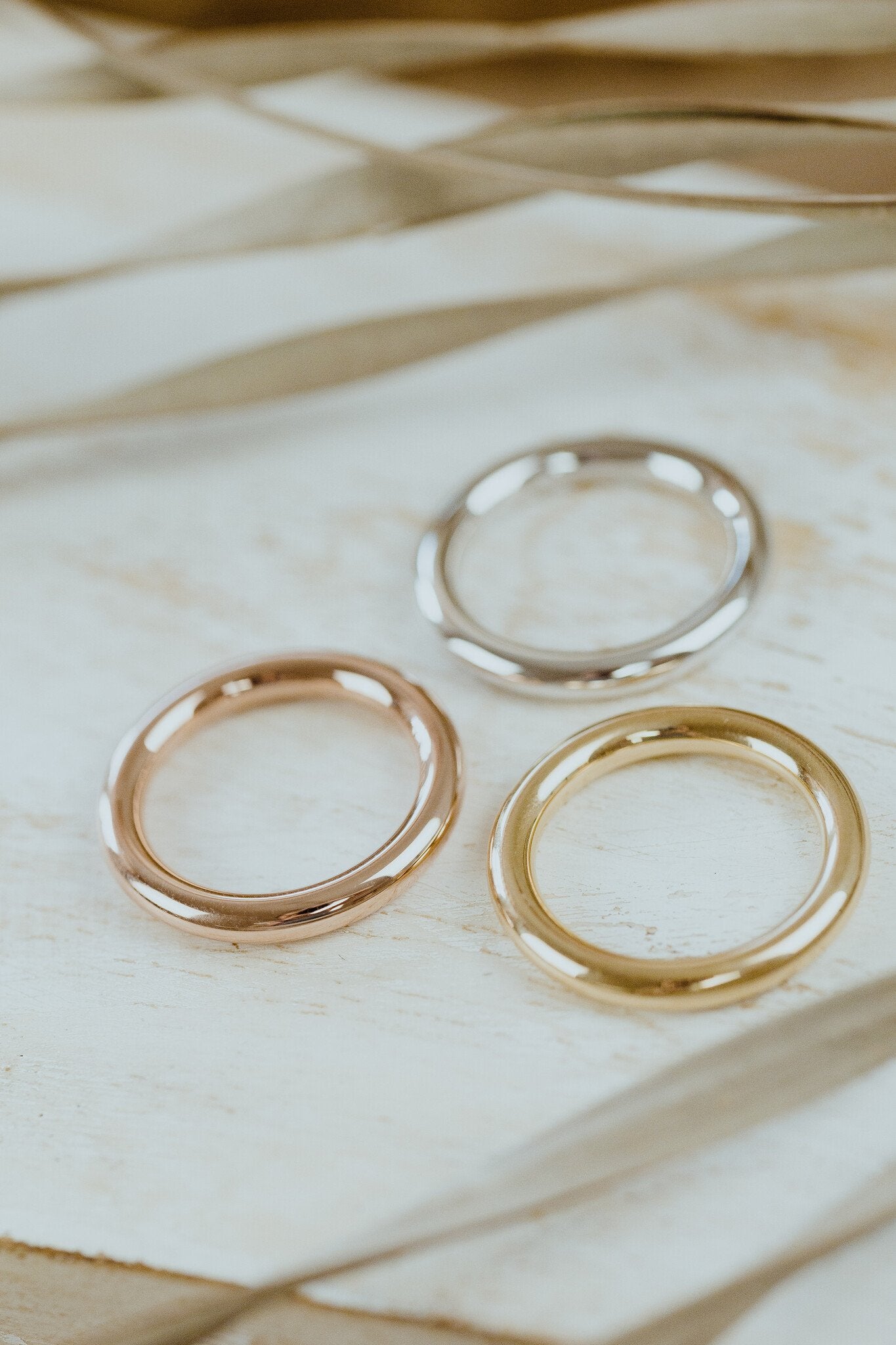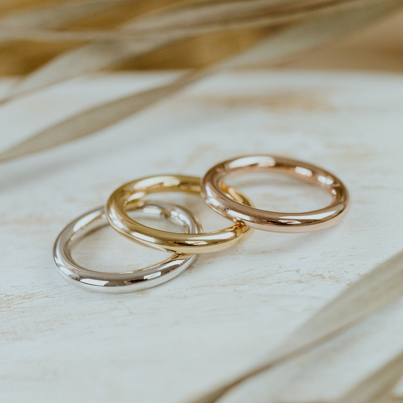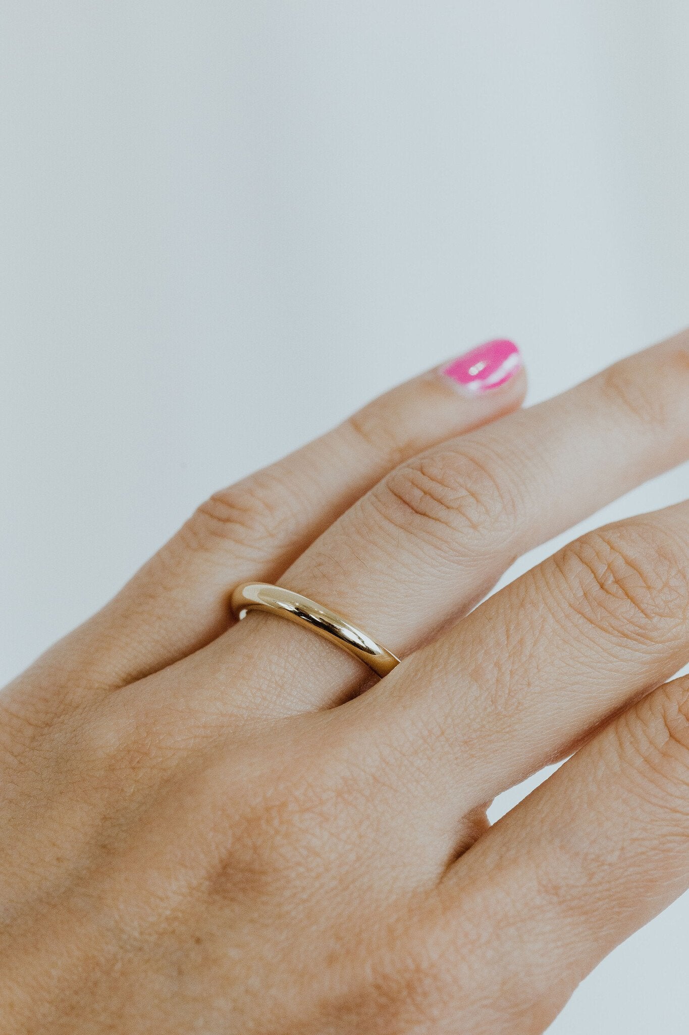 The Maeve Band features a fully rounded profile and is available in 1.5mm, 2mm, and 3mm widths, with various gold colors and finishes options.