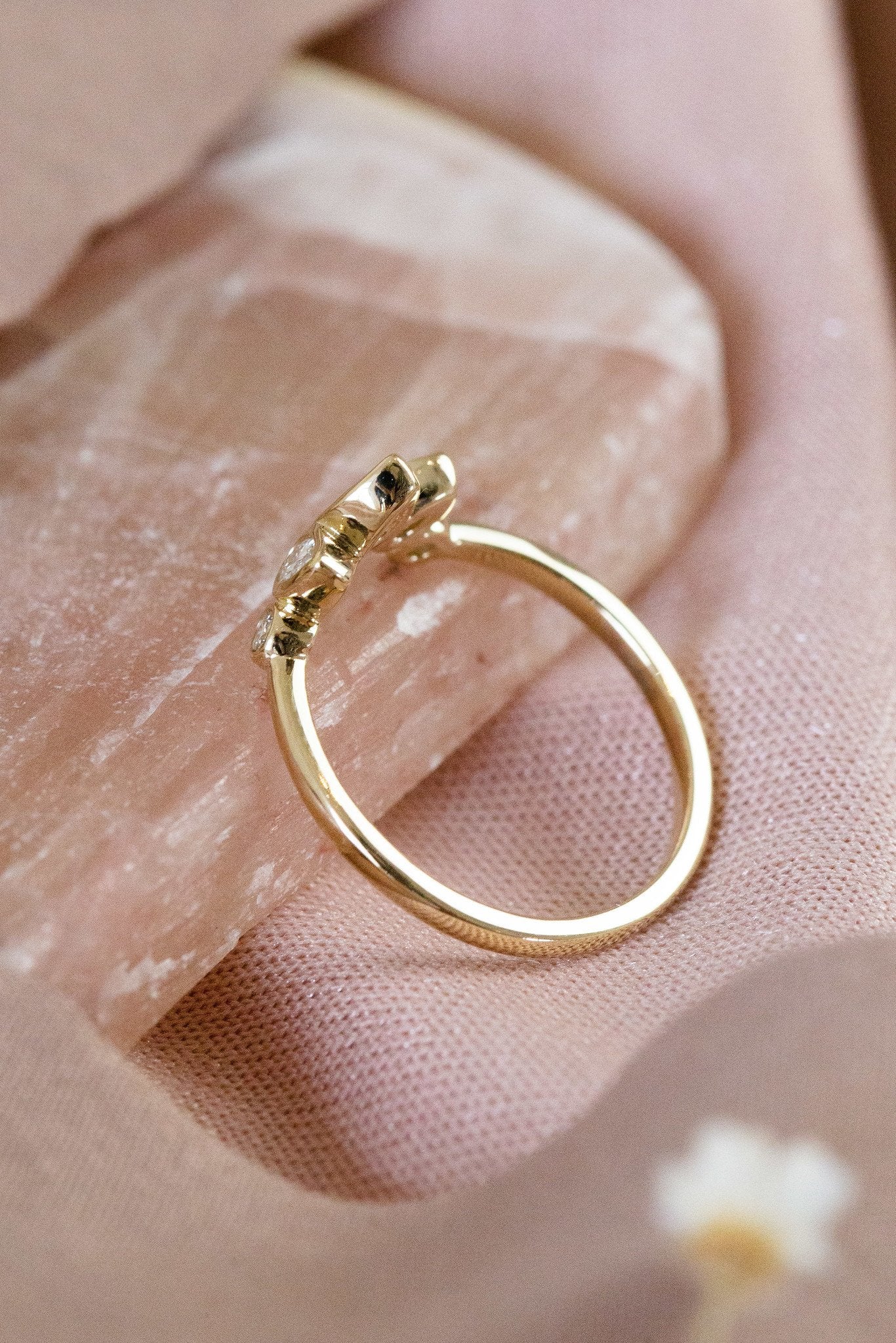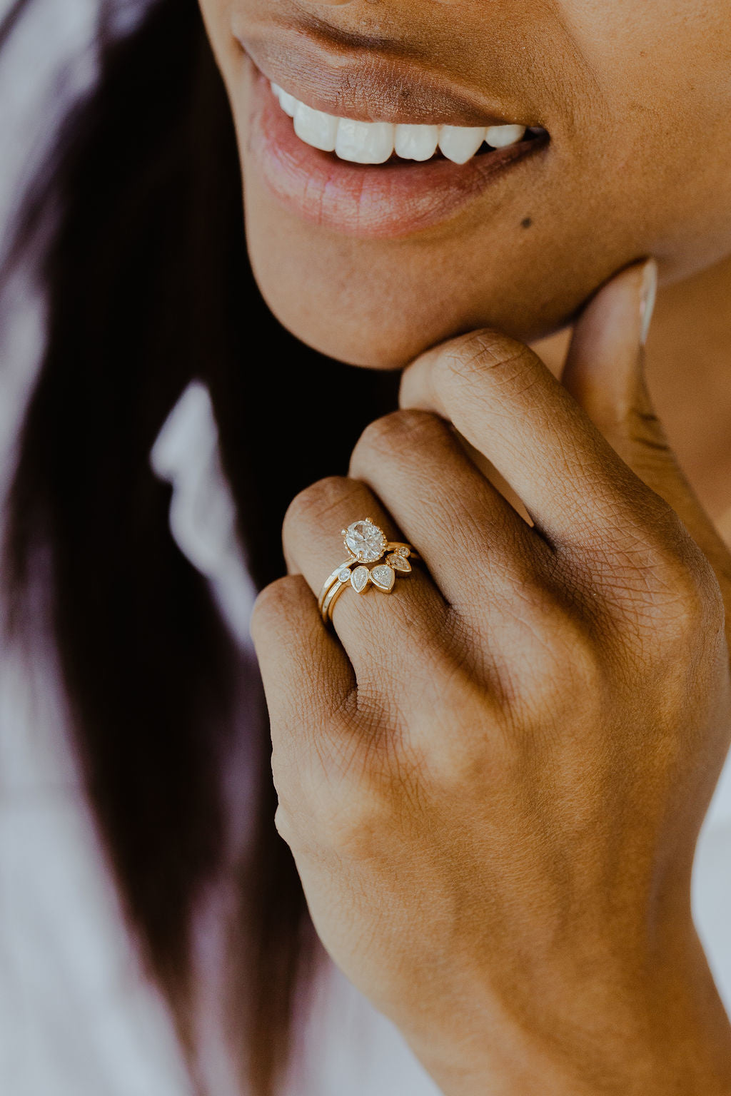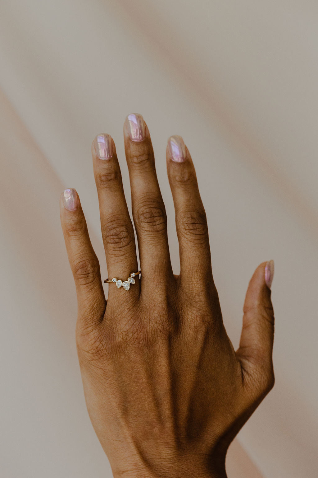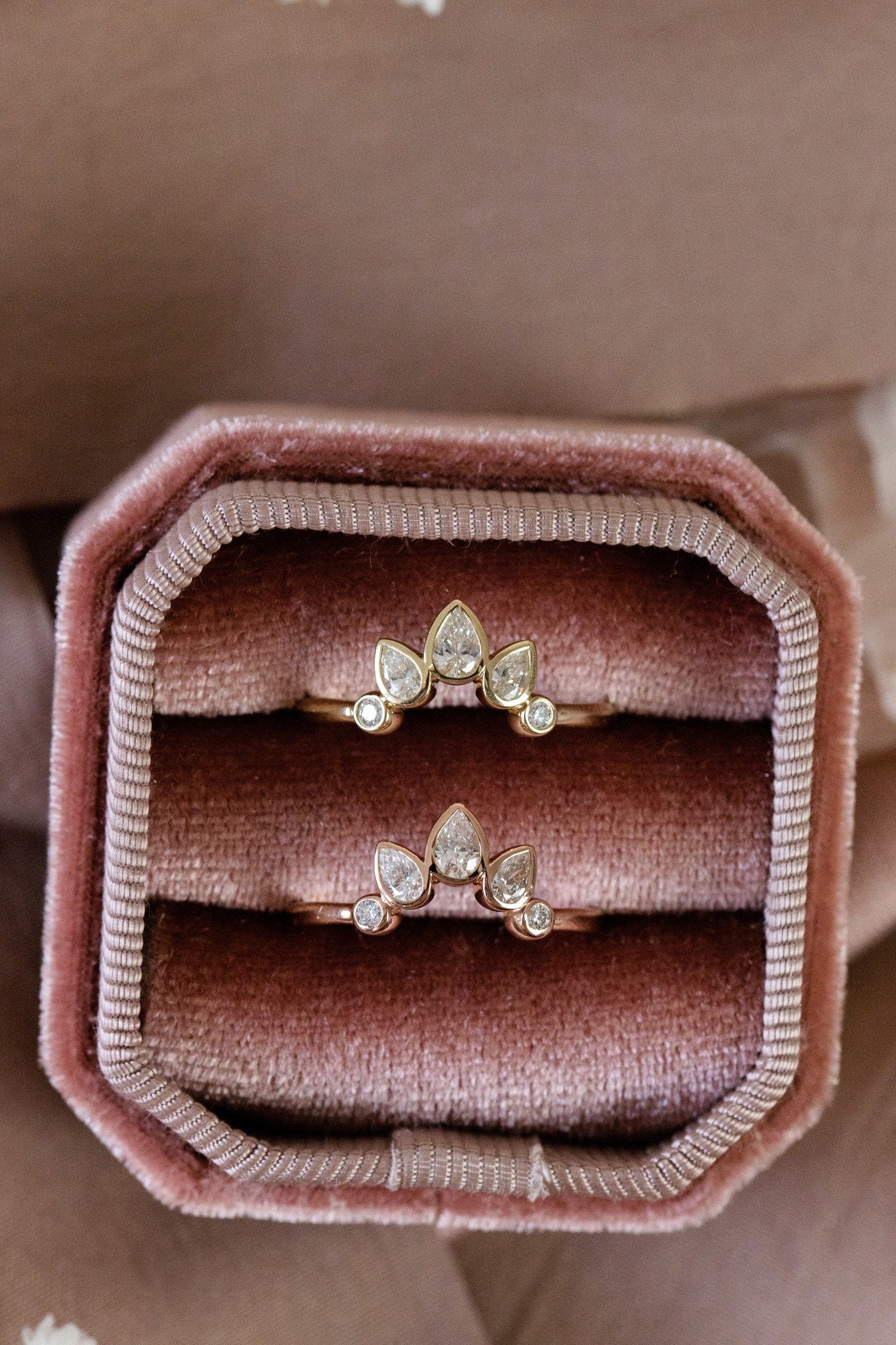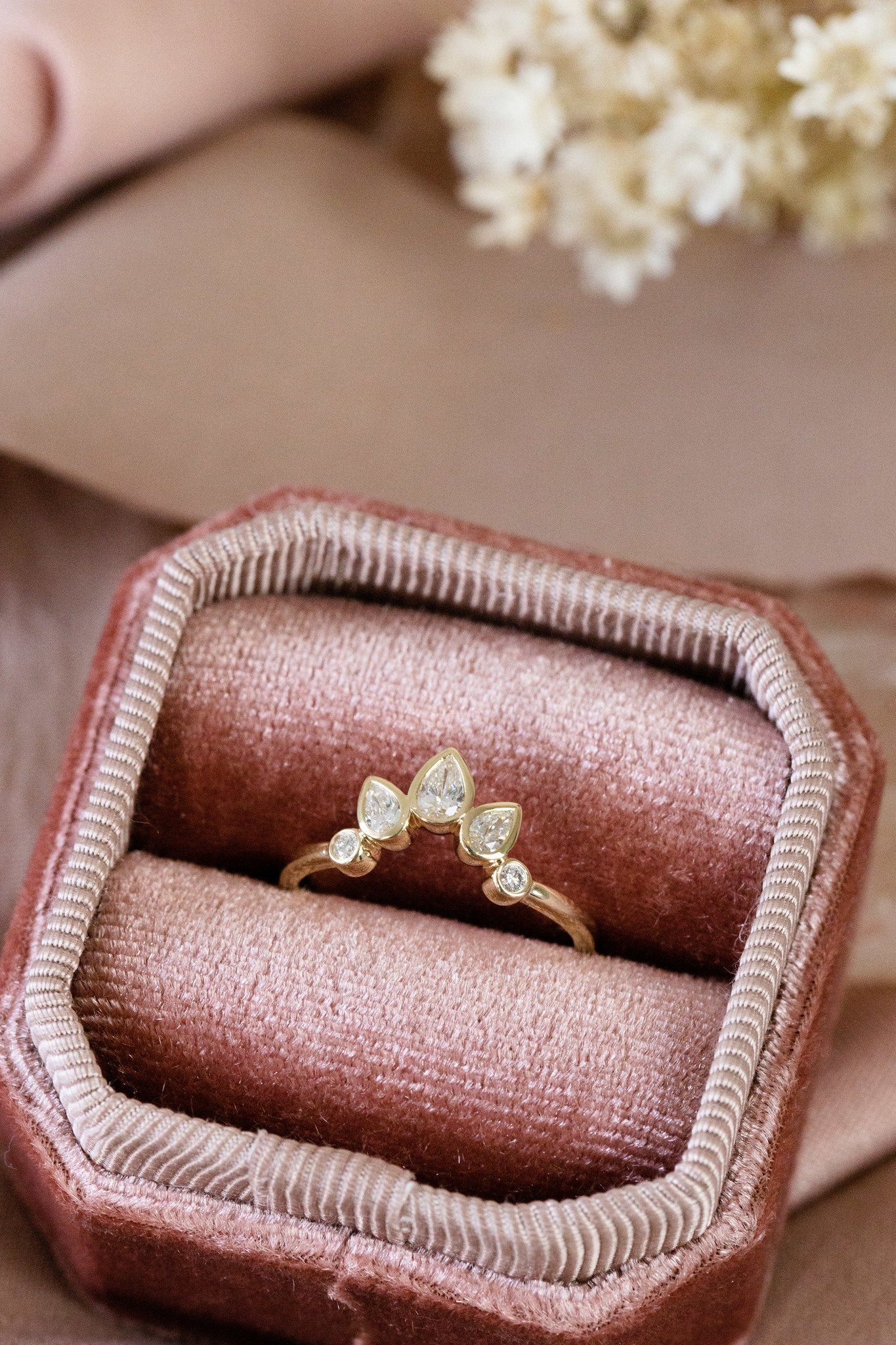 Our Meadow Diamond Band features .44 ct pear and round diamonds set in high polish bezels in a curved design. This 14k gold band design is set on a rounded band.