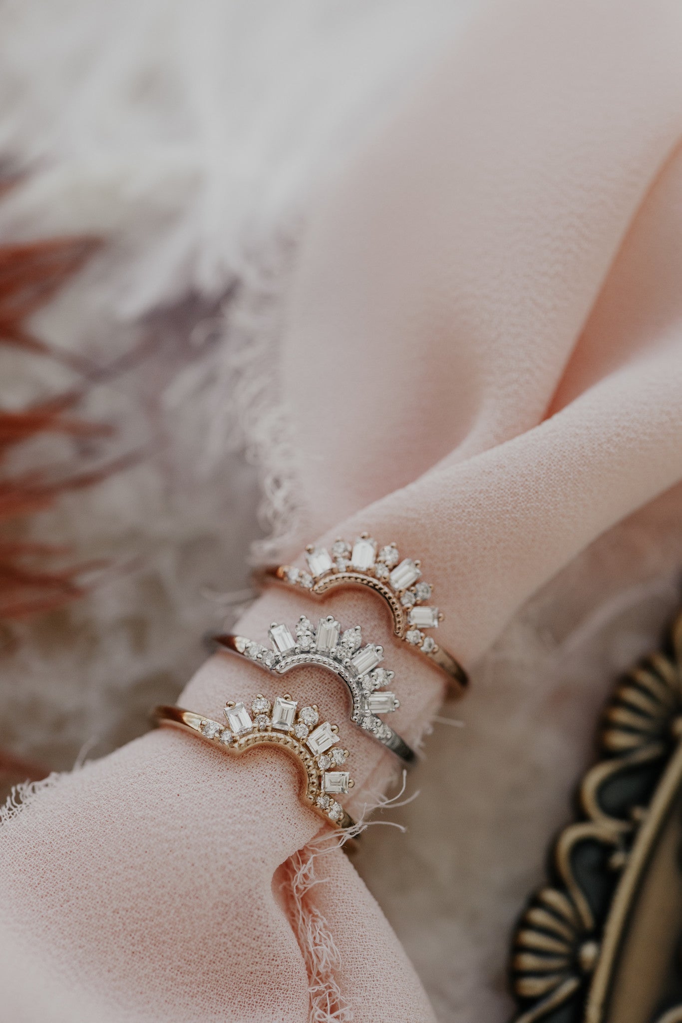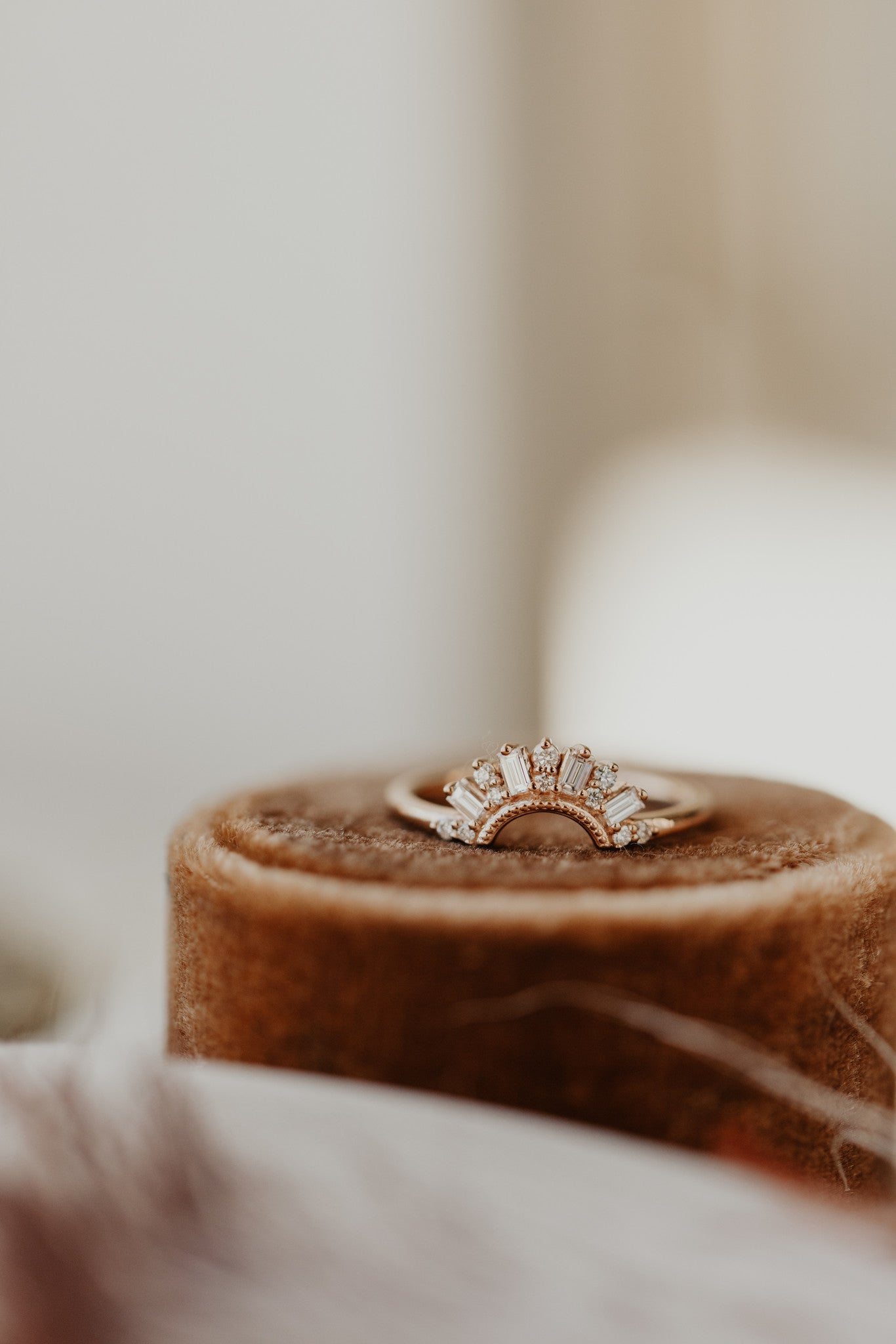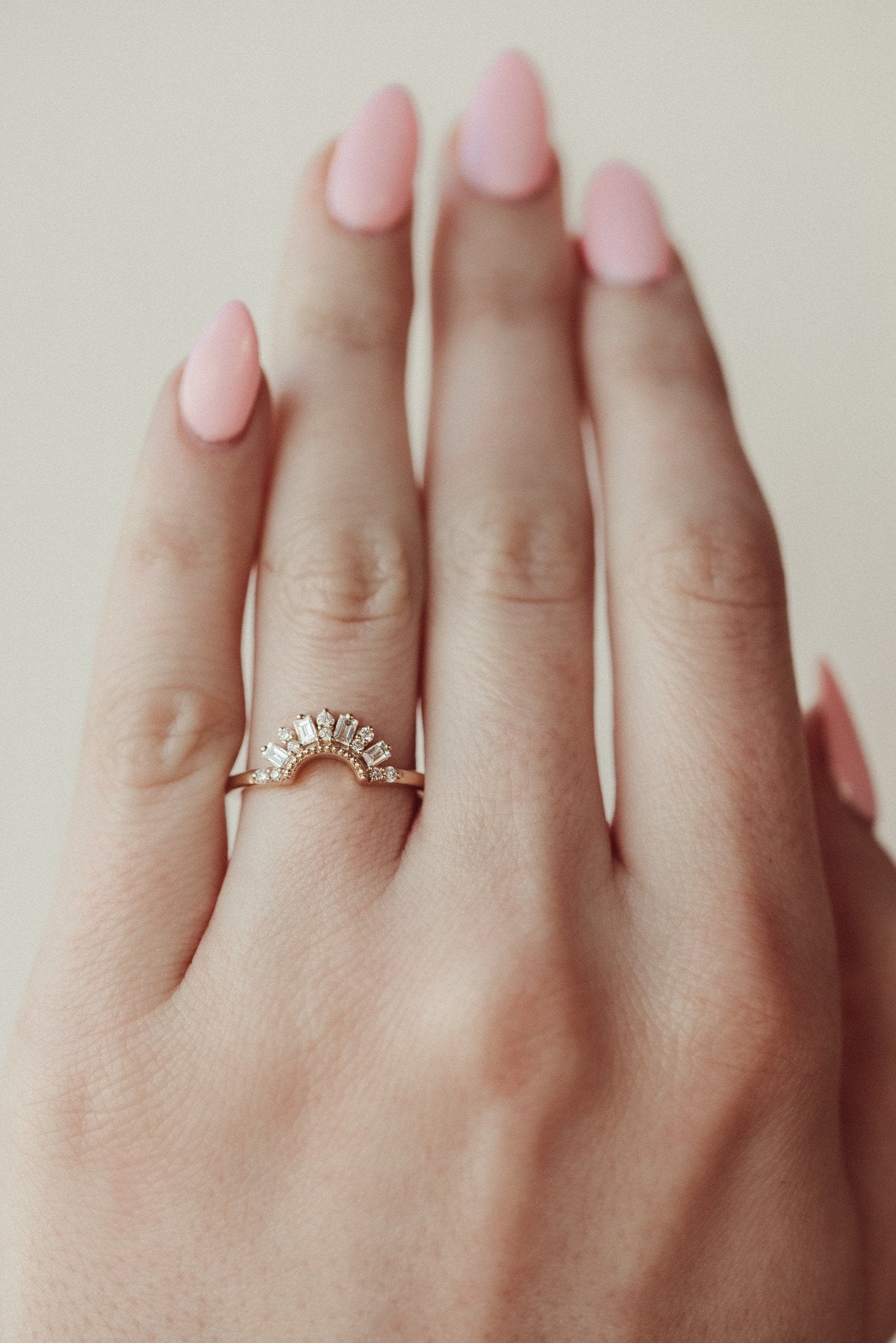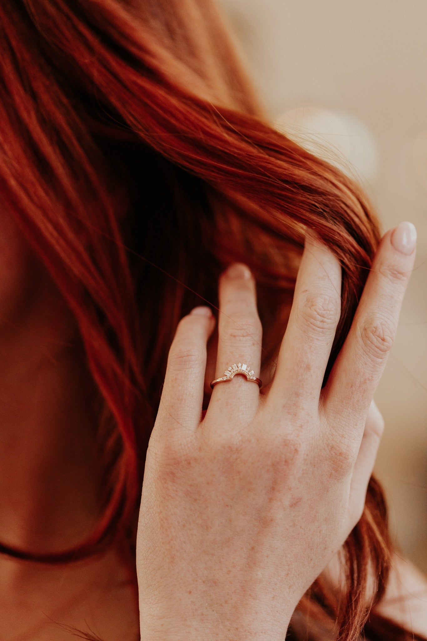 Inspired by our beloved Oxford Ring, this 14k gold band features .28 cts of double round and baguette diamonds set in prongs in a curved tracer band style with milgrain details.