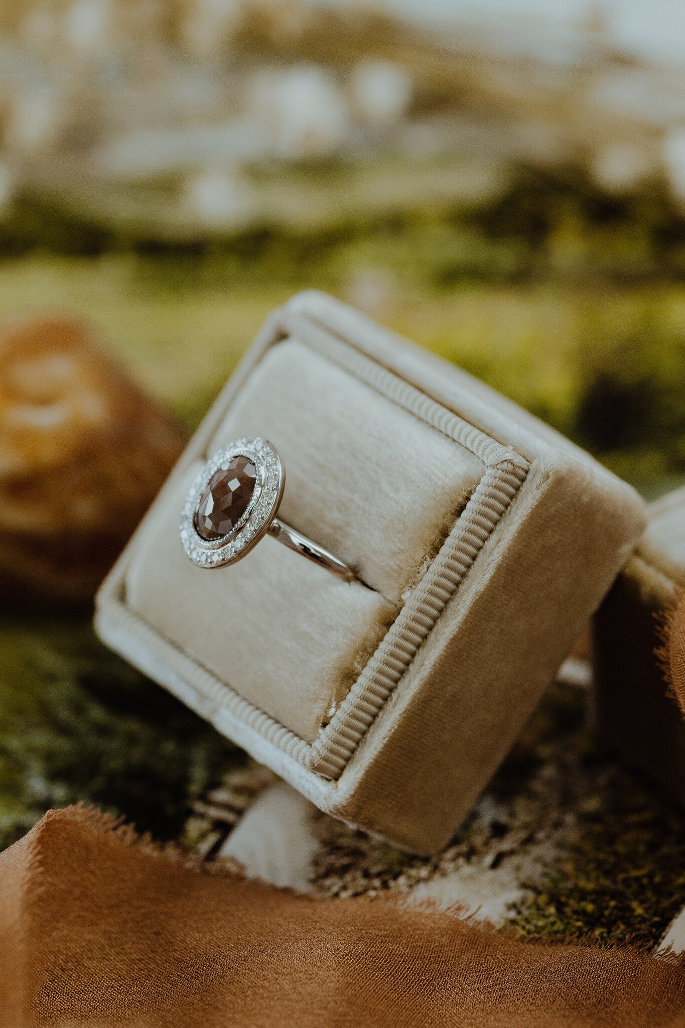 This 14k white gold ring features a one-of-a-kind 1.72 ct oval reddish-brown, rose cut rustic diamond set in a milgrain bezel, surrounded by a .15 ct diamond halo with a high polish band.