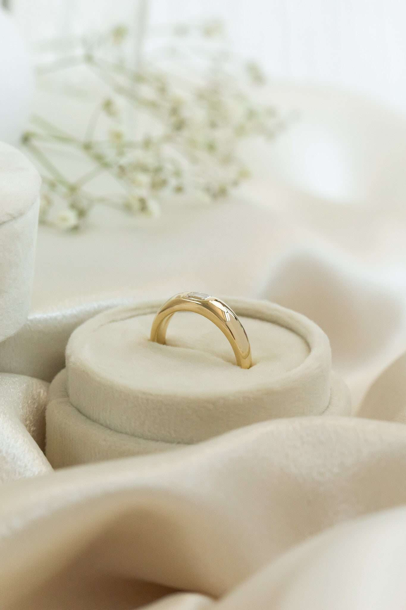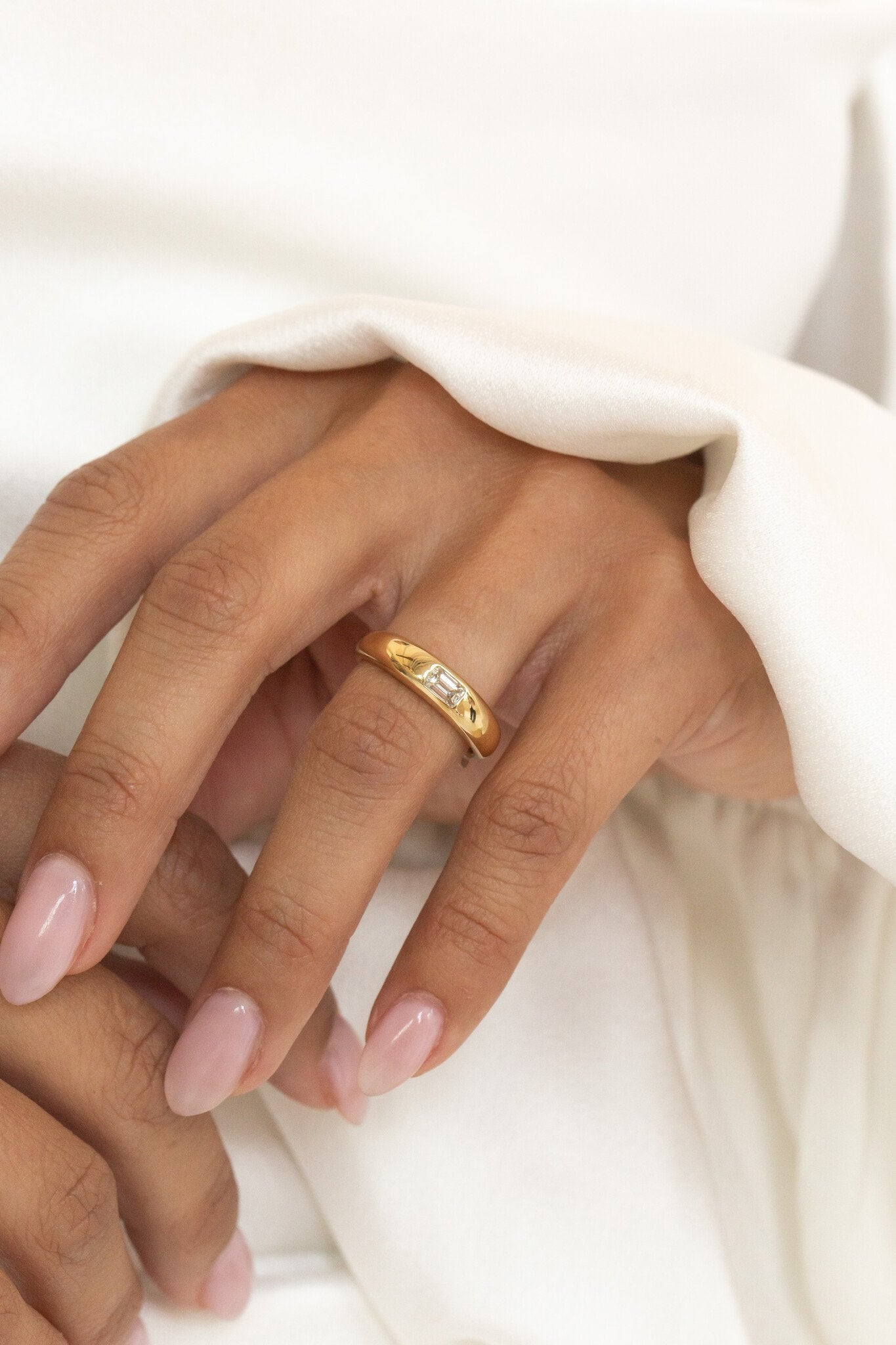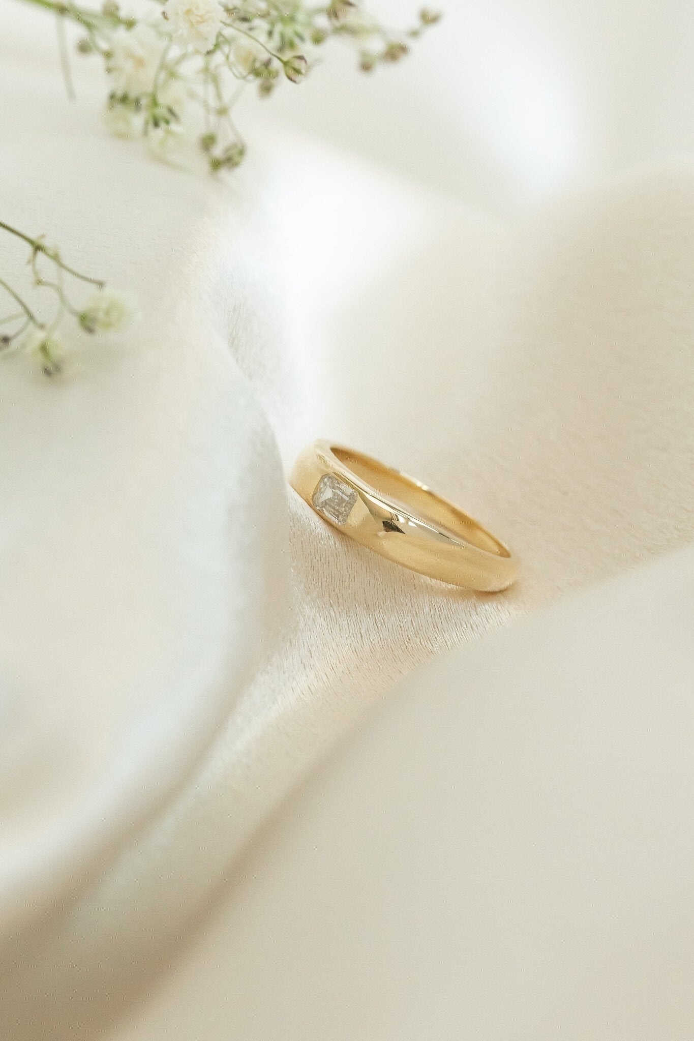 The Sutton Hammer Set Band features a .37 ct emerald cut diamond hammer set in a 5mm rounded tapered band.