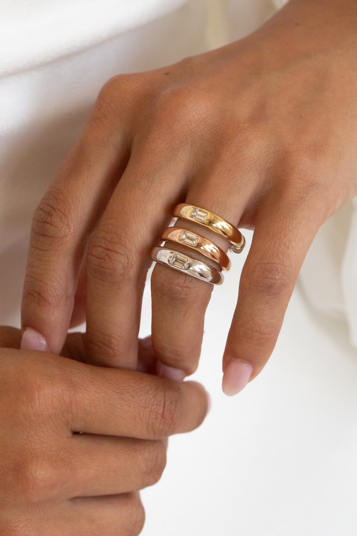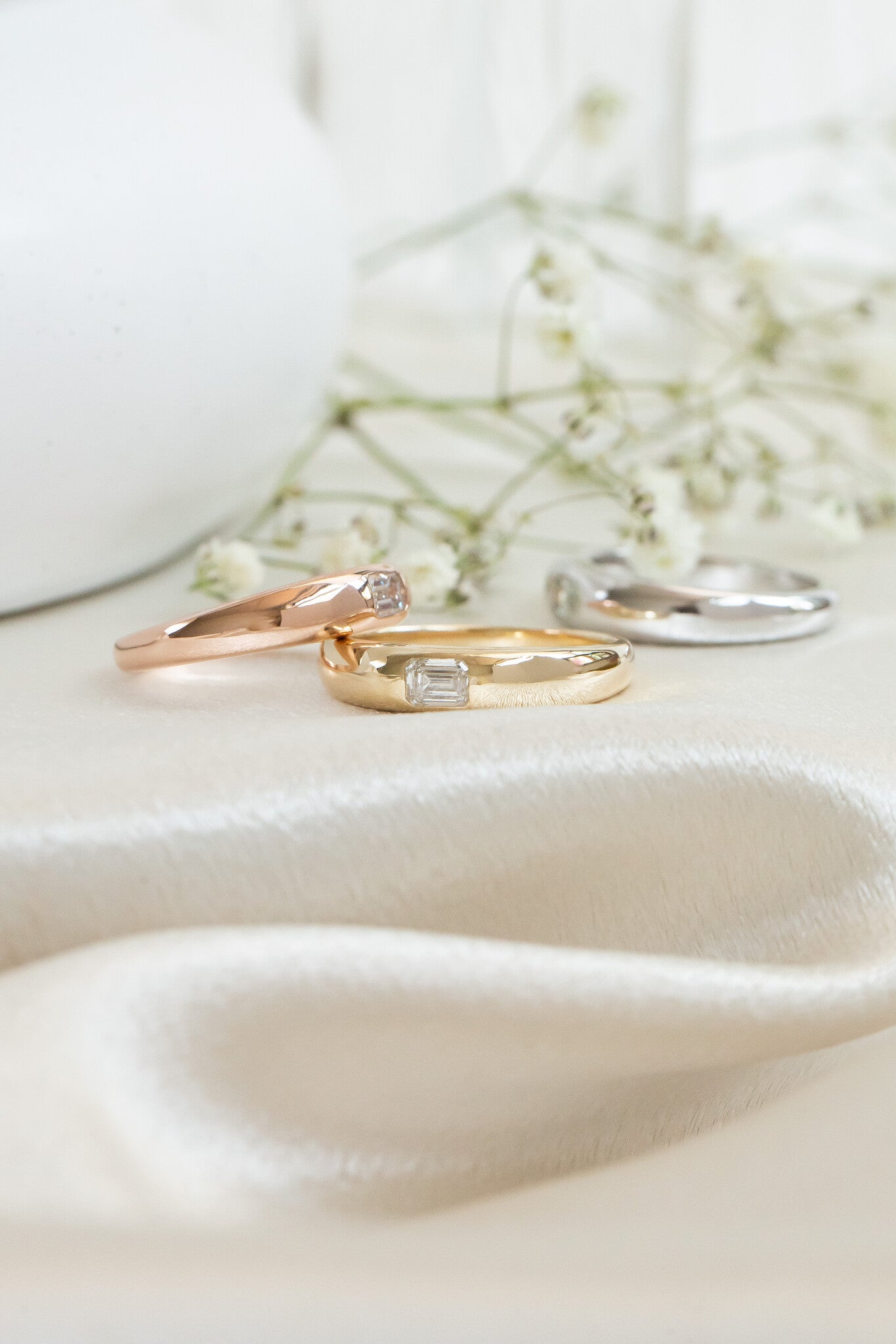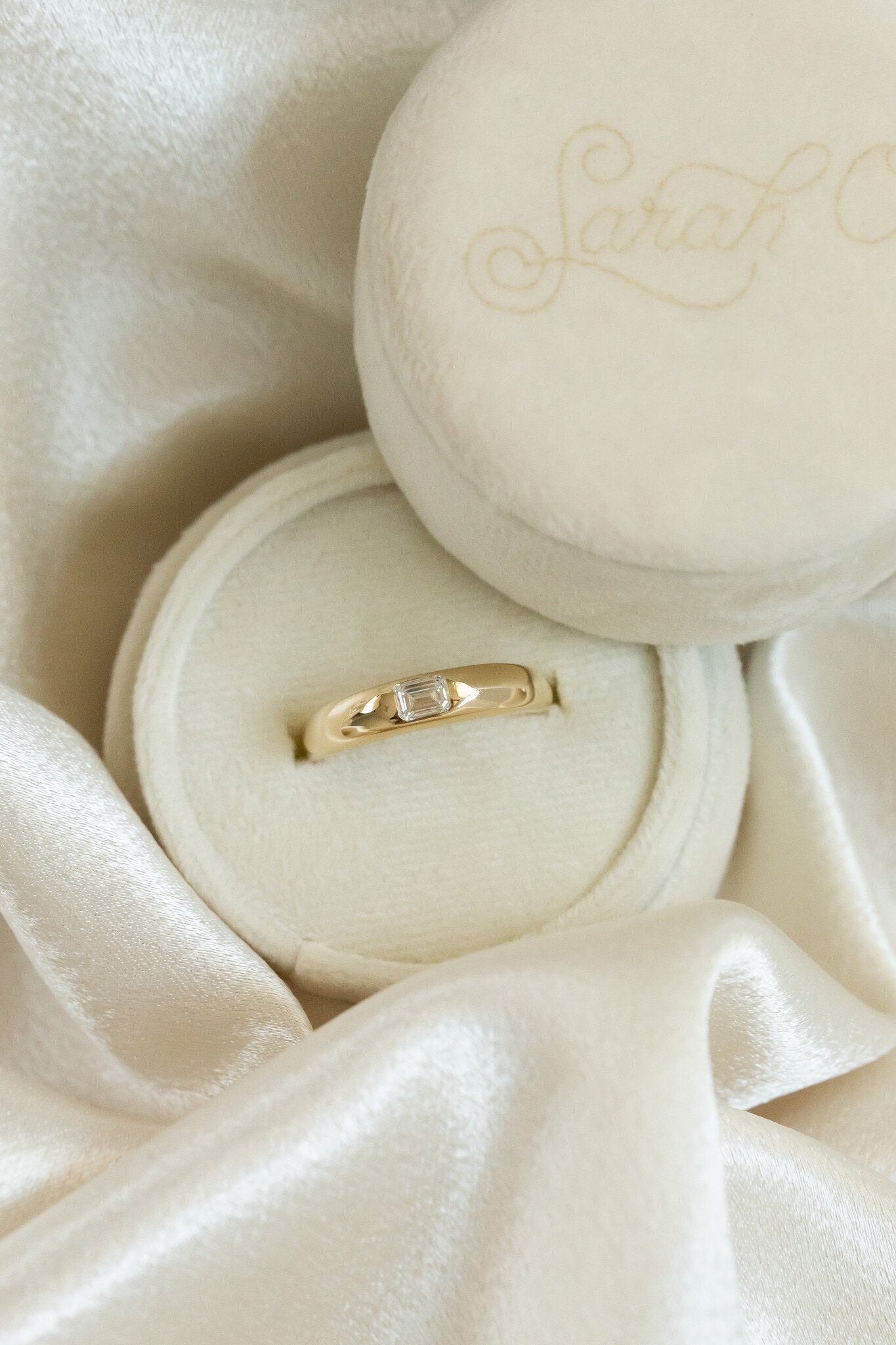 The Sutton Hammer Set Band features a .37 ct emerald cut diamond hammer set in a 5mm rounded tapered band.