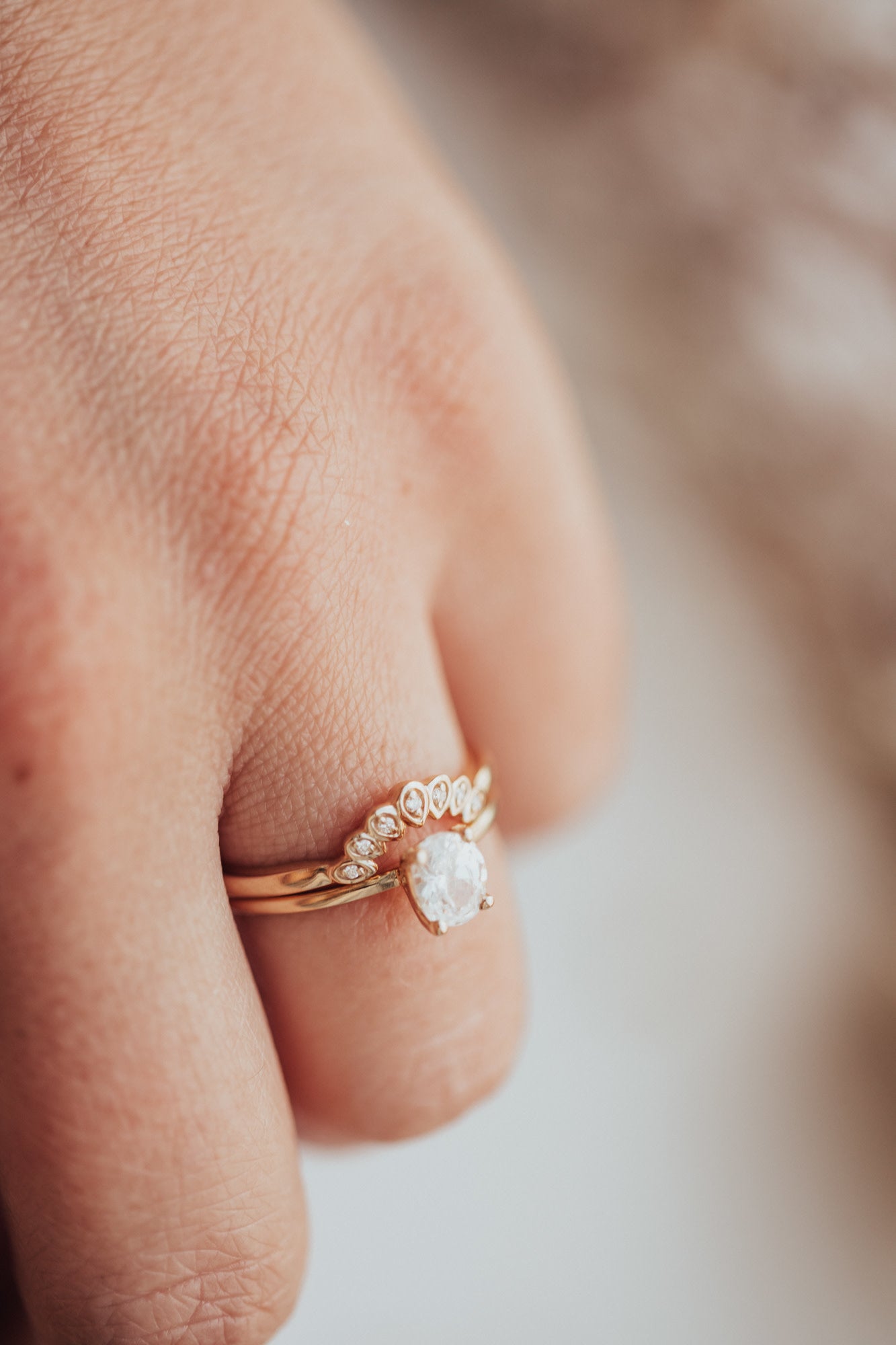 14k gold tracer band with .025 ct round diamonds set in prongs in pear-shaped metal designs with a curved shape.
