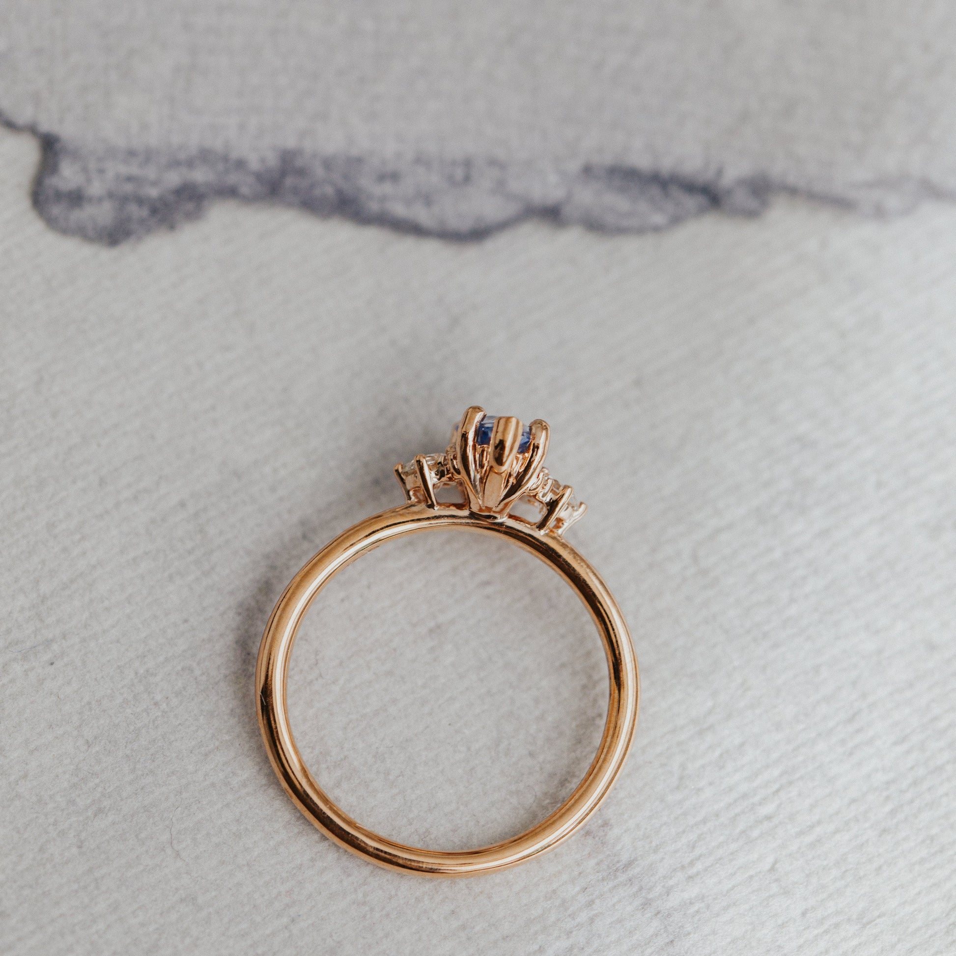 This 14k rose gold ring features a one-of-a-kind 1.07 ct marquise light blue sapphire with .23 cttw natural diamond side stones.